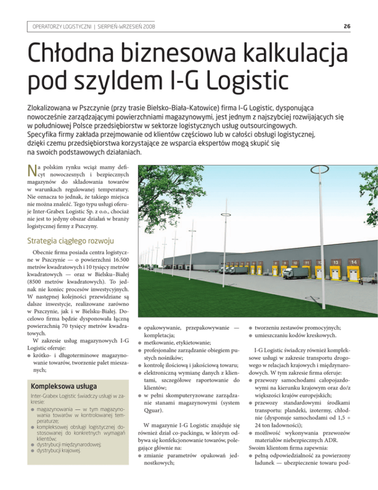 26 OPERATORZY LOGISTYCZNI | SIERPIEŃ-WRZESIEŃ 2008 Chłodna biznesowa kalkulacja pod szyldem I-G Logistic Zlokalizowana w Pszczynie (przy trasie Bielsko–Biała–Katowice) firma I–G Logistic, dysponująca nowocześnie zarządzającymi powierzchniami magazynowymi, jest jednym z najszybciej rozwijających się w południowej Polsce przedsiębiorstw w sektorze logistycznych usług outsourcingowych. Specyfika firmy zakłada przejmowanie od klientów częściowo lub w całości obsługi logistycznej, dzięki czemu przedsiębiorstwa korzystające ze wsparcia ekspertów mogą skupić się na swoich podstawowych działaniach. N a polskim rynku wciąż mamy deficyt nowoczesnych i bezpiecznych magazynów do składowania towarów w warunkach regulowanej temperatury. Nie oznacza to jednak, że takiego miejsca nie można znaleźć. Tego typu usługi oferuje Inter-Grabex Logistic Sp. z o.o., chociaż nie jest to jedyny obszar działań w branży logistycznej firmy z Pszczyny. Strategia ciągłego rozwoju Obecnie firma posiada centra logistyczne w Pszczynie — o powierzchni 16.500 metrów kwadratowych i 10 tysięcy metrów kwadratowych — oraz w Bielsku–Białej (8500 metrów kwadratowych). To jednak nie koniec procesów inwestycyjnych. W następnej kolejności przewidziane są dalsze inwestycje, realizowane zarówno w Pszczynie, jak i w Bielsku-Białej. Docelowo firma będzie dysponowała łączną powierzchnią 70 tysięcy metrów kwadratowych. W zakresie usług magazynowych I-G Logistic oferuje: l krótko- i długoterminowe magazynowanie towarów, tworzenie palet mieszanych; l l l l l Kompleksowa usługa Inter-Grabex Logistic świadczy usługi w zakresie: l magazynowania — w tym magazynowania towarów w kontrolowanej temperaturze; l kompleksowej obsługi logistycznej dostosowanej do konkretnych wymagań klientów; l dystrybucji międzynarodowej; l dystrybucji krajowej. l opakowywanie, przepakowywanie — kompletacja; metkowanie, etykietowanie; profesjonalne zarządzanie obiegiem pustych nośników; kontrolę ilościową i jakościową towaru; elektroniczną wymianę danych z klientami, szczegółowe raportowanie do klientów; w pełni skomputeryzowane zarządzanie stanami magazynowymi (system Qguar). W magazynie I-G Logistic znajduje się również dział co-packingu, w którym odbywa się konfekcjonowanie towarów, polegające głównie na: l zmianie parametrów opakowań jednostkowych; l l tworzeniu zestawów promocyjnych; umieszczaniu kodów kreskowych. I-G Logistic świadczy również kompleksowe usługi w zakresie transportu drogowego w relacjach krajowych i międzynarodowych. W tym zakresie firma oferuje: l przewozy samochodami całopojazdowymi na kierunku krajowym oraz do/z większości krajów europejskich; l przewozy standardowymi środkami transportu: plandeki, izotermy, chłodnie (dysponuje samochodami od 1,5 ÷ 24 ton ładowności); l możliwość wykonywania przewozów materiałów niebezpiecznych ADR. Swoim klientom firma zapewnia: l pełną odpowiedzialność za powierzony ładunek — ubezpieczenie towaru pod- 27 l l l czas transportu (OC Spedytora, OC Przewoźnika); dobór przewoźników oraz optymalnej trasy przewozu; elastyczność w dostosowaniu się do potrzeb klientów; dokładność i solidność wykonywanych usług, czego gwarancją jest stabilna i profesjonalna kadra pracowników. Temperatura pod kontrolą Warto zwrócić uwagę na inwestycje dokonywane przez firmę w ostatnim czasie w zakresie magazynowania towarów w kontrolowanej temperaturze. To ważny obszar działalności I-G Logistic. W Polsce wciąż jest za mało nowoczesnych, profesjonalnie zarządzanych magazynów-chłodni. Przykładem zastosowania tego typu rozwiązań w praktyce jest nowe centrum logistyczne powstające w Pszczynie (otwarcie planowane jest na drugą połowę 2008 roku). Magazyn jest dedykowany do przechowywania towarów w zakresie temperatur od +2 do +18°C. Co ważne — jego powierzchnia nie jest całkowicie wykorzystywana tylko dla jednego rodzaju towaru, przy utrzymaniu wszędzie jednakowej temperatury, a jest podzielona na strefy temperaturowe. Dzięki 36 chłodnicom, sprzężonym z czujnikami temperatury, w hali może znajdować się nawet 36 stref temperaturowych! Takie działanie to efekt pewnej jasno określonej strategii biznesowej. Według opinii ekspertów I-G Logistic — nie można mówić o minimalnych granicach wielkości, decydujących, czy dany obiekt może być magazynem z regulowaną temperaturą. O tym, jak dużą ma on pojemność, decydują albo potrzeba rynku — w przypadku budowy obiektu pod wynajem — albo po prostu własne potrzeby danego przedsiębiorstwa. Nie warto przy tym zakładać docelowej wielkości, gdyż może się zdarzyć, że przy pomyślnej koniunkturze obiekt trzeba rozbudowywać, zatem trzeba być przygotowanym także na rozbudowę modułów chłodniczych. Koniunktura na rynku może też sprawić, że bardziej opłaci się wykorzystać halę jako magazyn suchy. Temperatury w nowoczesnej chłodni I-G Logistic są regulowane wewnątrz magazynu dzięki systemowi specjalnych czujników, a całość sterowana jest komputerowo. Jak wspomnieliśmy — możliwa jest również płynna regulacja wielkości poszczególnych stref, w zależności od aktualnych potrzeb. Docelowo nowo powstająca chłodnia w Pszczynie będzie miała dwa niezależne układy chłodzące zwiększające bezpieczeństwo pracy, dwie bramy chłodnicze szybkobieżne na poziomie zero, cały ruch wewnątrz zostanie oparty na wózkach elektrycznych o minimalnej emisji ciepła, a towar od momentu wejścia do magazynu do jego opuszczenia będzie stale monitorowany. Nowa hala magazynowa będzie miała powierzchnię użytkową o powierzchni 10 tysięcy metrów kwadratowych i kubaturę 82 tysiące metrów sześciennych. — Nasza strategia to ciągły rozwój i inwestycje. Takie podejście do biznesu przynosi widoczne efekty — firma już dziś posiada nowoczesne zaplecze logistyczne, d