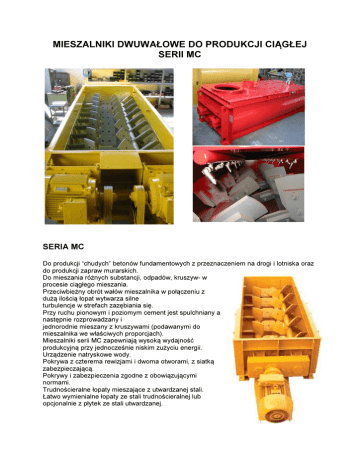 MIESZALNIKI DWUWAŁOWE DO PRODUKCJI CIĄGŁEJ SERII MC SERIA MC Do produkcji “chudych” betonów fundamentowych z przeznaczeniem na drogi i lotniska oraz do produkcji zapraw murarskich. Do mieszania różnych substancji, odpadów, kruszyw- w procesie ciągłego mieszania. Przeciwbieżny obrót wałów mieszalnika w połączeniu z dużą ilością łopat wytwarza silne turbulencje w strefach zazębiania się. Przy ruchu pionowym i poziomym cement jest spulchniany a następnie rozprowadzany i jednorodnie mieszany z kruszywami (podawanymi do mieszalnika we właściwych proporcjach). Mieszalniki serii MC zapewniają wysoką wydajność produkcyjną przy jednocześnie niskim zużyciu energii. Urządzenie natryskowe wody. Pokrywa z czterema rewizjami i dwoma otworami, z siatką zabezpieczającą. Pokrywy i zabezpieczenia zgodne z obowiązującymi normami. Trudnościeralne łopaty mieszające z utwardzanej stali. Łatwo wymienialne łopaty ze stali trudnościeralnej lub opcjonalnie z płytek ze stali utwardzanej. DANE TECHNICZNE DANE TECHNICZNE MC 100 150 200 250 300 400 Wydajność (beton świeży) m³/h 100 150 200 250 300 400 max uziarnienie mm 70 70 70 70 70 70 Silniki mieszalnika Łopaty mieszające KM/kW liczba 28/18 40 30/22 40 2x20/15 48 2x25/18 48 2x30/22 48 2x40/30 48 Waga kg 2800 2900 5300 5400 5900 6000 WYMIARY MC 100 - 150 MODEL MC 100 - 150 A 4040 B 375 C 390 D 1206 E 2600 F (F1) 250 G 500 I 520 R 315 MC 200 - 400 MODEL MC 200 - 250 300 - 400 A 4060 4180 B 580 620 C 590 660 D 1620 1840 E 3000 3000 F 300 300 DYSTRYBUTOR PHU OZB R.Buchowski i G.Zawada Sp.J. ul. Kościuszki 36a 59-700 Bolesławiec www.ozb.org.pl [email protected] tel. 756118043 fax 756118084 te. kom. 790529682 lub 790529692 Uwaga: rysunki, dane techniczne oraz wymiary mogą ulec zmianie bez powiadomienia. G 700 800 I 700 800 R 425 485