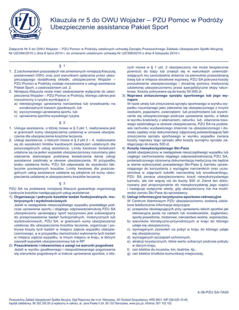 Klauzula nr 5 do OWU Wojażer – PZU Pomoc w Podróży Ubezpieczenie assistance Pakiet Sport Załącznik Nr 5 do OWU Wojażer – PZU Pomoc w Podróży ustalonych uchwałą Zarządu Powszechnego Zakładu Ubezpieczeń Spółki Akcyjnej Nr UZ/284/2010 z dnia 8 lipca 2010 r. ze zmianami ustalonymi uchwałą Nr UZ/399/2010 z dnia 8 listopada 2010 r. § 1 1. Z zachowaniem pozostałych nie zmienionych niniejszą Klauzulą postanowień OWU oraz pod warunkiem opłacenia przez ubezpieczającego dodatkowej składki, ubezpieczenie Wojażer – PZU Pomoc w Podróży zostaje rozszerzone o usługi assistance Pakiet Sport, z zastrzeżeniem ust. 2. 2. Niniejsza Klauzula może mieć zastosowanie wyłącznie do ubezpieczenia Wojażer – PZU Pomoc w Podróży, którego zakres jest rozszerzony o ryzyka wynikające z: a) rekreacyjnego uprawiania narciarstwa lub snowboardu na oznakowanych trasach zjazdowych, lub b) wyczynowego uprawiania sportu, lub c) uprawiania sportów wysokiego ryzyka. § 2 1. Usługa assistance, o której mowa w § 3 pkt 1, realizowana jest w granicach sumy ubezpieczenia ustalonej w umowie ubezpieczenia dla ubezpieczenia kosztów leczenia. 2. Usługi assistance, o których mowa w § 3 pkt 2 – 4, realizowane są do wysokości limitów kwotowych świadczeń ustalonych dla poszczególnych usług assistance. Limity kwotowe świadczeń ustalone są na jeden wypadek ubezpieczeniowy rozumiany jako zdarzenie stanowiące podstawę świadczenia danej usługi assistance zaistniały w okresie ubezpieczenia. W przypadku braku ustalenia limitu, PZU SA odpowiada do wysokości faktycznie poniesionych kosztów. Limity kwotowe dla poszczególnych usług assistance ustalane są odrębnie od sumy ubezpieczenia ustalanej w ubezpieczeniu kosztów leczenia. § 3 PZU SA na podstawie niniejszej Klauzuli gwarantuje organizację i pokrycie kosztów następujących usług assistance: 1) Organizacja i pokrycie kosztów badań funkcjonalnych, motorycznych i wydolnościowych Jeżeli w następstwie nieszczęśliwego wypadku powstałego podczas uprawiania sportu i objętego odpowiedzialnością PZU SA ubezpieczony uprawiający sport wyczynowo jest zobowiązany do przeprowadzenia badań funkcjonalnych, motorycznych lub wydolnościowych, PZU SA, w granicach sumy ubezpieczenia ustalonej dla ubezpieczenia kosztów leczenia, organizuje i pokrywa koszty tych badań w miejscu zajścia wypadku ubezpieczeniowego, a w przypadku niemożności wykonania tych badań w miejscu zajścia wypadku, w innym miejscu w kraju, w którym zaszedł wypadek ubezpieczeniowy lub w RP. 2) Poszukiwanie i ratownictwo z uwagi na warunki pogodowe Jeżeli w wyniku gwałtownego i niespodziewanego pogorszenia się warunków pogodowych w trakcie uprawiania sportów, o któ- rych mowa w § 1 ust. 2 ubezpieczony nie może bezpiecznie powrócić do bazy lub znalazł się w warunkach uniemożliwiających mu samodzielne dotarcie na pierwotnie przewidzianą trasę lub w miejsce docelowe wyprawy, PZU SA pokrywa koszty poszukiwania ubezpieczonego i doraźnej pomocy medycznej udzielonej ubezpieczonemu przez specjalistyczne ekipy ratunkowe. Koszty pokrywane są do kwoty 50.000 zł. 3) Naprawa zniszczonego sprzętu sportowego lub jego wynajem W razie utraty lub zniszczenia sprzętu sportowego w wyniku wypadku rozumianego jako zderzenie się ubezpieczonego z innymi osobami, pojazdami, zwierzętami lub przedmiotami lub wywrócenie się ubezpieczonego podczas uprawiania sportu, a także w wyniku kradzieży z włamaniem, rabunku lub zdarzenia losowego zaistniałego w okresie ubezpieczenia, PZU SA na podstawie rachunku wystawionego imiennie na ubezpieczonego i dowodu zapłaty oraz dokumentacji zdjęciowej potwierdzającej fakt zniszczenia sprzętu sportowego w wyniku wypadku zwraca koszty naprawy tego sprzętu albo koszty wynajmu sprzętu zastępczego do kwoty 500 zł. 4) Koszty niewykorzystanego Ski-Pass Jeżeli ubezpieczony w następstwie nieszczęśliwego wypadku lub nagłego zachorowania objętego odpowiedzialnością PZU SA, poświadczonego stosowną dokumentacją medyczną nie będzie w stanie wykorzystać posiadanego Ski-Pass tj. karnetu uprawniającego do korzystania z wyciągów narciarskich oraz uczestnictwa w zajęciach szkółki narciarskiej lub snowboardingu, PZU SA zwraca ubezpieczonemu koszt niewykorzystanego karnetu, ale nie więcej niż do kwoty 500 zł. Zwrot ten dokonywany jest proporcjonalnie do niewykorzystanej jego części i następuje wyłącznie wtedy, gdy ubezpieczony nie ma możliwości zwrotu Ski-Pass do sprzedawcy. 5) Usługi informacyjne turystyczno-sportowo-rekreacyjne W Centrum Alarmowym PZU ubezpieczonemu zostaną udzielone telefonicznie informacje dotyczące: a) przepisów obowiązujących przy uprawianiu takich sportów jak rekreacyjna jazda na nartach lub snowboardzie, żeglarstwo, sporty powietrzne, motorowe, narciarstwo wodne, wspinaczka, b) warunków klimatyczno-przyrodniczych w kraju do którego udaje się ubezpieczony, c) wymaganych zezwoleń na pobyt w kraju do którego udaje się ubezpieczony, d) wymaganych szczepień ochronnych, e) atrakcji turystycznych, które warto zobaczyć podczas pobytu w danym kraju, f) cen biletów do muzeów, kin, teatrów, itp., g) cen biletów środków komunikacji miejscowej. 4-38-PZU SA-7A05 Powszechny Zakład Ubezpieczeń Spółka Akcyjna, Sąd Rejonowy dla m.st. Warszawy, XII Wydział Gospodarczy, KRS 9831, NIP 526-025-10-49, kapitał zakładowy: 86 352 300,00 zł wpłacony w całości, al. Jana Pawła II 24, 00-133 Warszawa, www.pzu.pl, infolinia: 801 102 102