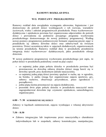RAMOWY ROZKŁAD DNIA W/G PODSTAWY PROGRAMOWEJ Ramowy rozkład dnia uwzględnia wymagania zdrowotne, higieniczne i jest dostosowany do potrzeb dzieci wynikających z ich rozwoju, warunków życiowych, wieku i założeń programowych przedszkola. Praca wychowawczodydaktyczna i opiekuńcza powinna być organizowana odpowiednio do potrzeb dzieci i prowadzona na podstawie przyjętego programu wychowania przedszkolnego dostosowanego do nowej podstawy programowej. Według nowej postawy programowej podstawowymi formami organizacyjnymi zajęć w przedszkolu są: zabawy dowolne dzieci oraz zabawy/ruch na świeżym powietrzu. Dzieci uczestniczą także w zajęciach dodatkowych, organizowanych na terenie przedszkola. Ramowy rozkład dnia w przedszkolu przedstawia integrację treści wychowawczo- dydaktycznych, jakie przedszkole oferuje dzieciom. W nowej podstawie programowej wychowania przedszkolnego jest zapis, że pobyt dzieci w przedszkolu podzielony został na pięć części: • • • • co najmniej jedna piąta pobytu dziecka w przedszkolu powinna być przeznaczona na dowolną zabawę dziecka (dzieci mogą bawić się w dowolny sposób, przy dyskretnym udziale nauczyciela), co najmniej jedną piątą dzieci powinny spędzać w ruchu, np. w ogrodzie, na boisku, w parku (mogą być organizowane zajęcia sportowe, gry, zabawy ruchowe, obserwacje przyrodnicze, prace ogrodnicze i porządkowe), jedna piątą można przeznaczyć na zajęcia dydaktyczne, pozostałe dwie piąte pobytu dziecka w przedszkolu nauczyciel może zagospodarować dowolnie (np: czynności opiekuńcze, samoobsługowe, organizacyjne). 6:00 – 7: 30 SCHODZENIE SIĘ DZIECI Zabawy w kącikach zainteresowań, zajęcia wynikające z własnej aktywności dzieci. 7:30 – 8:30 • Zabawa integracyjna lub inspirowana przez nauczycielkę o charakterze indywidualnym lub w zespołach, zabawy konstrukcyjne, manipulacyjne, tematyczne, rozwijające uwagę i myślenie, wyzwalające aktywność twórczą i ekspresję. • Zabawy integrujące grupę, zabawa ruchowa, kształtowanie umiejętności społecznych dzieci, zgodne funkcjonowanie w zabawie. • Praca indywidualna z dzieckiem. • Czynności higieniczno‐ porządkowe, przygotowanie do posiłku. 8:30-9:00 I ŚNIADANIE ORAZ PRZYGOTOWANIE DO ZAJĘĆ PROGRAMOWYCH. • Po zjedzonym śniadanku, dziękujemy za pyszny posiłek i myjemy ząbki. 9:00- 10:00 • Zajęcia dydaktyczne realizowane według założeń podstawy programowej oraz przyjętego programu tygodniowego rozkładu zajęć wychowania przedszkolnego według (rozwijanie różnorodnej aktywności dziecięcej: plastycznej, muzycznej, ruchowej, poznawczej, językowej. 10:00 ‐11:30 • Swobodne zabawy organizowane w ogrodzie przedszkolnym, obserwacje przyrodnicze, (spacery w najbliższym otoczeniu przedszkola). • Zajęcia i zabawy podejmowane z inicjatywy dzieci z wykorzystaniem zabawek ogrodowych i sprzętu sportowego. • Gry sportowe i ćwiczenia kształtujące postawę dziecka. • Gry i zabawy ruchowe w sali w przypadku złych warunków atmosferycznych. • Tworzenie sytuacji zainteresowania dzieci. rozwijających indywidualne zdolności i • Czynności higieniczno – porządkowe przygotowujące do posiłku. 11: 30- 12:00 II ŚNIADANIE • Doskonalenie umiejętności samodzielnego i estetycznego spożywania posiłku. 12:00 – 13:15 LEŻAKOWANIE • wyciszenie, relaks, słuchanie bajek. • Czynności porządkowe, higieniczno-sanitarne ,przygotowanie do obiadu. 13: 15 –14 : 15 OBIAD • Praca nad prawidłowym posługiwaniem się łyżką i widelcem, 14:15- 16:00 Zabawy zorganizowane, • Zabawy dydaktyczne, utrwalające nabyte umiejętności i wiedzę w sali zabaw. Monitorowanie rozwoju dzieci, zabawa ruchowa. • Czynności porządkowe- higieniczne, przygotowanie do podwieczorku 16:00 - 16 :30 Podwieczorek 16:30 – 18 :00 Zabawy dowolne • Zabawy ruchowe, zabawy dowolnie w kącikach zainteresowań, rozchodzenie się dzieci. .