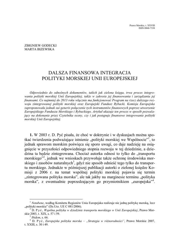 Prawo Morskie, t. XXVIII ISSN 0860-7338 ZBIGNIEW GODECKI MARTA BIZEWSKA DALSZA FINANSOWA INTEGRACJA POLITYKI MORSKIEJ UNII EUROPEJSKIEJ Odpowiednio do odnośnych dokumentów, takich jak zielona księga, trwa proces integrowania polityki morskiej Unii Europejskiej, także w zakresie jej finansowania i zarządzania jej finansami. Co najmniej do 2013 roku włącznie ma funkcjonować Program na rzecz dalszego rozwoju zintegrowanej polityki morskiej oraz Europejski Fundusz Rybacki. Komisja Europejska zaproponowała jednak sui generis połączenie tych instrumentów finansowych poprzez utworzenie Europejskiego Funduszu Morskiego i Rybackiego. Artykuł ukazuje ten proces w sposób pozwalający na dokonanie przez Czytelnika oceny, czy i jak postępuje finansowe integrowanie polityki morskiej Unii Europejskiej. 1. W 2003 r. D. Pyć pisała, że choć w doktrynie i w dyskusjach można spotkać twierdzenia podważające istnienie „polityki morskiej we Wspólnocie”1, to jednak sprawom morskim poświęca się sporo uwagi, co daje nadzieję na osiągnięcie w przyszłości odpowiedniego stopnia rozwoju w tej dziedzinie, a dziedzina ta będzie zintegrowana. Chociaż autorka odnosi to tylko do „transportu morskiego”2, jednak we wnioskach przywołuje także ochronę środowiska morskiego i zasobów naturalnych3, gdyż nie sposób odnieść tego tylko do transportu morskiego. Jednakże w późniejszej publikacji autorki o zielonej księdze Komisji z 2006 r. na temat wspólnej polityki morskiej pojawia się termin „zintegrowana polityka morska”, ale tak jakby na marginesie terminu „polityka morska”, z ewentualnie poprzedzającym go przymiotnikiem „europejska”4. 1 Notabene, według Komitetu Regionów Unia Europejska realizuje nie jedną politykę morską, lecz „polityki morskie” (Dz.Urz. UE C 081/2006). 2 D. P y ć , Wspólna polityka w dziedzinie transportu morskiego w Unii Europejskiej, Prawo Morskie 2003, t. XIX, s. 57 i 59. 3 Ibidem, s. 66. 4 D. P y ć , Europejska polityka morska – „Strategia w różnorodności”, Prawo Morskie 2007, t. XXIII, s. 30 i 49. 148 Zbigniew Godecki, Marta Bizewska W nowszej publikacji D. Pyć5 termin „zintegrowana polityka morska” w różnych formach gramatycznych pojawia się już częściej. Kiedy w roku 2006 Komisja opublikowała zieloną księgę pt. W kierunku przyszłej unijnej polityki morskiej; europejska wizja oceanów i mórz6, M.A. Nesterowicz pisała o niej jako o dokumencie, którym rozpoczęto7 jeden z największych procesów konsultacyjnych w historii Unii Europejskiej w kierunku określenia nowej wizji „zintegrowanej polityki morskiej” jako polityki, która nie powinna pozostawać tylko elementem określonych sektorów, ale powinna integrować różne dziedziny działalności człowieka związanej z morzami i oceanami, takie jak transport czy rybołówstwo, ale nie tylko, bo także takie jak np. badania morskie, turystyka i źródła wytwarzania energii (tradycyjne i alternatywne)8. Należy zauważyć, że zarówno w tytule, jak i treści tej księgi występuje termin „polityka morska” (a nie „zintegrowana polityka morska”), który odnosi się do przyszłości („przyszła unijna polityka morska”). W odpowiedniej formie gramatycznej występuje w niej wprawdzie wyraz „integracja”, ale nie w ogólnym, lecz w szczególnym kontekście („Jak należy zintegrować gospodarkę morską z polityką rozwoju i sąsiedztwa UE?”). Nie ma tam natomiast terminu „zintegrowana polityka morska”. Także w tytule i treści komunikatu Komisji z 2007 r.9, zawierającego wnioski z dyskusji na temat zielonej księgi, występuje termin „polityka morska”, ale pojawia się tam już także termin „zintegrowana polityka morska”. Co w tym kontekście kryje się za przymiotnikiem „zintegrowana”? Komisja podaje, że w konsultacjach opowiedziano się za „zintegrowanym podejściem do polityki morskiej w Unii Europejskiej”, ponieważ taka „polityka łączy problemy i potrzeby” powiązanych ze sobą sektorów, objętych działaniami w ramach oddzielnych polityk. Komisja sygnalizuje, że uczestnicy konsultacji ową „integrację” postrzegali jednak bardziej jako udzielanie wsparcia niż zajmowanie się integracją jako taką. Uważali też, że polityka morska powinna mieć na celu dopasowanie wszystkich części „układanki morskiej”, a nie zmianę struktury każdej z nich. Twierdzono także, że realizacja projektu tak rozumianego „integrowania” polityki morskiej to proces długoterminowy, ciągły i oparty na uczeniu się. W interesującym autorów niniejszego opracowania aspekcie najważniejsze jest jednak wykazanie istnienia trudności z ustaleniem, które części strukturalnych wydatków Unii przyczyniają się do realizacji celów polityki morskiej. 5 D. P y ć , Polityka morska Unii Europejskiej jako sztuka zintegrowanego rządzenia morzem, [w:] Współczesne problemy prawa. Księga pamiątkowa dedykowana Profesorowi Jerzemu Młynarczykowi, red. U. J a c k o w i a k , Gdynia 2011, s. 178–198. 6 KOM(2006) 275. 7 W wyniku decyzji Komisji z 2005 r. o rozpoczęciu konsultacji w tej materii. 8 M.A. N e s t e r o w i c z , Aktualności z zakresu europejskiej legislacji morskiej, Prawo Morskie 2007, t. XXIII, s. 320–321. 9 KOM(2007) 574. Dalsza finansowa integracja polityki morskiej Unii Europejskiej 149 W kolejnym komunikacie, zwanym niebieską księgą (także z 2007 r.)10, widać już, począwszy od jego tytułu, „zintegrowaną politykę morską”11, o której Komisja pisze jako o „propozycji” opartej na założeniu, że wszystkie zagadnienia związane z oceanami i morzami Europy są wzajemnie powiązane, oraz że działania polityczne dotyczące morza należy prowadzić w sposób skoordynowany, aby uzyskać pożądane wyniki. Zintegrowana polityka morska wymaga struktury zarządzania, która stosuje zintegrowane podejście na każdym szczeblu, oraz instrumentów prowadzenia jej na płaszczy