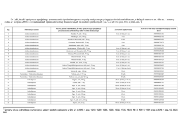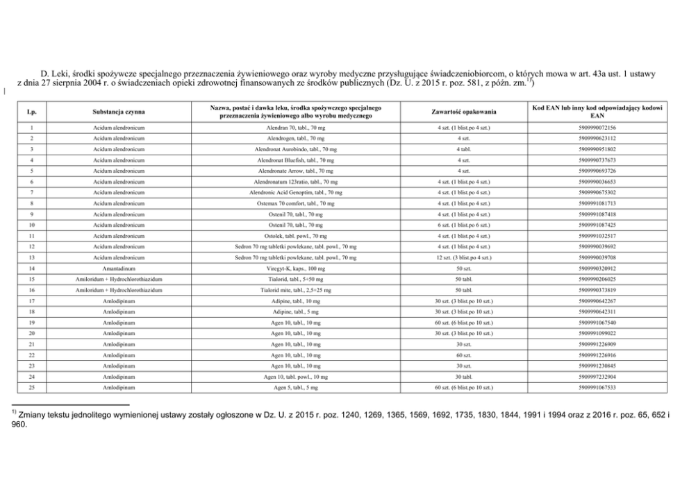 D. Leki, środki spożywcze specjalnego przeznaczenia żywieniowego oraz wyroby medyczne przysługujące świadczeniobiorcom, o których mowa w art. 43a ust. 1 ustawy z dnia 27 sierpnia 2004 r. o świadczeniach opieki zdrowotnej finansowanych ze środków publicznych (Dz. U. z 2015 r. poz. 581, z późn. zm.1)) 1) Lp. Substancja czynna Nazwa, postać i dawka leku, środka spożywczego specjalnego przeznaczenia żywieniowego albo wyrobu medycznego Zawartość opakowania Kod EAN lub inny kod odpowiadający kodowi EAN 1 Acidum alendronicum Alendran 70, tabl., 70 mg 4 szt. (1 blist.po 4 szt.) 5909990072156 2 Acidum alendronicum Alendrogen, tabl., 70 mg 4 szt. 5909990623112 3 Acidum alendronicum Alendronat Aurobindo, tabl., 70 mg 4 tabl. 5909990951802 4 Acidum alendronicum Alendronat Bluefish, tabl., 70 mg 4 szt. 5909990737673 5 Acidum alendronicum Alendronate Arrow, tabl., 70 mg 4 szt. 5909990693726 6 Acidum alendronicum Alendronatum 123ratio, tabl., 70 mg 4 szt. (1 blist.po 4 szt.) 5909990036653 7 Acidum alendronicum Alendronic Acid Genoptim, tabl., 70 mg 4 szt. (1 blist.po 4 szt.) 5909990675302 8 Acidum alendronicum Ostemax 70 comfort, tabl., 70 mg 4 szt. (1 blist.po 4 szt.) 5909991081713 9 Acidum alendronicum Ostenil 70, tabl., 70 mg 4 szt. (1 blist.po 4 szt.) 5909991087418 10 Acidum alendronicum Ostenil 70, tabl., 70 mg 6 szt. (1 blist.po 6 szt.) 5909991087425 11 Acidum alendronicum Ostolek, tabl. powl., 70 mg 4 szt. (1 blist.po 4 szt.) 5909991032517 12 Acidum alendronicum Sedron 70 mg tabletki powlekane, tabl. powl., 70 mg 4 szt. (1 blist.po 4 szt.) 5909990039692 13 Acidum alendronicum Sedron 70 mg tabletki powlekane, tabl. powl., 70 mg 12 szt. (3 blist.po 4 szt.) 5909990039708 14 Amantadinum Viregyt-K, kaps., 100 mg 50 szt. 5909990320912 15 Amiloridum + Hydrochlorothiazidum Tialorid, tabl., 5+50 mg 50 tabl. 5909990206025 16 Amiloridum + Hydrochlorothiazidum Tialorid mite, tabl., 2,5+25 mg 50 tabl. 5909990373819 17 Amlodipinum Adipine, tabl., 10 mg 30 szt. (3 blist.po 10 szt.) 5909990642267 18 Amlodipinum Adipine, tabl., 5 mg 30 szt. (3 blist.po 10 szt.) 5909990642311 19 Amlodipinum Agen 10, tabl., 10 mg 60 szt. (6 blist.po 10 szt.) 5909991067540 20 Amlodipinum Agen 10, tabl., 10 mg 30 szt. (3 blist.po 10 szt.) 5909991099022 21 Amlodipinum Agen 10, tabl., 10 mg 30 szt. 5909991226909 22 Amlodipinum Agen 10, tabl., 10 mg 60 szt. 5909991226916 23 Amlodipinum Agen 10, tabl., 10 mg 30 szt. 5909991230845 24 Amlodipinum Agen 10, tabl. powl., 10 mg 30 tabl. 5909997232904 25 Amlodipinum Agen 5, tabl., 5 mg 60 szt. (6 blist.po 10 szt.) 5909991067533 Zmiany tekstu jednolitego wymienionej ustawy zostały ogłoszone w Dz. U. z 2015 r. poz. 1240, 1269, 1365, 1569, 1692, 1735, 1830, 1844, 1991 i 1994 oraz z 2016 r. poz. 65, 652 i 960. Lp. Substancja czynna Nazwa, postać i dawka leku, środka spożywczego specjalnego przeznaczenia żywieniowego albo wyrobu medycznego Zawartość opakowania Kod EAN lub inny kod odpowiadający kodowi EAN 26 Amlodipinum Agen 5, tabl., 5 mg 30 szt. (3 blist.po 10 szt.) 5909991098926 27 Amlodipinum Agen 5, tabl., 5 mg 30 szt. 5909991231811 28 Amlodipinum Agen 5, tabl. powl., 5 mg 30 tabl. 5909997232928 29 Amlodipinum Aldan, tabl., 5 mg 30 szt. (3 blist.po 10 szt.) 5909991008635 30 Amlodipinum Aldan, tabl., 10 mg 30 szt. (3 blist.po 10 szt.) 5909991008734 31 Amlodipinum Alneta, tabl., 5 mg 30 szt. 5909991067977 32 Amlodipinum Alneta, tabl., 5 mg 60 tabl. 5909991067991 33 Amlodipinum Alneta, tabl., 5 mg 90 tabl. 5909991068035 34 Amlodipinum Alneta, tabl., 10 mg 30 szt. 5909991068073 35 Amlodipinum Alneta, tabl., 10 mg 60 tabl. 5909991068097 36 Amlodipinum Alneta, tabl., 10 mg 90 tabl. 5909991068141 37 Amlodipinum Amlaxopin, tabl., 5 mg 30 szt. 5909990752690 38 Amlodipinum Amlaxopin, tabl., 10 mg 30 szt. 5909990752720 39 Amlodipinum Amlodipine Aurobindo, tabl., 5 mg 30 szt. 5909990954254 40 Amlodipinum Amlodipine Aurobindo, tabl., 10 mg 30 szt. 5909990955008 41 Amlodipinum Amlodipine Bluefish, tabl., 5 mg 30 tabl. 5909990800469 42 Amlodipinum Amlodipine Bluefish, tabl., 10 mg 30 tabl. 5909990800551 43 Amlodipinum Amlodipinum 123ratio, tabl., 10 mg 30 szt. 5909991225650 44 Amlodipinum Amlodipinum 123ratio, Amlodipine Teva, tabl., 5 mg 30 szt. (3 blist.po 10 szt.) 5909990721580 45 Amlodipinum Amlodipinum 123ratio, Amlodipine Teva, tabl., 10 mg 30 szt. (3 blist.po 10 szt.) 5909990721603 46 Amlodipinum Amlomyl, tabl., 5 mg 30 szt. 5909990842476 47 Amlodipinum Amlomyl, tabl., 10 mg 30 szt. 5909990842698 48 Amlodipinum Amlonor, tabl., 5 mg 30 szt. (3 blist.po 10 szt.) 5909990642618 49 Amlodipinum Amlonor, tabl., 10 mg 30 szt. (3 blist.po 10 szt.) 5909990642625 50 Amlodipinum Amlopin 10 mg, tabl., 10 mg 30 szt. (3 blist.po 10 szt.) 5909990048977 51 Amlodipinum Amlopin 10 mg, tabl., 10 mg 30 szt. 5909997213699 52 Amlodipinum Amlopin 10 mg, tabl., 10 mg 30 szt. 5909997218090 53 Amlodipinum Amlopin 10 mg, tabl., 10 mg 30 tabl. 5909997231501 54 Amlodipinum Amlopin 5 mg, tabl., 5 mg 30 szt. (3 blist.po 10 szt.) 5909990048939 55 Amlodipinum Amlopin 5 mg, tabl., 5 mg 30 szt. 5909991200732 56 Amlodipinum Amlopin 5 mg, tabl., 5 mg 30 szt. 5909997213675 Lp. Substancja czynna Nazwa, postać i dawka leku, środka spożywczego specjalnego przeznaczenia żywieniowego albo wyrobu medycznego Zawartość opakowania Kod EAN lub inny kod odpowiadający kodowi EAN 57 Amlodipinum Amlopin 5 mg, tabl., 5 mg 30 szt. 5909997218113 58 Amlodipinum Amlozek, tabl., 5 mg 30 szt. 5909990799718 59 Amlodipinum Amlozek, tabl., 10 mg 30 szt. 5909990799817 60 Amlodipinum Apo-Amlo 10, tabl., 10 mg 30 szt. (3 blist.po 10 szt.) 5909990565993 61 Amlodipinum Apo-Amlo 10, tabl., 10 mg 30 szt. 5909991236687 62 Amlodipinum Apo-Amlo 5, tabl., 5 mg 30 szt. (3 blist.po 10 szt.) 5909990565986 63 Amlodipinum Cardilopin, tabl., 2,5 mg 30 szt. (3 blist.po 10 szt.) 5909990907311 64 Amlodipinum Cardilopin, tabl., 5 mg 30 szt. (3 blist.po 10 szt.) 5909990907410 65 Amlodipinum Cardilopin, tabl., 10 mg 30 szt. (3 blist.po 10 szt.) 590999