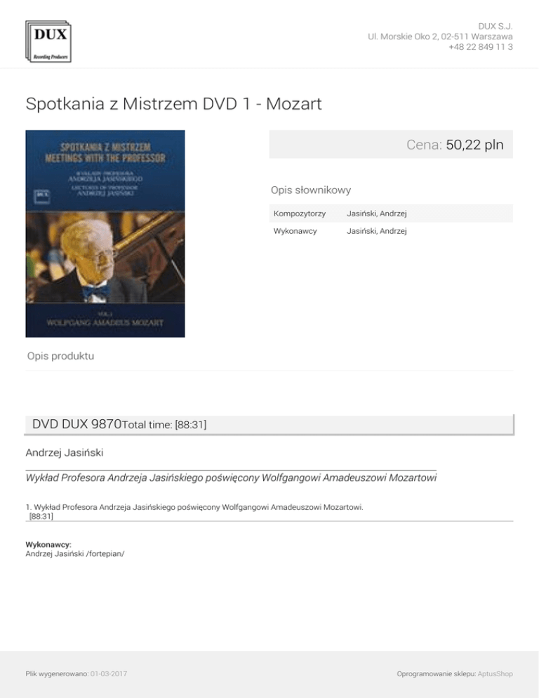 DUX S.J. Ul. Morskie Oko 2, 02-511 Warszawa +48 22 849 11 3 Spotkania z Mistrzem DVD 1 - Mozart Cena: 50,22 pln Opis słownikowy Kompozytorzy Jasiński, Andrzej ∎ Wykonawcy Jasiński, Andrzej ∎ Opis produktu DVD DUX 9870Total time: [88:31] Andrzej Jasiński Wykład Profesora Andrzeja Jasińskiego poświęcony Wolfgangowi Amadeuszowi Mozartowi 1. Wykład Profesora Andrzeja Jasińskiego poświęcony Wolfgangowi Amadeuszowi Mozartowi. [88:31] Wykonawcy: Andrzej Jasiński /fortepian/ Plik wygenerowano: 01-03-2017 Powered by TCPDF (www.tcpdf.org) Oprogramowanie sklepu: AptusShop