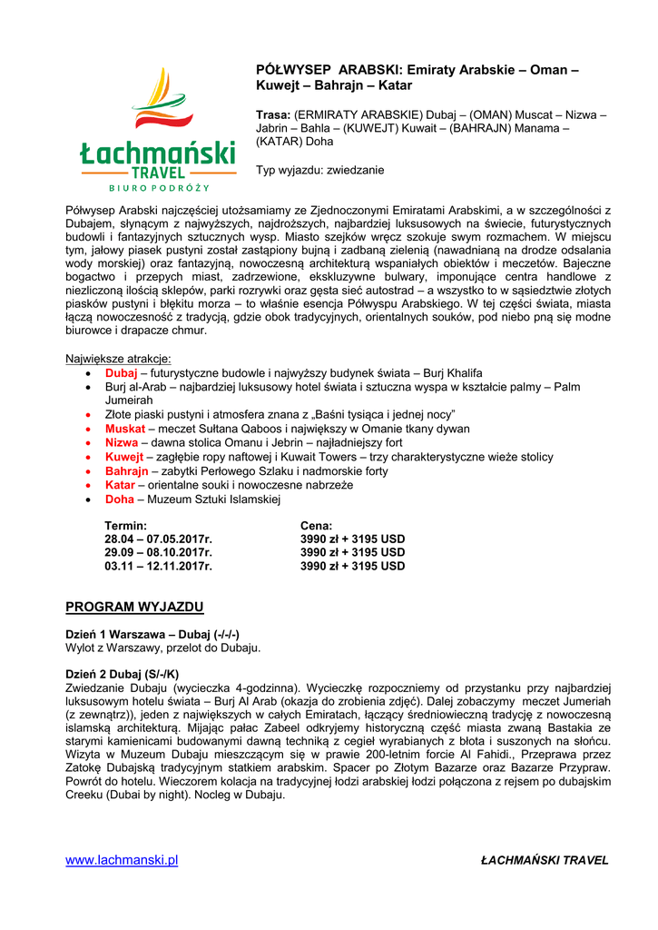 PÓŁWYSEP ARABSKI: Emiraty Arabskie – Oman – Kuwejt – Bahrajn – Katar Trasa: (ERMIRATY ARABSKIE) Dubaj – (OMAN) Muscat – Nizwa – Jabrin – Bahla – (KUWEJT) Kuwait – (BAHRAJN) Manama – (KATAR) Doha Typ wyjazdu: zwiedzanie Półwysep Arabski najczęściej utożsamiamy ze Zjednoczonymi Emiratami Arabskimi, a w szczególności z Dubajem, słynącym z najwyższych, najdroższych, najbardziej luksusowych na świecie, futurystycznych budowli i fantazyjnych sztucznych wysp. Miasto szejków wręcz szokuje swym rozmachem. W miejscu tym, jałowy piasek pustyni został zastąpiony bujną i zadbaną zielenią (nawadnianą na drodze odsalania wody morskiej) oraz fantazyjną, nowoczesną architekturą wspaniałych obiektów i meczetów. Bajeczne bogactwo i przepych miast, zadrzewione, ekskluzywne bulwary, imponujące centra handlowe z niezliczoną ilością sklepów, parki rozrywki oraz gęsta sieć autostrad – a wszystko to w sąsiedztwie złotych piasków pustyni i błękitu morza – to właśnie esencja Półwyspu Arabskiego. W tej części świata, miasta łączą nowoczesność z tradycją, gdzie obok tradycyjnych, orientalnych souków, pod niebo pną się modne biurowce i drapacze chmur. Największe atrakcje: Dubaj – futurystyczne budowle i najwyższy budynek świata – Burj Khalifa Burj al-Arab – najbardziej luksusowy hotel świata i sztuczna wyspa w kształcie palmy – Palm Jumeirah Złote piaski pustyni i atmosfera znana z „Baśni tysiąca i jednej nocy” Muskat – meczet Sułtana Qaboos i największy w Omanie tkany dywan Nizwa – dawna stolica Omanu i Jebrin – najładniejszy fort Kuwejt – zagłębie ropy naftowej i Kuwait Towers – trzy charakterystyczne wieże stolicy Bahrajn – zabytki Perłowego Szlaku i nadmorskie forty Katar – orientalne souki i nowoczesne nabrzeże Doha – Muzeum Sztuki Islamskiej Termin: 28.04 – 07.05.2017r. 29.09 – 08.10.2017r. 03.11 – 12.11.2017r. Cena: 3990 zł + 3195 USD 3990 zł + 3195 USD 3990 zł + 3195 USD PROGRAM WYJAZDU Dzień 1 Warszawa – Dubaj (-/-/-) Wylot z Warszawy, przelot do Dubaju. Dzień 2 Dubaj (S/-/K) Zwiedzanie Dubaju (wycieczka 4-godzinna). Wycieczkę rozpoczniemy od przystanku przy najbardziej luksusowym hotelu świata – Burj Al Arab (okazja do zrobienia zdjęć). Dalej zobaczymy meczet Jumeriah (z zewnątrz)), jeden z największych w całych Emiratach, łączący średniowieczną tradycję z nowoczesną islamską architekturą. Mijając pałac Zabeel odkryjemy historyczną część miasta zwaną Bastakia ze starymi kamienicami budowanymi dawną techniką z cegieł wyrabianych z błota i suszonych na słońcu. Wizyta w Muzeum Dubaju mieszczącym się w prawie 200-letnim forcie Al Fahidi., Przeprawa przez Zatokę Dubajską tradycyjnym statkiem arabskim. Spacer po Złotym Bazarze oraz Bazarze Przypraw. Powrót do hotelu. Wieczorem kolacja na tradycyjnej łodzi arabskiej łodzi połączona z rejsem po dubajskim Creeku (Dubai by night). Nocleg w Dubaju. www.lachmanski.pl ŁACHMAŃSKI TRAVEL Dzień 3 Dubaj – safari (S/-/K) Zwiedzanie Dubaju (wycieczka 4-godzinna). Trasa rozpoczyna się od wizyty w dzielnicy wieżowców Dubai Marina. Przejazd na sztuczną wyspę w kształcie palmy – Palm Jumeirah, gdzie zbudowano luksusowe wille i apartamentowce. Postój na zdjęcia luksusowego hotelu Atlantis, gdzie można znaleźć wiele atrakcji, m.in. labirynt akwariów. Przejazd do kompleksu Madinat Jumeirah, gdzie znajduje się replika arabskiego suku. Spacer po największym centrum handlowym na świecie. Następnie przystanek w okolicy najwyższego wieżowca świata Burj Khalifa (828 m). Dla chętnych (fakultatywnie – 40 USD, konieczna rezerwacja przed wyjazdem) wjazd na punkt widokowy na 124. piętrze. Po południu jeep safari jeep – wycieczka na malowniczą pustynię terenowymi samochodami przez wydmy na farmę wielbłądów, które hodowane są tam specjalnie do wyścigów. Wizyta w beduińskiej oazie, oglądanie zachodu słońca na pustyni. Następnie kolacja beduińska (bufet, napoje bezalkoholowe wliczone w cenę), składająca się z różnych gatunków mięs grillowanych, pieczonych ziemniaków, arabskiego chleba i sałatek ze świeżych warzyw i owoców. Nocleg w Dubaju. Dzień 4 Hatta – Rustaq – Nakhal – (OMAN) Muskat (S/L/K) Z Dubaju przejazd do Hatta i przekroczenie granicy z Omanem, leżącym na obszarze dawnych sułtanatów Muskatu i Omanu, rozwiniętego kraju, który jednak zachował tradycje, kulturę, i pozostał typowo arabski. Zmiana pojazdów i przejazd w kierunku Muscat. Po drodze postój przy forcie Rustaq zbudowanym cztery wieki przed powstaniem islamu w Omanie, którego imponująca struktura opiera się na trzech poziomach, zawierających oddzielne domy, zbrojownię, meczet i cztery wieże . Następnie przejazd do Nakhal. Odpoczynek w gaju palm daktylowych leżącym nad wodą, u podnóża wzgórza. Przejazd na nocleg do Muscat. Dzień 5 Muskat (S/L/K) Zwiedzanie Muskat, miasta łączącego cechy nowoczesnego centrum handlowego z centrum tradycji kulturalnej. Przejazd promenadą Corniche, przystanek przy targu rybnym. Zobaczymy pałac sułtański – Al Alam (z zewnątrz), meczet sułtana Qaboosa, gdzie salę modlitewną pokrywa największy w Omanie tkany dywan. Przejazd przez dzielnicę Al Khuwair – dzielnica ministerstw i banków. Wizyta na Muttrah souq, gdzie pełno jest maleńkich sklepików, wąskich dróżek i ścieżynek, a sprzedawcy głośno zachwalają swój towar, wyciągają go przed siebie i próbują zwabić kupujących. Zwiedzanie Muzeum Bait Al Zubair. Powrót do hotelu. Po południu czas wolny. Nocleg w Muscat. Dzień 6 Nizwa – Jabrin – Bahla (S/L/K) Przejazd do Nizwy przez pasmo górskie Jebel Akhdar. Góry te są poszarpane, bardziej piaszczyste, jako że suszy je słońce. Ale co najpiękniejsze, są one różnokolorowe! Przez to, że gromadzą się w nich różne minerały, jedna góra potrafi wyglądać jak materiał w paski! Pomiędzy górami