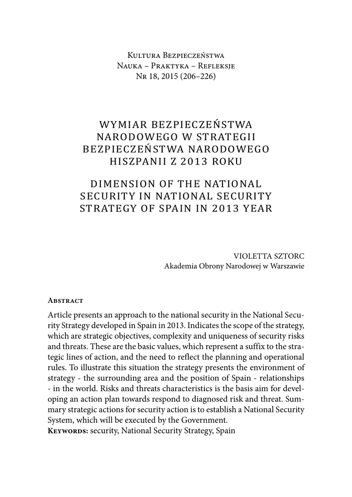 Kultura Bezpieczeństwa Nauka – Praktyka – Refleksje Nr 18, 2015 (206–226) WYMIAR BEZPIECZEŃSTWA NARODOWEGO W STRATEGII BEZPIECZEŃSTWA NARODOWEGO HISZPANII z 2013 ROKU DIMENSION OF THE NATIONAL SECURITY IN NATIONAL SECURITY STRATEGY OF SPAIN IN 2013 YEAR VIOLETTA SZTORC Akademia Obrony Narodowej w Warszawie Abstract Article presents an approach to the national security in the National Security Strategy developed in Spain in 2013. Indicates the scope of the strategy, which are strategic objectives, complexity and uniqueness of security risks and threats. These are the basic values, which represent a suffix to the strategic lines of action, and the need to reflect the planning and operational rules. To illustrate this situation the strategy presents the environment of strategy - the surrounding area and the position of Spain - relationships - in the world. Risks and threats characteristics is the basis aim for developing an action plan towards respond to diagnosed risk and threat. Summary strategic actions for security action is to establish a National Security System, which will be executed by the Government. Keywords: security, National Security Strategy, Spain WYMIAR BEZPIECZEŃSTWA NARODOWEGO… • 207 Abstrakt Artykuł przedstawia podejście do bezpieczeństwa narodowego opracowane w Strategii Bezpieczeństwa Narodowego Hiszpanii w roku 2013. Wskazuje na zakres strategii, której są strategiczne cele, złożoność środowiska bezpieczeństwa oraz wyjątkowość ryzyk i zagrożeń. Omawiane są podstawowe wartości, które stanowią wyznacznik dla strategicznych kierunków działań, jak również konieczność uwzględnienia planowania i określenia zasad działania. Dla zobrazowania sytuacji omawiane jest środowisko strategii - jej otoczenie oraz pozycja Hiszpanii - jej relacje - w świecie. Diagnoza ryzyk i zagrożeń stanowi podstawę dla opracowania planu działań będących odpowiedzią na zdiagnozowane ryzyka i zagrożenia. Podsumowaniem strategicznych działań na rzecz bezpieczeństwa jest ustanowienie Systemu Bezpieczeństwa Narodowego, które powierza się Rządowi. Słowa kluczowe: bezpieczeństwo, Strategia Bezpieczeństwa Narodowego, Hiszpania Wprowadzenie Tematem artykułu jest Strategia Bezpieczeństwa Narodowego Hiszpanii z roku 2013. Dokument kompleksowo prezentuje strategiczne działania na rzecz bezpieczeństwa narodowego. Podejmuje analizę środowiska, z którym posiada związki polityczne i gospodarcze oraz odnosi się spraw bezpieczeństwa. Strategia prezentuje scenariusze, które opracowano na podstawie zdiagnozowanych zagrożeń i ryzyk. Problemem badawczym, do którego odnosi się artykuł jest zakres prezentacji i ujęcie tematyki strategii bezpieczeństwa. Celem artykułu jest zaprezentowanie podejścia do obszaru strategicznych działań oraz wskazanie połączeń, które są istotne dla całościowego i spójnego ujęcia tematu strategii bezpieczeństwa narodowego Hiszpanii, jak rownież wskazanie obszarów, które mają istotne znaczenie dla bezpieczeństwa narodowego kraju oraz działań które należy podjać. 208 • VIOLETTA SZTORC Wstęp „Istota wielkiej strategii to kombinacja cech i elementów1. Składają się na nią2: A/ całościowe podejście do przestrzeni oraz funkcji, jaką ma pełnić, B/ czas trwania, C/ dokładna analiza środowiska, D/ struktura celów, ich hierarchia jest powiązana z zasobami oraz metodami osiągania celów, E/ podmiot ją realizujący jest zintegrowany i jednolity. W maju 2013 roku rząd Hiszpanii przyjął drugą Strategię Bezpieczeństwa Narodowego. Jest ona zarazem kontynuacją pierwszej Strategii Bezpieczeństwa Narodowego, która powstała w roku 20113. Ważnym elementem każdej strategii jest działanie długofalowe. Działania krótkofalowe, czy odpowiedzi na reakcje zachodzące w otoczeniu są wynikiem strategii długofalowych, płynących z otoczenia. Strategia m.in. B.L. Liddell Harta z „wielką strategią” wpisuje się w konieczność posiadania i realizację strategii długofalowej. Założeniem hiszpańskiej Strategii Bezpieczeństwa Narodowego z roku 2013 jest wskazanie działań na rzecz państwa oraz wyzwań aktualnie zdiagnozowanych, wykorzystując dostępne zasoby sprawniej i skuteczniej. Strategia ma zwiększać możliwości państwa w zakresie zapobiegania, ochrony i reakcji na rosnące, złożone sytuacje środowiska bezpieczeństwa. Dla zapewnienia realizacji powyższych celów strategia prezentuje całościowe odniesienie do bezpieczeństwa narodowego. W strategii zwraca się uwagę na dynamiczne i szybko zmieniające się otoczenie. Jest to wynikiem szybkiego dostępu do informacji. Taka sytuacja stwarza konieczność dostosowania działań do pojawiających się w otoczeniu ryzyk i zagrożeń. Na przestrzeni ostatnich 10 lat dynamika zmian była wysoka, wynikała ona z powstających wyzwań oraz nowych technologii. Były one na tyle duże, że ich intensywność spowodowała konieczność wprowadzenia 1 Szczepański J., Polska wobec wyzwań przyszłości, [w:] Podejście strategiczne a bezpieczeństwo państwa. Aspekty polityczne i ekonomiczne, Studia i materiały, Polski Instytut Spraw Międzynarodowych, Haliżak E., Kuźniar R., Warszawa, Grudzień 1992, s. 6‑7. 2 Ibidem, s. 6-7. 3h ttp://www.bbn.gov.pl/pl/prace-biura/publikacje/analizy-raporty-i-nota/4907,Strategiabezpieczenstwa-narodowego-Hiszpanii.html?search=87081688(31.03.2015), 2013-10-01-Strategia_hiszpanska-www2__2_.pdf. WYMIAR BEZPIECZEŃSTWA NARODOWEGO… • 209 zmian we wcześniejszych założeniach. Nie zawsze jest to regułą, jednak opracowanie strategii wymaga zarówno czasu, jak i analizy otoczenia zewnętrznego i wewnętrznego. Zakres strategii bezpieczeństwa narodowego Strategia Hiszanii w swej głównej części wskazuje na istotę strategicznych celów. Podkreśla złożoność środowiska bezpieczeństwa wynikającą z osobliwości ryzyk i zagrożeń. Strategia ma prezentować skuteczne działan