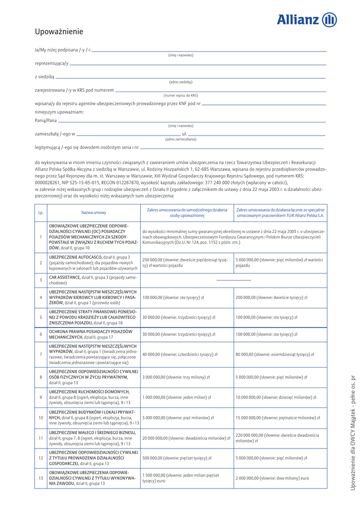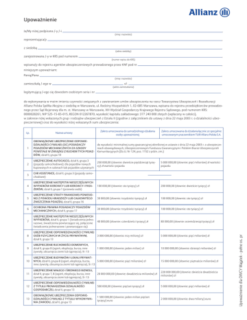 Upoważnienie Ja/My niżej podpisana /-y /-i , (imię i nazwisko) reprezentująca/y , z siedzibą , (adres siedziby) zarejestrowana /-y w KRS pod numerem , (numer wpisu do KRS) wpisana/y do rejestru agentów ubezpieczeniowych prowadzonego przez KNF pod nr , niniejszym upoważniam: Panią/Pana , (imię i nazwisko) zamieszkałą /-ego w ul. , (adres zamieszkania) legitymującą /-ego się dowodem osobistym seria i nr do wykonywania w moim imieniu czynności związanych z zawieraniem umów ubezpieczenia na rzecz Towarzystwa Ubezpieczeń i Reasekuracji Allianz Polska Spółka Akcyjna z siedzibą w Warszawie, ul. Rodziny Hiszpańskich 1, 02-685 Warszawa, wpisana do rejestru przedsiębiorców prowadzonego przez Sąd Rejonowy dla m. st. Warszawy w Warszawie, XIII Wydział Gospodarczy Krajowego Rejestru Sądowego, pod numerem KRS: 0000028261, NIP 525-15-65-015, REGON 012267870, wysokość kapitału zakładowego: 377 240 000 złotych (wpłacony w całości), w zakresie niżej wskazanych grup i rodzajów ubezpieczeń z Działu II (zgodnie z załącznikiem do ustawy z dnia 22 maja 2003 r. o działalności ubezpieczeniowej) oraz do wysokości niżej wskazanych sum ubezpieczenia: Zakres umocowania do działania łącznie ze specjalnie umocowanym pracownikiem TUiR Allianz Polska S.A. Nazwa umowy 1 OBOWIĄZKOWE UBEZPIECZENIE ODPOWIEDZIALNOŚCI CYWILNEJ (OC) POSIADACZY POJAZDÓW MECHANICZNYCH ZA SZKODY POWSTAŁE W ZWIĄZKU Z RUCHEM TYCH POJAZDÓW, dział II, grupa 10 do wysokości minimalnej sumy gwarancyjnej określonej w ustawie z dnia 22 maja 2003 r. o ubezpieczeniach obowiązkowych, Ubezpieczeniowym Funduszu Gwarancyjnym i Polskim Biurze Ubezpieczycieli Komunikacyjnych (Dz.U. Nr 124, poz. 1152 z późn. zm.) 2 UBEZPIECZENIE AUTOCASCO, dział II, grupa 3 (pojazdy samochodowe); dla pojazdów nowych kupowanych w salonach lub pojazdów używanych 250 000,00 (słownie: dwieście pięćdziesiąt tysięcy) zł wartości pojazdu 5 000 000,00 (słownie: pięć milionów) zł wartości pojazdu 3 CAR ASSISTANCE, dział II, grupa 3 (pojazdy samochodowe) 4 UBEZPIECZENIE NASTĘPSTW NIESZCZĘŚLIWYCH WYPADKÓW KIEROWCY LUB KIEROWCY I PASAŻERÓW, dział II, grupa 1 (przewóz osób) 100 000,00 (słownie: sto tysięcy) zł 200 000,00 (słownie: dwieście tysięcy) zł 5 UBEZPIECZENIE STRATY FINANSOWEJ PONIESIONEJ Z POWODU KRADZIEŻY LUB CAŁKOWITEGO ZNISZCZENIA POJAZDU, dział II, grupa 16 30 000,00 (słownie: trzydzieści tysięcy) zł 100 000,00 (słownie: sto tysięcy) zł 6 OCHRONA PRAWNA POSIADACZY POJAZDÓW MECHANICZNYCH, dział II, grupa 17 30 000,00 (słownie: trzydzieści tysięcy) zł 100 000,00 (słownie: sto tysięcy) zł 7 UBEZPIECZENIE NASTĘPSTW NIESZCZĘŚLIWYCH WYPADKÓW, dział II, grupa 1 (świadczenia jednorazowe, świadczenia powtarzające się, połączone świadczenia jednorazowe i powtarzające się) 40 000,00 (słownie: czterdzieści tysięcy) zł 80 000,00 (słownie: osiemdziesiąt tysięcy) zł 8 UBEZPIECZENIE ODPOWIEDZIALNOŚCI CYWILNEJ OSÓB FIZYCZNYCH W ŻYCIU PRYWATNYM, dział II, grupa 13 3 000 000,00 (słownie: trzy miliony) zł 5 000 000,00 (słownie: pięć milionów) zł 9 UBEZPIECZENIE RUCHOMOŚCI DOMOWYCH, dział II, grupa 8 (ogień, eksplozja, burza, inne żywioły, obsunięcia ziemi lub tąpnięcia), 9 i 13 1 000 000,00 (słownie: jeden milion) zł 10 000 000,00 (słownie: dziesięć milionów) zł 10 UBEZPIECZENIE BUDYNKÓW I LOKALI PRYWATNYCH, dział II, grupa 8 (ogień, eksplozja, burza, 5 000 000,00 (słownie: pięć milionów) zł inne żywioły, obsunięcia ziemi lub tąpnięcia), 9 i 13 15 000 000,00 (słownie: piętnaście milionów) zł 11 UBEZPIECZENIE MAŁEGO I ŚREDNIEGO BIZNESU, dział II, grupa 7, 8 (ogień, eksplozja, burza, inne żywioły, obsunięcia ziemi lub tąpnięcia), 9 i 13 20 000 000,00 (słownie: dwadzieścia milionów) zł 220 000 000,00 (słownie: dwieście dwadzieścia milionów) zł 12 UBEZPIECZENIE ODPOWIEDZIALNOŚCI CYWILNEJ Z TYTUŁU PROWADZENIA DZIAŁALNOŚCI GOSPODARCZEJ, dział II, grupa 13 500 000,00 (słownie: pięćset tysięcy) zł 5 000 000,00 (słownie: pięć milionów) zł 13 OBOWIĄZKOWE UBEZPIECZENIA ODPOWIEDZIALNOŚCI CYWILNEJ Z TYTUŁU WYKONYWANIA ZAWODU, dział II, grupa 13 1 500 000,00 (słownie: jeden milion pięćset tysięcy) euro 2 000 000,00 (słownie: dwa miliony) euro Upoważ n ienie dla OWCY Mają t ek - pełne os. pr Zakres umocowania do samodzielnego działania osoby upoważnionej Lp. Zakres umocowania do samodzielnego działania osoby upoważnionej Zakres umocowania do działania łącznie ze specjalnie umocowanym pracownikiem TUiR Allianz Polska S.A. Lp. Nazwa umowy 14 UBEZPIECZENIE ODPOWIEDZIALNOŚCI CYWILNEJ Z TYTUŁU WYKONYWANIA ZAWODU, dział II, grupa 13 1 000 000,00 (słownie: jeden milion) zł 15 UBEZPIECZENIE TURYSTYCZNE, dział II, grupa 1 (świadczenia jednorazowe, świadczenia powtarzające się, połączone świadczenia jednorazowe i powtarzające się), grupa 2 (świadczenia jednorazowe, świadczenia powtarzające się, świadczenia kombinowane) i grupa 18, grupa 13; grupa 9 – Grupa 1 – 20 000,00 (dwadzieścia tysięcy) euro; – Grupa 2 i 18 – 75 000,00 (siedemdziesiąt pięć tysięcy) euro sumy ubezpieczenia; – Grupa 13 – 80 000,00 (osiemdziesiąt tysięcy) euro sumy ubezpieczenia; – Grupa 9 – 2 500,00 (dwa tysiące pięćset) euro 16 UBEZPIECZENIE OCHRONY PRAWNEJ W ŻYCIU PRYWATNYM, dział II, grupa 17 30 000,00 (słownie: trzydzieści tysięcy) zł 17 UBEZPIECZENIE OCHRONY PRAWNEJ Z TYTUŁU PROWADZONEJ DZIAŁALNOŚCI LUB WYKONYWANEGO ZAWODU, dział II, grupa 17 100 000,00 (słownie: sto tysięcy) zł 18 OBOWIĄZKOWE UBEZPIECZENIE ODPOWIEDZIALNOŚCI CYWILNEJ (OC) ROLNIKA Z TYTUŁU PROWADZENIA GOSPODARSTWA ROLNEGO, dział II, grupa 13 do wysokości minimalnej sumy gwarancyjnej określonej w ustawie z dnia 22 maja 2003 r. o ubezpieczeniach obowiązkowych, Ubezpieczeniowym Funduszu Gwarancyjnym i Polskim Biurze Ubezpieczycieli Komunikacyjnych (Dz.U. Nr 124, poz. 1152 z późn. zm.) 19 UBE