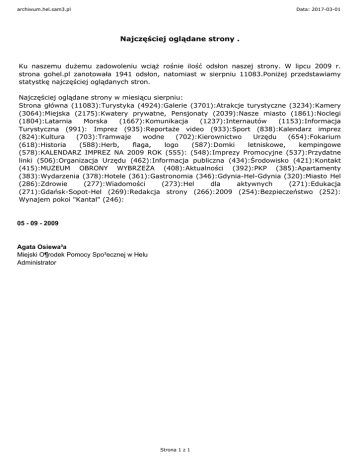 archiwum.hel.sam3.pl Data: 2017-03-01 Najczęściej oglądane strony . Ku naszemu dużemu zadowoleniu wciąż rośnie ilość odsłon naszej strony. W lipcu 2009 r. strona gohel.pl zanotowała 1941 odsłon, natomiast w sierpniu 11083.Poniżej przedstawiamy statystkę najczęściej oglądanych stron. Najczęściej oglądane strony w miesiącu sierpniu: Strona główna (11083):Turystyka (4924):Galerie (3701):Atrakcje turystyczne (3234):Kamery (3064):Miejska (2175):Kwatery prywatne, Pensjonaty (2039):Nasze miasto (1861):Noclegi (1804):Latarnia Morska (1667):Komunikacja (1237):Internautów (1153):Informacja Turystyczna (991): Imprez (935):Reportaże video (933):Sport (838):Kalendarz imprez (824):Kultura (703):Tramwaje wodne (702):Kierownictwo Urzędu (654):Fokarium (618):Historia (588):Herb, flaga, logo (587):Domki letniskowe, kempingowe (578):KALENDARZ IMPREZ NA 2009 ROK (555): (548):Imprezy Promocyjne (537):Przydatne linki (506):Organizacja Urzędu (462):Informacja publiczna (434):Środowisko (421):Kontakt (415):MUZEUM OBRONY WYBRZEŻA (408):Aktualności (392):PKP (385):Apartamenty (383):Wydarzenia (378):Hotele (361):Gastronomia (346):Gdynia-Hel-Gdynia (320):Miasto Hel (286):Zdrowie (277):Wiadomości (273):Hel dla aktywnych (271):Edukacja (271):Gdańsk-Sopot-Hel (269):Redakcja strony (266):2009 (254):Bezpieczeństwo (252): Wynajem pokoi "Kantal" (246): 05 - 09 - 2009 Agata Osiewa³a Miejski O¶rodek Pomocy Spo³ecznej w Helu Administrator Strona 1 z 1