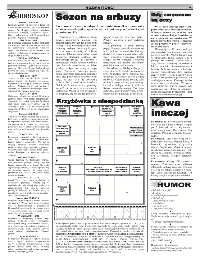 ROZMAITOŚCI HOROSKOP Baran 21.03-19.04 Gwiazdy wróżą Ci sukcesy i tylko od Ciebie będzie zależało, czy wykorzystasz szansę. W drugiej połowie miesiąca odczujesz silniejszy przypływ uczuć. Osoby wolne mogą znaleźć swoją drugą połówkę. Poprawa w finansach. Byk 20.04-20.05 Na początku miesiąca będzie rozpierać Cię energia. Jest to więc dobry moment na załatwienie wszystkich ważnych spraw. Ale trzymaj się za kieszeń i nie szalej z wydatkami, bo możesz wpaść w długi. Dobre zdrowie. Bliźnięta 21.05-21.06 Unikaj sytuacji konfliktowych, bo trudno będzie o kompromis. Lepiej otwórz się na problemy bliskich i gdzie tylko można, pomagaj. Dla uczuć lepsza będzie druga połowa miesiąca. Rozglądaj się więc, czy nie nadchodzi miłość. Rak 22.06-22.07 Słońce zacznie wokół Ciebie świecić jaśniej i zrobi się bardzo przyjemnie. Będziesz miał okazję do podróży i dobrej zabawy. Wykorzystaj to. Ale zadbaj o zdrowie, bo ostatnio lekceważysz lekarskie kontrole. Finanse w normie. Lew 23.07-22.08 Najbliższy miesiąc to zapowiedź niespodzianek, także tych mniej przyjemnych. Spokojnie przeczekaj trudności. W finansach spory ruch, który zmusi Cię do zaciśnięcia pasa. A w uczuciach pełnia szczęścia. Będzie też nowa interesująca znajomość. Panna 23.08-22.09 Twoje życie wciąż układa się ciekawie. Być może w najbliższym miesiącu będzie to zapowiedź podróży albo nowa miłość. Na pewno obok Ciebie jest ktoś, kto pomoże w każdej sytuacji. Nie martw się więc brakami w domowej kasie. Zdrowie dobre. Waga 23.09-22.10 Początkowo wrzesień wyda Ci się miesiącem dość bezbarwnym. Dominować będzie praca i obowiązki. Ale już w drugiej dekadzie możesz oczekiwać zmian, a więc wizyt, spotkań, wyjazdów. Wokół Ciebie pojawi się też kilku adoratorów. Pamiętaj, by dokonać dobrego wyboru. Skorpion 23.10-21.11 Wciąż będziesz w doskonałej formie, więc jeśli teraz planujesz urlop, spędzisz bardzo udany okres w życiu. Gwiazdy zapowiadają zmiany, a zatem spodziewaj się gorącego uczucia. W pracy nieco przesunięć korzystnych dla Ciebie. Może nawet podwyżka. Strzelec 22.11-21.12 Przed Tobą dosyć dużo wydatków, a dodatkowe pieniądze rozejdą się w mgnieniu oka. Nie planuj więc większych przedsięwzięć. Ten miesiąc najlepiej poświęcić bliskim. W Twoim związku przydałoby się też trochę więcej romantyzmu. Zdrowie lepsze. Koziorożec 22.12-19.01 Pomyślna aura dotyczyć będzie zwłaszcza rodziny. Warto więc teraz porozmawiać z domownikami o codziennych kłopotach i rozwiązać je. A w pracy dużo więcej obowiązków, ale i wysoka ocena szefa. Skontroluj zdrowie. Wodnik 20.01-18.02 Będziesz w doskonałej formie, więc możesz podnieść sobie poprzeczkę, zwłaszcza w pracy. Przełożeni to docenią. A w domu nie zapominaj o rodzinnych uroczystościach, mały prezent sprawi wiele radości ukochanemu. Finanse dobre. Ryby 19.02-20.03 Podejmując decyzje, nie bądź w gorącej wodzie kąpany. Unikaj zaangażowania się w niepewne przedsięwzięcia i nie pozwól złamać sobie serca. Oczekuj dobrej wiadomości pod koniec miesiąca. Odezwij się do przyjaciół. 9 Sezon na arbuzy Tych owoców mamy w sklepach pod dostatkiem. O tej porze roku arbuz wspaniale gasi pragnienie, ale i chroni nas przed szkodliwymi promieniami UV. wywać wspaniałe arbuzowe sałatki. Przepisy na dwie z nich podajemy poniżej. 4 pomidory, 1 strąk zielonej papryki i spory kawałek arbuza oczyścić i pokroić w kosteczkę. Do tego dodać pokrojoną w paski sałatę lodową i wszystko wymieszać. Całość skropić sosem winegret i posypać uprażonymi na patelni orzeszkami pinii lub nasionami sezamu. Pół arbuza, po 20 dag malin, jeżyn i czereśni, po 2 gruszki, nektarynki i kiwi. Wszystko umyć, osuszyć, wydrylować, a większe owoce pokroić na kostki. Całość polać sosem, który robimy z soku z jednej pomarańczy, kieliszka białego wina i kieliszka likieru pomarańczowego. Tak przygotowany deser przykrywamy i wstawiamy na dwie godziny do lodówki. Najzdrowsze są arbuzy o intensywnie czerwonym miąższu. Im bardziej nasycony jest ich kolor, tym więcej w nich bezcennych przeciwutleniaczy. Arbuzy zawierają likopen, a także sporo witaminy C i betakarotenu. Chronią więc skórę przed zgubnymi skutkami opalania się. Spowalniają proces jej starzenia i zmniejszają ryzyko zachorowania na raka. Jedzenie arbuzów ma też niebagatelny wpływ na pracę naszego serca. Ponieważ zawierają potas, mogą korzystnie regulować ciśnienie krwi oraz prawidłowo ustawiać rytm serca. A przy tym nie powodują tycia, bo 100 g owoców ma zaledwie 300 kcal. A zatem arbuzy powinny znaleźć się w naszym codziennym jadłospisie. Można je jeść zwyczajnie w plastrach, ale można też przygoto- Krzyżówka z niespodzianką niespodzianką MIASTO NA TRASIE LESZNOKROTOSZYN PRZED KROBIĄ POWINNOŚĆ NP. STOP CYNKU (ZN) Z GLINEM (AL) SOLENIZANTKA Z 5 MAJA UKOŃCZENIA SZKOŁY 4 WYKŁADOWCA OBCEGO JĘZYKA NA UCZELNI 5 7 ŻAGLOWIEC O 33-5 MASZTACH ZWIJANA ZASŁONA WIECZNIE ZIELONE DRZEWO AFRYKI (DO 10M WYSKOŚCI) 1 OKIENNA 8 KONIEC REI ELEKTRYCZNA LUB BOMU LUB BASOWA 12 2 10 DOWÓDCA KRZYSZTOF … , WIELKI KANCLERZ LITEWSKI (XVII W.), BUDOWNICZY WIELKIEGO PAŁACU STATKU RYBACKIEGO 9 3 WARSZAWSKI BIBLIJNY KAPŁAN, WYCHOWAWCA PROROKA SAMUELA JEZIORO W ŚRODKOWEJ IRLANDII PIWO 13 11 1 11 2 3 1 4 2 2 12 5 Wiele osób pracuje przy komputerze lub przy sztucznym świetle. Wówczas zdarza się, że skóra pod oczami jest opuchnięta i zasiniaczona, a spojówki zaczerwienione. W takim przypadku trzeba koniecznie zrobić przerwę w pracy i przywrócić oczom blask. Wystarczy na 10 minut obłożyć powieki plasterkami ogórka, najlepiej prosto z lodówki. Można też zawinąć w chusteczkę kilka kostek lodu i położyć na powieki. Dobre efekty dają również kompresy ze świetlika lub z czarnej, niearomatyzowanej herbaty. Jeśli korzystamy z herbaty, m
