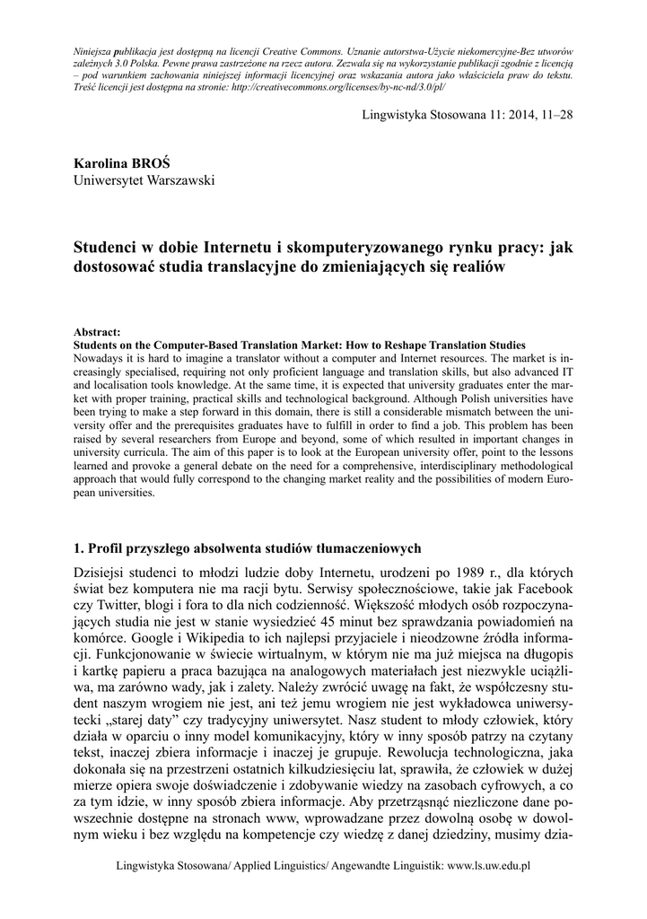 Niniejsza publikacja jest dostępną na licencji Creative Commons. Uznanie autorstwa-Użycie niekomercyjne-Bez utworów zależnych 3.0 Polska. Pewne prawa zastrzeżone na rzecz autora. Zezwala się na wykorzystanie publikacji zgodnie z licencją – pod warunkiem zachowania niniejszej informacji licencyjnej oraz wskazania autora jako właściciela praw do tekstu. Treść licencji jest dostępna na stronie: http://creativecommons.org/licenses/by-nc-nd/3.0/pl/ Lingwistyka Stosowana 11: 2014, 11–28 Karolina BROŚ Uniwersytet Warszawski Studenci w dobie Internetu i skomputeryzowanego rynku pracy: jak dostosować studia translacyjne do zmieniających się realiów Abstract: Students on the Computer-Based Translation Market: How to Reshape Translation Studies Nowadays it is hard to imagine a translator without a computer and Internet resources. The market is increasingly specialised, requiring not only proficient language and translation skills, but also advanced IT and localisation tools knowledge. At the same time, it is expected that university graduates enter the market with proper training, practical skills and technological background. Although Polish universities have been trying to make a step forward in this domain, there is still a considerable mismatch between the university offer and the prerequisites graduates have to fulfill in order to find a job. This problem has been raised by several researchers from Europe and beyond, some of which resulted in important changes in university curricula. The aim of this paper is to look at the European university offer, point to the lessons learned and provoke a general debate on the need for a comprehensive, interdisciplinary methodological approach that would fully correspond to the changing market reality and the possibilities of modern European universities. 1. Profil przyszłego absolwenta studiów tłumaczeniowych Dzisiejsi studenci to młodzi ludzie doby Internetu, urodzeni po 1989 r., dla których świat bez komputera nie ma racji bytu. Serwisy społecznościowe, takie jak Facebook czy Twitter, blogi i fora to dla nich codzienność. Większość młodych osób rozpoczynających studia nie jest w stanie wysiedzieć 45 minut bez sprawdzania powiadomień na komórce. Google i Wikipedia to ich najlepsi przyjaciele i nieodzowne źródła informacji. Funkcjonowanie w świecie wirtualnym, w którym nie ma już miejsca na długopis i kartkę papieru a praca bazująca na analogowych materiałach jest niezwykle uciążliwa, ma zarówno wady, jak i zalety. Należy zwrócić uwagę na fakt, że współczesny student naszym wrogiem nie jest, ani też jemu wrogiem nie jest wykładowca uniwersytecki „starej daty” czy tradycyjny uniwersytet. Nasz student to młody człowiek, który działa w oparciu o inny model komunikacyjny, który w inny sposób patrzy na czytany tekst, inaczej zbiera informacje i inaczej je grupuje. Rewolucja technologiczna, jaka dokonała się na przestrzeni ostatnich kilkudziesięciu lat, sprawiła, że człowiek w dużej mierze opiera swoje doświadczenie i zdobywanie wiedzy na zasobach cyfrowych, a co za tym idzie, w inny sposób zbiera informacje. Aby przetrząsnąć niezliczone dane powszechnie dostępne na stronach www, wprowadzane przez dowolną osobę w dowolnym wieku i bez względu na kompetencje czy wiedzę z danej dziedziny, musimy dziaLingwistyka Stosowana/ Applied Linguistics/ Angewandte Linguistik: www.ls.uw.edu.pl Karolina BROŚ 12 łać hasłowo. Wyszukując po słowach-kluczach, dokonujemy wstępnej selekcji, po czym skanując poszczególne strony, których tytuły wskazują na powiązanie z poszukiwanymi przez nas treściami, sprawdzamy ich przydatność i rzetelność, poszukujemy wiarygodnych źródeł, cytatów, szczegółów. Dogłębne czytanie całej treści danego artykułu to obecnie rzadkość, szczególnie wśród młodych ludzi, którzy „wychowali się w sieci” i wszystkie swoje działania społeczne opierają na prostych, skrótowych komunikatach, począwszy od SMS-a aż po „twitty”, memy i emotikony. Chcąc odpowiedzieć na potrzeby tych osób, musimy zacząć choć trochę mówić ich językiem i dostosować model uniwersytecki do znanego im modelu komunikacyjnego. Nie oznacza to bynajmniej, że mamy powiadamiać studentów o kolokwium SMS-em. Chodzi raczej o umożliwienie im świadomego i uzasadnionego korzystania z zasobów elektronicznych. W obliczu zachodzących zmian na rynku, który nieubłaganie idzie z duchem czasu i niepowstrzymanie wkracza na coraz to nowe ścieżki „wirtualnej wioski”, uniwersytet powinien postawić sobie za cel edukowanie młodych ludzi również w tym kierunku: wykształcanie w nich świadomości tego, że nie wszystko, co dostępne w Internecie ma wartość merytoryczną; kształtowania w nich umiejętności krytycznego spojrzenia na przerzucane na ekranie telefonu, tabletu czy komputera informacje. Odsiewanie z niekończących się zasobów tego, co naukowo wartościowe i terminologicznie zgodne z szukanym przez nas hasłem, jest zadaniem równie trudnym co krytyczna analiza dzieła drukowanego czy porównywanie artykułów, których autorzy reprezentują odrębne szkoły tej samej dyscypliny naukowej. Środowisko akademickie musi zaakceptować fakt, że w postępie technologicznym nie ma odwrotu, i student, choćby miał pod ręką drukowane słowniki, w większości przypadków wybierze opcję na skróty, posiłkując się przeglądarką czy słownikiem internetowym o wątpliwym pochodzeniu. Uczestnicy studiów o profilu tłumaczeniowym pracują i będą pracować za pośrednictwem komputera, a więc kluczowe jest dla nich spójne środowisko pracy, w którym wszystkie zasoby są dostępne w jednym miejscu, choćby za pomocą kliknięcia myszką. Jednakże postęp technologiczny nie dokonał się jedynie w umysłach młodzieży. Znajduje on bezpośrednie odzwierciedlenie w rynku, który wymaga umiejętności wykorzystania zasobów elektronicznych