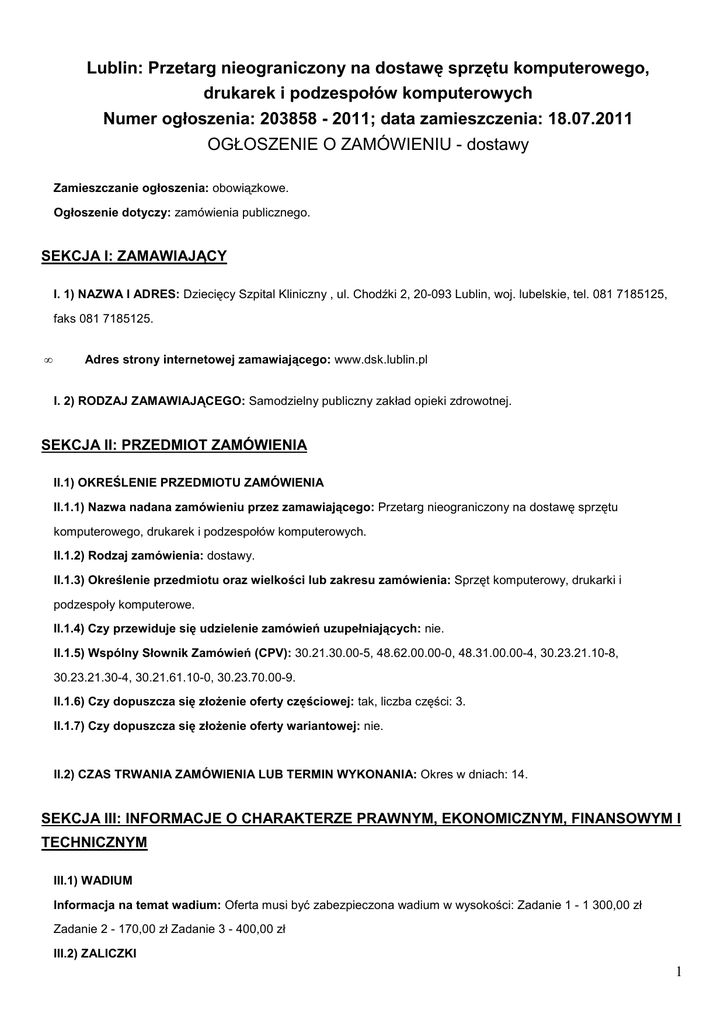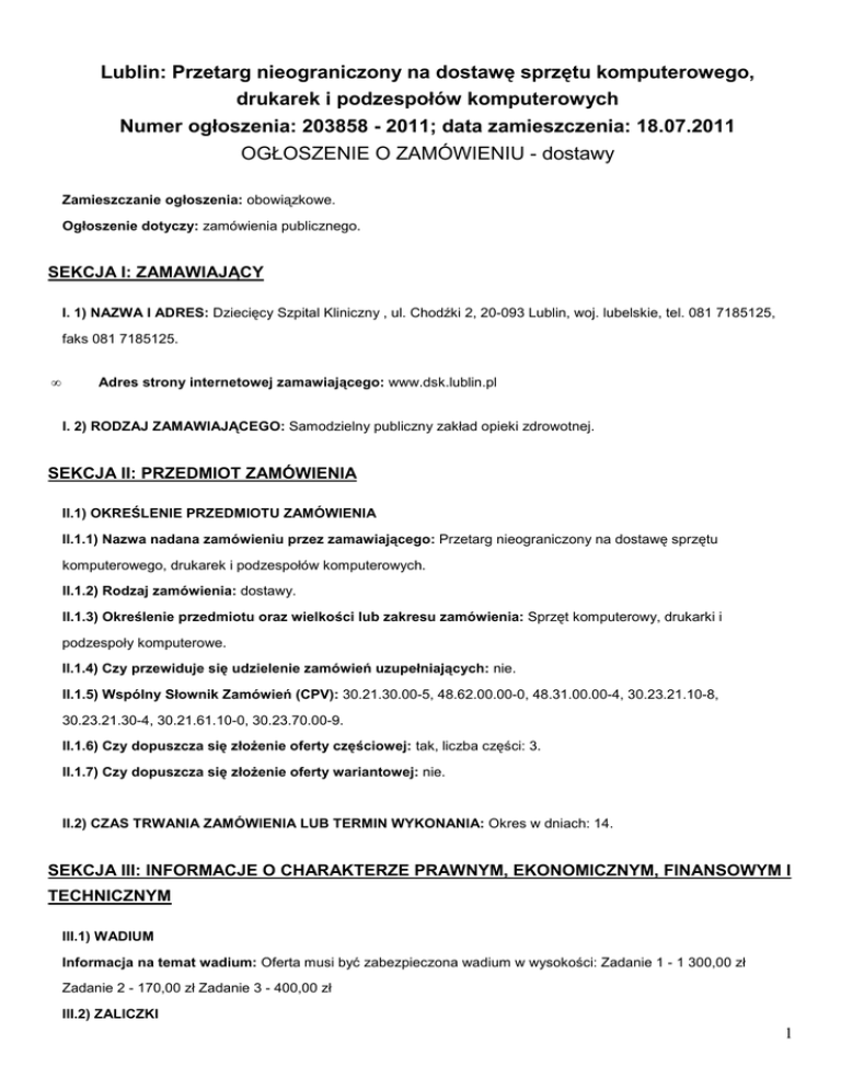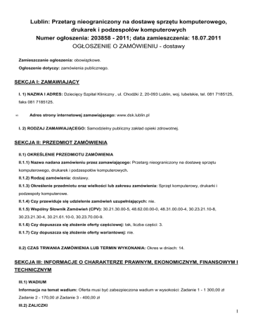 Lublin: Przetarg nieograniczony na dostawę sprzętu komputerowego, drukarek i podzespołów komputerowych Numer ogłoszenia: 203858 - 2011; data zamieszczenia: 18.07.2011 OGŁOSZENIE O ZAMÓWIENIU - dostawy Zamieszczanie ogłoszenia: obowiązkowe. Ogłoszenie dotyczy: zamówienia publicznego. SEKCJA I: ZAMAWIAJĄCY I. 1) NAZWA I ADRES: Dziecięcy Szpital Kliniczny , ul. Chodźki 2, 20-093 Lublin, woj. lubelskie, tel. 081 7185125, faks 081 7185125. • Adres strony internetowej zamawiającego: www.dsk.lublin.pl I. 2) RODZAJ ZAMAWIAJĄCEGO: Samodzielny publiczny zakład opieki zdrowotnej. SEKCJA II: PRZEDMIOT ZAMÓWIENIA II.1) OKREŚLENIE PRZEDMIOTU ZAMÓWIENIA II.1.1) Nazwa nadana zamówieniu przez zamawiającego: Przetarg nieograniczony na dostawę sprzętu komputerowego, drukarek i podzespołów komputerowych. II.1.2) Rodzaj zamówienia: dostawy. II.1.3) Określenie przedmiotu oraz wielkości lub zakresu zamówienia: Sprzęt komputerowy, drukarki i podzespoły komputerowe. II.1.4) Czy przewiduje się udzielenie zamówień uzupełniających: nie. II.1.5) Wspólny Słownik Zamówień (CPV): 30.21.30.00-5, 48.62.00.00-0, 48.31.00.00-4, 30.23.21.10-8, 30.23.21.30-4, 30.21.61.10-0, 30.23.70.00-9. II.1.6) Czy dopuszcza się złożenie oferty częściowej: tak, liczba części: 3. II.1.7) Czy dopuszcza się złożenie oferty wariantowej: nie. II.2) CZAS TRWANIA ZAMÓWIENIA LUB TERMIN WYKONANIA: Okres w dniach: 14. SEKCJA III: INFORMACJE O CHARAKTERZE PRAWNYM, EKONOMICZNYM, FINANSOWYM I TECHNICZNYM III.1) WADIUM Informacja na temat wadium: Oferta musi być zabezpieczona wadium w wysokości: Zadanie 1 - 1 300,00 zł Zadanie 2 - 170,00 zł Zadanie 3 - 400,00 zł III.2) ZALICZKI 1 • Czy przewiduje się udzielenie zaliczek na poczet wykonania zamówienia: nie III.3) WARUNKI UDZIAŁU W POSTĘPOWANIU ORAZ OPIS SPOSOBU DOKONYWANIA OCENY SPEŁNIANIA TYCH WARUNKÓW • III. 3.1) Uprawnienia do wykonywania określonej działalności lub czynności, jeżeli przepisy prawa nakładają obowiązek ich posiadania Opis sposobu dokonywania oceny spełniania tego warunku o Ocena spełniania tego warunku odbywać się będzie na podstawie treści złożonego oświadczenia Wykonawcy o spełnianiu warunków udziału w postępowaniu zawartych w art. 22 ust. 1 ustawy Pzp. • III.3.2) Wiedza i doświadczenie Opis sposobu dokonywania oceny spełniania tego warunku o Ocena spełniania tego warunku odbywać się będzie na podstawie treści złożonego oświadczenia Wykonawcy o spełnianiu warunków udziału w postępowaniu zawartych w art. 22 ust. 1 ustawy Pzp. • III.3.3) Potencjał techniczny Opis sposobu dokonywania oceny spełniania tego warunku o Ocena spełniania tego warunku odbywać się będzie na podstawie treści złożonego oświadczenia Wykonawcy o spełnianiu warunków udziału w postępowaniu zawartych w art. 22 ust. 1 ustawy Pzp. • III.3.4) Osoby zdolne do wykonania zamówienia Opis sposobu dokonywania oceny spełniania tego warunku o Ocena spełniania tego warunku odbywać się będzie na podstawie treści złożonego oświadczenia Wykonawcy o spełnianiu warunków udziału w postępowaniu zawartych w art. 22 ust. 1 ustawy Pzp. • III.3.5) Sytuacja ekonomiczna i finansowa Opis sposobu dokonywania oceny spełniania tego warunku o Ocena spełniania tego warunku odbywać się będzie na podstawie treści złożonego oświadczenia Wykonawcy o spełnianiu warunków udziału w postępowaniu zawartych w art. 22 ust. 1 ustawy Pzp. III.4) INFORMACJA O OŚWIADCZENIACH LUB DOKUMENTACH, JAKIE MAJĄ DOSTARCZYĆ WYKONAWCY W CELU POTWIERDZENIA SPEŁNIANIA WARUNKÓW UDZIAŁU W POSTĘPOWANIU ORAZ NIEPODLEGANIA WYKLUCZENIU NA PODSTAWIE ART. 24 UST. 1 USTAWY • III.4.1) W zakresie wykazania spełniania przez wykonawcę warunków, o których mowa w art. 22 ust. 1 ustawy, oprócz oświadczenia o spełnieniu warunków udziału w postępowaniu, należy przedłożyć: • III.4.2) W zakresie potwierdzenia niepodlegania wykluczeniu na podstawie art. 24 ust. 1 ustawy, należy przedłożyć: • oświadczenie o braku podstaw do wykluczenia • aktualny odpis z właściwego rejestru, jeżeli odrębne przepisy wymagają wpisu do rejestru, w celu wykazania braku podstaw do wykluczenia w oparciu o art. 24 ust. 1 pkt 2 ustawy, wystawiony nie wcześniej niż 6 miesięcy przed upływem terminu składania wniosków o dopuszczenie do udziału w 2 postępowaniu o udzielenie zamówienia albo składania ofert, a w stosunku do osób fizycznych oświadczenie w zakresie art. 24 ust. 1 pkt 2 ustawy • III.4.3) Dokumenty podmiotów zagranicznych Jeżeli wykonawca ma siedzibę lub miejsce zamieszkania poza terytorium Rzeczypospolitej Polskiej, przedkłada: III.4.3.1) dokument wystawiony w kraju, w którym ma siedzibę lub miejsce zamieszkania potwierdzający, że: • nie otwarto jego likwidacji ani nie ogłoszono upadłości - wystawiony nie wcześniej niż 6 miesięcy przed upływem terminu składania wniosków o dopuszczenie do udziału w postępowaniu o udzielenie zamówienia albo składania ofert III.5) INFORMACJA O DOKUMENTACH POTWIERDZAJĄCYCH, ŻE OFEROWANE DOSTAWY , USŁUGI LUB ROBOTY BUDOWLANE ODPOWIADAJĄ OKREŚLONYM WYMAGANIOM W zakresie potwierdzenia, że oferowane dostawy, usługi lub roboty budowlane odpowiadają określonym wymaganiom należy przedłożyć: • inne dokumenty Parametry techniczne oferowanego sprzętu zgodnie z tabelą załączoną do SIWZ (zalacznik nr 6). III.7) Czy ogranicza się możliwość ubiegania się o zamówienie publiczne tylko dla wykonawców, u których ponad 50 % pracowników stanowią osoby niepełnosprawne: nie SEKCJA IV: PROCEDURA IV.1) TRYB UDZIELENIA ZAMÓWIENIA IV.1.1) Tryb udzielenia zamówienia: przetarg nieograniczony. IV.2) KRYTERIA OCENY OFERT IV.2.1) Kryteria oceny ofert: cena oraz dodatkowe kryteria i ich znaczenie: • 1 - Cena - 70 • 2 - Gwarancja - 30 IV.2.2) Czy przeprowadzona będzie aukcja elektroniczna: nie. IV.3) ZMIANA UMOWY Czy przewiduje się istotne zmiany postanow