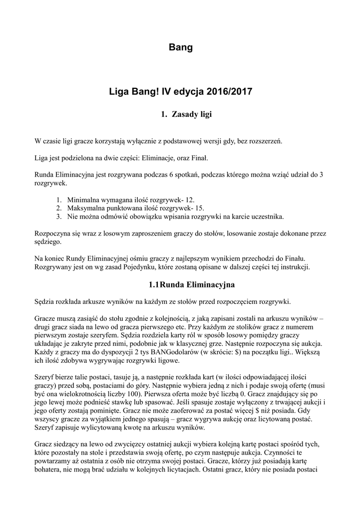 Bang Liga Bang! IV edycja 2016/2017 1. Zasady ligi W czasie ligi gracze korzystają wyłącznie z podstawowej wersji gdy, bez rozszerzeń. Liga jest podzielona na dwie części: Eliminacje, oraz Finał. Runda Eliminacyjna jest rozgrywana podczas 6 spotkań, podczas którego można wziąć udział do 3 rozgrywek. 1. Minimalna wymagana ilość rozgrywek- 12. 2. Maksymalna punktowana ilość rozgrywek- 15. 3. Nie można odmówić obowiązku wpisania rozgrywki na karcie uczestnika. Rozpoczyna się wraz z losowym zaproszeniem graczy do stołów, losowanie zostaje dokonane przez sędziego. Na koniec Rundy Eliminacyjnej ośmiu graczy z najlepszym wynikiem przechodzi do Finału. Rozgrywany jest on wg zasad Pojedynku, które zostaną opisane w dalszej części tej instrukcji. 1.1Runda Eliminacyjna Sędzia rozkłada arkusze wyników na każdym ze stołów przed rozpoczęciem rozgrywki. Gracze muszą zasiąść do stołu zgodnie z kolejnością, z jaką zapisani zostali na arkuszu wyników – drugi gracz siada na lewo od gracza pierwszego etc. Przy każdym ze stolików gracz z numerem pierwszym zostaje szeryfem. Sędzia rozdziela karty ról w sposób losowy pomiędzy graczy układając je zakryte przed nimi, podobnie jak w klasycznej grze. Następnie rozpoczyna się aukcja. Każdy z graczy ma do dyspozycji 2 tys BANGodolarów (w skrócie: $) na początku ligi.. Większą ich ilość zdobywa wygrywając rozgrywki ligowe. Szeryf bierze talie postaci, tasuje ją, a następnie rozkłada kart (w ilości odpowiadającej ilości graczy) przed sobą, postaciami do góry. Następnie wybiera jedną z nich i podaje swoją ofertę (musi być ona wielokrotnością liczby 100). Pierwsza oferta może być liczbą 0. Gracz znajdujący się po jego lewej może podnieść stawkę lub spasować. Jeśli spasuje zostaje wyłączony z trwającej aukcji i jego oferty zostają pominięte. Gracz nie może zaoferować za postać więcej $ niż posiada. Gdy wszyscy gracze za wyjątkiem jednego spasują – gracz wygrywa aukcję oraz licytowaną postać. Szeryf zapisuje wylicytowaną kwotę na arkuszu wyników. Gracz siedzący na lewo od zwycięzcy ostatniej aukcji wybiera kolejną kartę postaci spośród tych, które pozostały na stole i przedstawia swoją ofertę, po czym następuje aukcja. Czynności te powtarzamy aż ostatnia z osób nie otrzyma swojej postaci. Gracze, którzy już posiadają kartę bohatera, nie mogą brać udziału w kolejnych licytacjach. Ostatni gracz, który nie posiada postaci bierze tą, która pozostała płacąc za nią 0$. Jeśli gracz nie posiada $, w czasie każdej z aukcji musi pasować i bierze ostatnią kartę, która pozostałą na stole. Jeśli więcej niż jedna osoba nie ma w swojej puli $, wówczas gracze Ci po fazie licytacji wybierają swoje postacie spośród pozostałych wg kolejności na arkuszu wyników. Gdy wszyscy mają swoich bohaterów, rozpoczyna się gra. Na koniec gry gracze przywołują do swojego stolika sędziów. Ten, przy pomocy graczy, uzupełnia arkusz wyników o role graczy oraz warunek zakończenia gry (np. Bandyci wygrali, Szeryf żyje etc.) Każdy z graczy zdobywa ilość $ wg poniższych tabel wyników. Zdobyte w ten sposób $ gracze mogą użyć w czasie kolejnych licytacji. Wynik gracza na koniec Rundy Eliminacyjnej to jego początkowe 2 tys $ + suma $ zdobyta w czasie rozgrywek – suma $ wydana w czasie licytacji. Sędziowie rejestrują wyniki w BANG! Menadżer Ligowy. Gdy dane zostaną wprowadzone, program automatycznie dokona zmian w liście rankingowej. Tabele wyników Każdy z graczy otrzymuje $, w zależności od jego roli oraz wyniku rozgrywki, na podstawie poniższych tabel: Prawo wygrało Bandyci wygrali Wygrał Renegat Po zakończeniu rozgrywki sędziowie przygotowują wszystko na kolejną rundę. 1.2Finały Na koniec Rundy Eliminacyjnej sędziowie ogłaszają ranking graczy biorących w niej udział. Ośmiu najlepszych graczy przechodzi do półfinałowych pojedynków (1-szy z 8-mym, 2-gi z 7-mym itd.). Zwycięzcy pojedynków półfinałowych będą walczyć ze sobą w finale o 1-sze i 2-gie miejsce. Pojedynek „długi” Nie ma konieczności przydzielania ról. Gracz bierze wszystkie karty postaci (16), usuwa spośród nich w sposób losowy 6 kart, a pozostałe 10 rozkłada na stole odkryte. W każdym z pojedynków gracz, który był sklasyfikowany wyżej w rankingu Rundy Eliminacyjnej musi wybrać czy chcę wybierać jako pierwszy czy też zaczynać jako pierwszy (niewybrana opcja automatycznie zostaje wybrana przez jego przeciwnika). Jeśli gracz zdecyduje się wybierać jako pierwszy, wówczas wybiera on jedną z postaci leżących na stole obrazkiem do góry. Następnie drugi gracz wybiera jedną z pozostałych 9 postaci. Gracze wybierają postacie na przemian aż pula kart nie ulegnie wyczerpaniu, a każdy z nich będzie w posiadaniu 5 kart postaci. Każdy z graczy układa swoje karty postaci w zakryty stos, układając karty w nim w dowolny sposób. Po złożeniu stosu przekładanie kart w stosie nie jest możliwe. Każdy z graczy odsłania 2 postacie znajdujące się na wierzchu stosu i wybiera która z nich będzie znajdowała się z przodu (bliżej środka stołu), a która będzie trzymać się z tyłu (bliżej gracza). Pozostałe postacie pozostają zakryte w stosie i są „posiłkami” i pozostają gotowe do wejścia na tyłu jeśli jedna lub obydwie postacie zostaną zabite. Gracze rozpoczynają z ilością kart, jakie normalnie otrzymała postać znajdująca się z przodu. Celem pojedynku jest wyeliminowanie wszystkich postaci przeciwnika. Rozgrywka toczy się wg standardowych zasad z następującymi modyfikacjami: Na początku tury, po rozpatrzeniu efektów Więzienia i Dynamitu, ale przed dobraniem kart, gracz może zdecydować się zamienić swoje postacie miejscami; Podczas swojej kolejki gracz może korzystać jedynie ze zdolności postaci, która znajduje się z przodu. Zdolność drugiej postaci jest ignorowana. Jednak