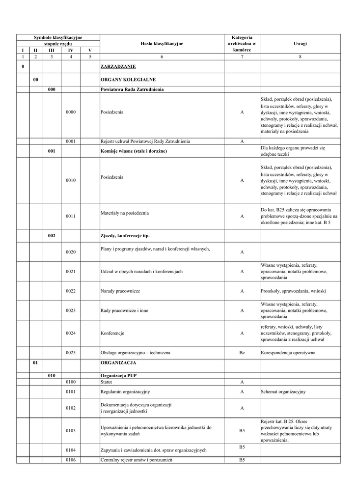 I 1 Symbole klasyfikacyjne stopnie rzędu II III IV 2 3 4 Hasła klasyfikacyjne V 5 6 Kategoria archiwalna w komórce 7 Uwagi 8 ZARZĄDZANIE 0 00 ORGANY KOLEGIALNE 000 Powiatowa Rada Zatrudnienia Skład, porządek obrad (posiedzenia), 0000 Posiedzenia A 0001 Rejestr uchwał Powiatowej Rady Zatrudnienia A Dla każdego organu prowadzi się odrębne teczki Komisje własne (stałe i doraźne) 001 lista uczestników, referaty, głosy w dyskusji, inne wystąpienia, wnioski, uchwały, protokoły, sprawozdania, stenogramy i relacje z realizacji uchwał, materiały na posiedzenia Skład, porządek obrad (posiedzenia), 0010 0011 002 Posiedzenia Materiały na posiedzenia A A lista uczestników, referaty, głosy w dyskusji, inne wystąpienia, wnioski, uchwały, protokoły, sprawozdania, stenogramy i relacje z realizacji uchwał Do kat. B25 zalicza się opracowania problemowe sporzą-dzone specjalnie na określone posiedzenia; inne kat. B 5 Zjazdy, konferencje itp. 0020 Plany i programy zjazdów, narad i konferencji własnych, A 0021 Udział w obcych naradach i konferencjach A Własne wystąpienia, referaty, opracowania, notatki problemowe, sprawozdania 0022 Narady pracownicze A Protokoły, sprawozdania, wnioski 0023 Rady pracownicze i inne A Własne wystąpienia, referaty, opracowania, notatki problemowe, sprawozdania 0024 Konferencje A referaty, wnioski, uchwały, listy uczestników, stenogramy, protokoły, sprawozdania z realizacji uchwał 0025 Obsługa organizacyjno – techniczna Bc Korespondencja operatywna 01 ORGANIZACJA 010 0100 Organizacja PUP Statut A 0101 Regulamin organizacyjny A 0102 Dokumentacja dotycząca organizacji i reorganizacji jednostki A 0103 Upoważnienia i pełnomocnictwa kierownika jednostki do wykonywania zadań B5 0104 Zapytania i zawiadomienia dot. spraw organizacyjnych 0106 Centralny rejestr umów i porozumień B5 B5 Schemat organizacyjny Rejestr kat. B 25. Okres przechowywania liczy się daty utraty ważności pełnomocnictwa lub upoważnienia. 011 0140 Akty normatywne PUP Uchwały Zarządzenia Dyrektora PUP Akty normatywne organów nadrzędnych PUP Zarządzenia Zarządu Starostwa Uchwały Zarządu Starostwa Zarządzenia Starosty Decyzje Starosty Udostępnianie informacji publicznej, danych osobowych, danych statystycznych Ewidencja osób dopuszczonych do przetwarzania danych osobowych Centralny rejestr udostępnianej informacji publicznej Centralny rejestr udostępnianych danych osobowych Rejestr udostępnianych danych statystycznych Informatyka Ewidencja systemów i programów 0141 Licencje na oprogramowanie 0110 0111 012 0120 0121 0122 0123 013 0130 0131 0132 0133 014 0142 Eksploatacja systemów informatycznych w PUP Eksploatacja systemów informatycznych, systemów 01420 ewidencjonowania informacji, nośników i kopii bezpieczeństwa oraz archiwizowania zbiorów danych Zbiory informacji zgromadzonych na nośnikach 01421 informatycznych Zabezpieczenie techniczne i materiałowe eksploatacji 01422 systemów 01423 Wspomaganie użytkowników systemu /konsultacje i szkolenia/ A A B10 B10 B10 B10 dotyczące PUP kat. A dotyczące PUP kat. A dotyczące PUP kat. A dotyczące PUP kat. A B5 B5 B5 B5 B5 B5 Okres przechowywania liczy się od momentu wygaśnięcia umowy licencyjnej B10 Dokumentacja dotycząca zmian w systemie informacyjnym B5 B5 Dokumentacja konserwacji sprzętu B5 Materiały szkoleniowe, wytyczne i instrukcje dla użytkowników Zakup sprzętu komputerowego i usług informatycznych 0143 Wraz z rejestrem, karty na zarząd Wraz z rejestrem Korespondencja manipulacyjna kat. Bc 01430 Zamówienia i dostawa sprzętu komputerowego i usług informatycznych B5 Zlecenia, umowy, specyfikacja wymagań sprzętowo - komputerowych, protokoły odbioru, 01431 Kasacja i upłynnianie sprzętu komputerowego i nośników elektronicznych oraz materiałów eksploatacyjnych B10 Oceny, ekspertyzy, protokoły B5 Dokumentacja techniczna sprzętu, oprogramowanie, gwarancje 01432 Dokumentacja wymagań sprzętowo-programowych Dokumentacja dotycząca wydatków na przedsięwzięcia informatyczne B5 0144 Ustalanie uprawnień dostępu do danych i systemów B5 Okres przechowywania liczy się od daty utraty uprawnień 0145 Bezpieczeństwo systemów informatycznych B5 Dotyczy spraw włamania do systemów i złego użytkowania; notatki, protokoły, korespondencja, decyzje o blokadzie dostępu do systemów 01433 02 020 0200 0201 0202 0203 0204 0205 0206 0207 021 ORGANIZACJA BIUROWOŚCI, SKŁADNICA AKT, BIBLIOTEKA Instrukcje, rejestry Instrukcja kancelaryjna, Instrukcja obiegu dokumentów finansowych, Instrukcja organizacji i zakresu działania archiwum zakładowego, Jednolity rzeczowy wykaz akt, Dzienniki korespondencji, Pocztowe książki nadawcze, Rejestry przesyłek zwykłych, Rejestr poczty elektronicznej A A A A B5 B5 B5 B5 Składnica akt 0210 Wykaz spisów zdawczo – odbiorczych A 0211 Spisy zdawczo – odbiorcze dokumentacji przekazanej do składnicy akt A 0212 Udostępnianie i wypożyczanie dokumentacji niearchiwalnej B5 Zezwolenia, karty i rejestry udostępnianych akt 0213 Brakowanie dokumentacji niearchiwalnej A Korespondencja, protokoły oceny dokumentacji niearchiwalnej, spisy dokumentacji przekazywanej na makulaturę, protokoły potwierdzające zniszczenie dokumentacji 0214 Przekazywanie dokumentacji A Korespondencja i spisy akt przekazanych do innych instytucji, tj. do archiwum państwowego, ZUS 0215 Skontrum dokumentacji aktowej Biblioteka Regulamin biblioteki Inwentarze zbiorów Ewidencja wypożyczeń Dowody wpływów i ubytków Skontrum zbiorów A 022 0220 0221 0222 0223 0224 023 A A B3 B10 A Formularze i druki 0230 Rejestr druków powszechnego użytku, B3 0231 Rejestr druków ścisłego zarachowania Pieczęcie i tablice Ewidencja wzorów pieczęci i pieczątek Ewidencja tablic OBSŁUGA PRAWNA, SKARGI I WNIOSKI Interpretacja przepisów prawnych B3 024 0240 0241 03 030 0300 Wykładnia (interpretacja) własnych aktów normatywnych dotyczących merytorycznej działalności A A A 0301 Opin
