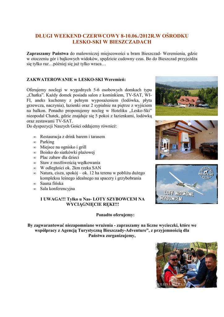DŁUGI WEEKEND CZERWCOWY 8-10.06./2012R.W OŚRODKU LESKO-SKI W BIESZCZADACH Zapraszamy Państwa do malowniczej miejscowości u bram Bieszczad- Weremienia, gdzie w otoczeniu gór i bajkowych widoków, spędzicie cudowny czas. Bo do Bieszczad przyjeżdża się tylko raz…później się już tylko wraca… ZAKWATEROWANIE w LESKO-SKI Weremień: Oferujemy noclegi w wygodnych 5-6 osobowych domkach typu „Chatka”. Każdy domek posiada salon z kominkiem, TV-SAT, WIFI, aneks kuchenny z pełnym wyposażeniem (lodówka, płyta grzewcza, naczynia), łazienki oraz 2 sypialnie na piętrze z wyjściem na balkon. Ponadto proponujemy nocleg w Hoteliku „Lesko-Ski” nieopodal Chatek, gdzie znajduje się 5 pokoi z łazienkami, lodówką oraz zestawami TV-SAT. Do dyspozycji Naszych Gości oddajemy również: • • • • • • • • • • Restauracja z drink barem i tarasem Parking Miejsce na ognisko i grill Boisko do siatkówki plażowej Plac zabaw dla dzieci Staw z możliwością wędkowania W odległości ok. 2km rzeka SAN Natura, cisza, spokój – ok. 12 ha terenu w pobliżu dużego kompleksu leśnego idealnego na spacery i grzybobrania Sauna fińska Sala konferencyjna I UWAGA!!! Tylko u Nas- LOTY SZYBOWCEM NA WYCIĄGNIĘCIE RĘKI!!! Ponadto oferujemy: By zagwarantować niezapomniane wrażenia - zapraszamy na liczne wycieczki, które we współpracy z Agencją Turystyczną Bieszczady-Adventure”, z przyjemnością dla Państwa zorganizujemy, WCZASY RODZINNE W BIESZCZADACH!!! Zapraszamy Państwa do malowniczej miejscowości u bram BieszczadWeremienia, gdzie w otoczeniu gór i bajkowych widoków, spędzicie cudowny czas. Bo do Bieszczad przyjeżdża się tylko raz…później się już tylko wraca… ZAKWATEROWANIE w LESKO-SKI Weremień: Oferujemy noclegi w wygodnych 5-6 osobowych domkach typu „Chatka”. Każdy domek posiada salon z kominkiem, TV-SAT, WIFI, aneks kuchenny z pełnym wyposażeniem (lodówka, płyta grzewcza, naczynia), łazienki oraz 2 sypialnie na piętrze z wyjściem na balkon. Ponadto proponujemy nocleg w Hoteliku „Lesko-Ski” nieopodal Chatek, gdzie znajduje się 5 pokoi z łazienkami, lodówką oraz zestawami TV-SAT. Do dyspozycji Naszych Gości oddajemy również: • • • • • • • • • • Restauracja z drink barem i tarasem Parking Miejsce na ognisko i grill Boisko do siatkówki plażowej Plac zabaw dla dzieci Staw z możliwością wędkowania W odległości ok. 2km rzeka SAN Natura, cisza, spokój – ok. 12 ha terenu w pobliżu dużego kompleksu leśnego idealnego na spacery i grzybobrania Sauna fińska Sala konferencyjna I UWAGA!!! Tylko u Nas- LOTY SZYBOWCEM NA WYCIĄGNIĘCIE RĘKI!!! Ponadto oferujemy: By zagwarantować niezapomniane wrażenia - zapraszamy na liczne wycieczki, które we współpracy z Agencją Turystyczną Bieszczady-Adventure”, z przyjemnością dla Państwa zorganizujemy, zapewniając 10% RABATU na każdą z wybranych atrakcji- wyłącznie dla WAS! WYCIECZKI: - Traperska Wyprawa w Bieszczady - Szlakiem Ikon w Dolinie Sanu - Lwów- Miasto Wspomnień - Węgry Winnym Szlakiem Marzycie o Extremalnych przeżyciach, zasmakowaniu prawdziwie Bieszczadzkiej Przygody? Zapraszamy na: - Wilczym Tropem- wyprawy 4x4 - Przejażdżki quadami - Paintball - Techniki linowe - Zorbing - Spływ pontonowy KOSZT: DOMKI- 1400zł/domek – cena zawiera 7- dniowy pobyt w komfortowym 5-6os. Domku typu „Chatka”, z aneksem kuchennym, balkonem, salonem z kominkiem, pełnym węzłem sanitarnym i TV SAT!!! Istnieje możliwość wykupienia smacznych posiłków w Naszej Restauracji: PAKIET HB 245zł/os.; dla dzieci od lat 4-16 RABAT- 220zł/os., cena zawiera: - 7 śniadań - 6 obiadokolacji - 1 obiadokolacja z grilla Informujemy, iż turnusy rozpoczynają się w cyklach 7-dniowych od 30.06.2012. ZAPRASZAMY!!!