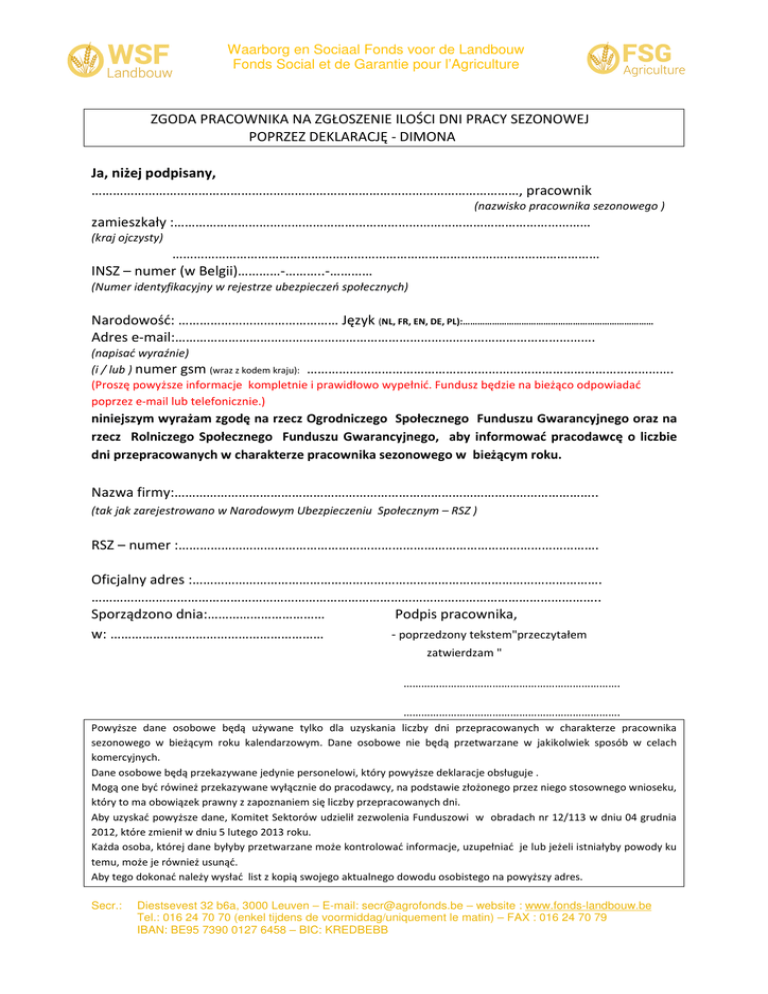 Waarborg en Sociaal Fonds voor de Landbouw Fonds Social et de Garantie pour l’Agriculture ZGODA PRACOWNIKA NA ZGŁOSZENIE ILOŚCI DNI PRACY SEZONOWEJ POPRZEZ DEKLARACJĘ - DIMONA Ja, niżej podpisany, …………………………………………………………………………………………………………, pracownik (nazwisko pracownika sezonowego ) zamieszkały :……………………………………………………………………………………………………… (kraj ojczysty) ………………………………………………………………………………………………………… INSZ – numer (w Belgii)…………-………..-………… (Numer identyfikacyjny w rejestrze ubezpieczeń społecznych) Narodowość: ……………………………………… Język (NL, FR, EN, DE, PL):…………………………………………………………………… Adres e-mail:………………………………………………………………………………………………………. (napisać wyraźnie) (i / lub ) numer gsm (wraz z kodem kraju): …………………………………………………………………………………………. (Proszę powyższe informacje kompletnie i prawidłowo wypełnić. Fundusz będzie na bieżąco odpowiadać poprzez e-mail lub telefonicznie.) niniejszym wyrażam zgodę na rzecz Ogrodniczego Społecznego Funduszu Gwarancyjnego oraz na rzecz Rolniczego Społecznego Funduszu Gwarancyjnego, aby informować pracodawcę o liczbie dni przepracowanych w charakterze pracownika sezonowego w bieżącym roku. Nazwa firmy:……………………………………………………………………………………………………….. (tak jak zarejestrowano w Narodowym Ubezpieczeniu Społecznym – RSZ ) RSZ – numer :………………………………………………………………………………………………………. Oficjalny adres :……………………………………………………………………………………………………. …………………………………………………………………………………………………………………………….. Sporządzono dnia:…………………………… Podpis pracownika, - poprzedzony tekstem"przeczytałem w: …………………………………………………… zatwierdzam " ………………………………………………………………. ………………………………………………………………. Powyższe dane osobowe będą używane tylko dla uzyskania liczby dni przepracowanych w charakterze pracownika sezonowego w bieżącym roku kalendarzowym. Dane osobowe nie będą przetwarzane w jakikolwiek sposób w celach komercyjnych. Dane osobowe będą przekazywane jedynie personelowi, który powyższe deklaracje obsługuje . Mogą one być rόwineż przekazywane wyłącznie do pracodawcy, na podstawie złożonego przez niego stosownego wnioseku, ktόry to ma obowiązek prawny z zapoznaniem się liczby przepracowanych dni. Aby uzyskać powyższe dane, Komitet Sektorόw udzielił zezwolenia Funduszowi w obradach nr 12/113 w dniu 04 grudnia 2012, ktόre zmienił w dniu 5 lutego 2013 roku. Każda osoba, której dane byłyby przetwarzane może kontrolować informacje, uzupełniać je lub jeżeli istniałyby powody ku temu, może je rόwnież usunąć. Aby tego dokonać należy wysłać list z kopią swojego aktualnego dowodu osobistego na powyższy adres. Secr.: Diestsevest 32 b6a, 3000 Leuven – E-mail: [email protected] – website : www.fonds-landbouw.be Tel.: 016 24 70 70 (enkel tijdens de voormiddag/uniquement le matin) – FAX : 016 24 70 79 IBAN: BE95 7390 0127 6458 – BIC: KREDBEBB