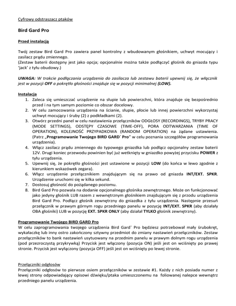 Cyfrowy odstraszacz ptaków Bird Gard Pro Przed instalacją Twój zestaw Bird Gard Pro zawiera panel kontrolny z wbudowanym głośnikiem, uchwyt mocujący i zasilacz prądu zmiennego. (Zestaw baterii dostępny jest jako opcja; opcjonalnie można także podłączyć głośnik do gniazda typu ‘jack’ z tyłu obudowy.) UWAGA: W trakcie podłączania urządzenia do zasilacza lub zestawu baterii upewnij się, że włącznik jest w pozycji OFF a pokrętło głośności znajduje się w pozycji minimalnej (LOW). Instalacja 1. Zaleca się umieszczać urządzenie na słupie lub powierzchni, która znajduje się bezpośrednio przed i na tym samym poziomie co obszar docelowy. 2. W celu zamocowania urządzenia na ścianie, słupie, płocie lub innej powierzchni wykorzystaj uchwyt mocujący i śruby (2) z podkładkami (2). 3. Otwórz przedni panel w celu nastawienia przełączników ODGŁOSY (RECORDINGS), TRYBY PRACY (MODE SETTINGS), ODSTĘPY CZASOWE (TIME-OFF), PORA ODTWARZANIA (TIME OF OPERATION), KOLEJNOŚĆ PRZYPADKOWA (RANDOM OPERATION) na żądane ustawienia. (Patrz „Programowanie Twojego BIRD GARD® Pro” w celu poznania szczegółów programowania urządzenia). 4. Włącz zasilacz prądu zmiennego do typowego gniazdka lub podłącz opcjonalny zestaw baterii 12V. Drugi koniec przewodu powinien być już wetknięty w gniazdko powyżej przycisku POWER z tyłu urządzenia. 5. Upewnij się, że pokrętło głośności jest ustawione w pozycji LOW (do końca w lewo zgodnie z kierunkiem wskazówek zegara). 6. Włącz urządzenie przełącznikiem znajdującym się na prawo od gniazda INT/EXT. SPKR. Urządzenie uruchomi się w kilka sekund. 7. Dostosuj głośność do pożądanego poziomu. 8. Bird Gard Pro pozwala na dodanie opcjonalnego głośnika zewnętrznego. Może on funkcjonować jako jedyny głośnik LUB razem z wewnętrznym głośnikiem znajdującym się z przodu urządzenia Bird Gard Pro. Podłącz głośnik zewnętrzny do gniazdka z tyłu urządzenia. Następnie przesuń przełącznik w prawym górnym rogu przedniego panelu w pozycję INT/EXT. SPKR (aby działały OBA głośniki) LUB w pozycję EXT. SPKR ONLY (aby działał TYLKO głośnik zewnętrzny). Programowanie Twojego BIRD GARD Pro W celu zaprogramowania twojego urządzenia Bird Gard® Pro będziesz potrzebował mały śrubokręt, wykałaczkę lub inny ostro zakończony sztywny przedmiot do zmiany nastawień przełączników. Zestaw przełączników to bank nastawień usytuowany na przednim panelu w prawym dolnym rogu urządzenia (pod przezroczystą przykrywką) Przycisk jest włączony (pozycja ON) jeśli jest on wciśnięty po prawej stronie. Przycisk jest wyłączony (pozycja OFF) jeśli jest on wciśnięty po lewej stronie. Przełączniki odgłosów Przełączniki odgłosów to pierwsze osiem przełączników w zestawie #1. Każdy z nich posiada numer z lewej strony odpowiadający opisowi dźwięku/ptaka umieszczonemu na foliowanej nalepce wewnątrz przedniego panelu urządzenia. Przełączniki trybu pracy Przełączniki trybu pracy to pięć ostatnich przełączników w zestawie #2. Kontrolują one różne tryby pracy: takie jak przedział czasu pomiędzy odtwarzaniem sygnałów odstraszających ptaki, to kiedy urządzenia ma działać (tylko w dzień, tylko w nocy, lub 24 godziny na dobę), oraz to czy urządzenie ma działać w trybie przypadkowości, czy w trybie normalnym. Przełącznik 1 2 3 4 5 Tryb lub funkcja Ustawia przedział czasu pomiędzy odtwarzaniem sekwencji dźwięków Ustawia przedział czasu pomiędzy odtwarzaniem sekwencji dźwięków Ustawia porę odtwarzania sekwencji dźwięków Ustawia porę odtwarzania sekwencji dźwięków Włącza i wyłącza tryb przypadkowości Przełączniki odstępu czasowego Dwa przełączniki odstępu czasowego znajdują się bezpośrednio pod przełącznikami odgłosów (RECORDINGS SWITCHES 1-8) w zestawie przełączników trybów pracy. Kiedy urządzenie ustawione jest w jednym z wielu trybów odstępu czasowego, pomiędzy odtwarzaniem odgłosów będą występowały okresy uśpienia o długości kilku sekund lub minut. Proszę zauważyć, że urządzenie będzie odtwarzało wszystkie wybrane dźwięki (zależnie od ustawień kolejności przypadkowej – kolejno lub w przypadkowej kolejności), potem przejdzie w tryb uśpienia. Długość tego okresu czasu zależy od ustawień przedziału czasu i ustawień kolejności przypadkowej. Jeśli urządzenia działa w trybie kolejności przypadkowej, okres uśpienia waha się do wartości minimalnej do maksymalnej w ramach danego ustawienia przedziału czasu. Jeśli urządzenie nie działa w trybie kolejności przypadkowej, okres uśpienia jest równy wartości minimalnej dla danego ustawienia przedziału czasu. Aby nastawić przedział czasowy (okres uśpienia) wykorzystaj następujące ustawienia przełączników 1 i 2 w ustawieniach funkcji. Przełącznik 1 ON OFF ON OFF Przełącznik 2 OFF ON ON OFF Przedział czasu Krótki (17-50 sekund) Średni (1-4 minut) Długi (5-10 minut) Bardzo długi (10-30 minut) Pora odtwarzania Dwa przełączniki ustawiania pory odtwarzania (dzień/24-godziny/noc) znajdują się tuż pod przełącznikami odstępu czasowego na zestawie przełączników. Urządzenie działa w trybie dziennym, nocnym lub stale (24 godziny na dobę). Jednak czujnik, który uruchamia się na światło słoneczne, podatny jest na jasne światło. Zadbaj o to aby nie kierować ostrego światła na urządzenie po to by działało ono właściwie. Aby nastawić porę działania urządzenia należy następująco ustawić przełączniki 3 i 4 w nastawieniach trybu: Przełącznik 3 ON OFF ON OFF Przełącznik 4 OFF ON ON OFF Tryb Tylko dzień (DAY ONLY) 24 na dobę (24-Hour) Tylko noc (NIGHT ONLY) Także tylko noc (NIGHT ONLY) Przełącznik kolejności przypadkowej Przełącznik kolejności przypadkowej znajduje się u dołu zestawu przełączników. Kiedy przełącznik jest ustawiony w pozycji odtwarzanie przypadkowego, urządz