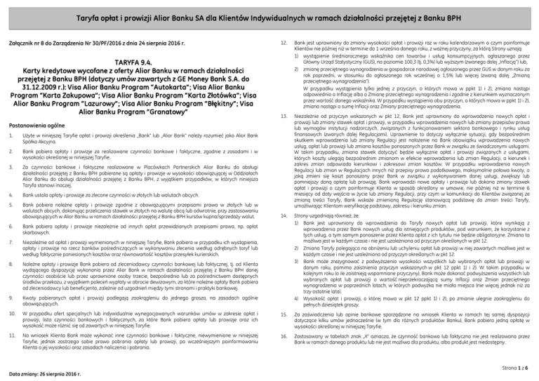 Taryfa opłat i prowizji Alior Banku SA dla Klientów Indywidualnych w ramach działalności przejętej z Banku BPH Załącznik nr 8 do Zarządzenia Nr 30/PF/2016 z dnia 24 sierpnia 2016 r. TARYFA 9.4. Karty kredytowe wycofane z oferty Alior Banku w ramach działalności przejętej z Banku BPH (dotyczy umów zawartych z GE Money Bank S.A. do 31.12.2009 r.): Visa Alior Banku Program “Autokarta”; Visa Alior Banku Program “Karta Zakupowa”; Visa Alior Banku Program “Karta Złotówka”; Visa Alior Banku Program “Lazurowy”; Visa Alior Banku Program “Błękitny”; Visa Alior Banku Program “Granatowy” 12. Bank jest uprawniony do zmiany wysokości opłat i prowizji raz w roku kalendarzowym o czym poinformuje Klientów nie później niż w terminie do 1 września danego roku, z ważnej przyczyny, za którą Strony uznają: 1) wystąpienie średniorocznego wskaźnika cen towarów i usług konsumpcyjnych, ogłaszanego przez Główny Urząd Statystyczny (GUS), na poziomie 100,3 (tj. 0,3%) lub wyższym (zwanego dalej „Inflacją”) lub, 2) zmianę przeciętnego wynagrodzenia w gospodarce narodowej ogłoszonego przez GUS w danym roku za rok poprzedni, w stosunku do ogłoszonego rok wcześniej o 1,5% lub więcej (zwaną dalej „Zmianą przeciętnego wynagrodzenia”). W przypadku wystąpienia tylko jednej z przyczyn, o których mowa w ppkt 1) i 2), zmiana nastąpi odpowiednio o Inflację albo o Zmianę przeciętnego wynagrodzenia i zgodnie z kierunkiem wyznaczonym przez wartość danego wskaźnika. W przypadku wystąpienia obu przyczyn, o których mowa w ppkt 1) i 2), zmiana nastąpi o sumę Inflacji oraz Zmiany przeciętnego wynagrodzenia. 13. Niezależnie od przyczyn wskazanych w pkt 12, Bank jest uprawniony do wprowadzenia nowych opłat i prowizji lub zmiany stawek opłat i prowizji, w przypadku wprowadzenia nowych lub zmiany przepisów prawa lub wymogów instytucji nadzorczych, związanych z funkcjonowaniem sektora bankowego i rynku usług finansowych (zwanych dalej Regulacjami). Uprawnienie to dotyczy wyłącznie sytuacji, gdy bezpośrednim skutkiem wprowadzenia lub zmiany Regulacji jest nałożenie na Bank obowiązku wprowadzenia nowych usług, opłat lub prowizji lub zmiana kosztów ponoszonych przez Bank w związku ze świadczonymi usługami. W takim przypadku, zmiana stawek dotyczyć będzie wyłącznie opłat i prowizji związanych z usługami, których koszty ulegają bezpośrednim zmianom w efekcie wprowadzenia lub zmian Regulacji, a kierunek i zakres zmian odpowiada kierunkowi i zakresowi zmian kosztów. W przypadku wprowadzenia nowych Regulacji lub zmian w Regulacjach innych niż przepisy prawa podatkowego, maksymalnie połowa kwoty, o jaką zmieni się koszt ponoszony przez Bank w związku z wykonywaniem danej usługi, zwiększy lub pomniejszy daną opłatę lub prowizję. Bank wprowadzi nowe opłaty i prowizje lub dokona zmiany stawek opłat i prowizji o czym poinformuje Klienta w sposób określony w umowie, nie później niż w terminie 6 miesięcy od daty wejścia w życie lub zmiany Regulacji, przy czym w komunikacji do Klientów związanej ze zmianą treści Taryfy, Bank wskaże zmienioną Regulację stanowiącą podstawę do zmian treści Taryfy, umożliwiając Klientom weryfikację podstawy, zakresu i kierunku zmian. 14. Strony uzgadniają również, że: 1) Bank jest uprawniony do wprowadzenia do Taryfy nowych opłat lub prowizji, które wynikają z wprowadzenia przez Bank nowych usług dla istniejących produktów, pod warunkiem, że korzystanie z tych usług, a tym samym ponoszenie przez Klienta opłat z ich tytułu nie będzie obligatoryjne. Zmiana ta możliwa jest w każdym czasie i nie jest uzależniona od przyczyn określonych w pkt 12. 2) Zmiana Taryfy polegająca na obniżeniu lub uchyleniu opłat lub prowizji w niej zawartych możliwa jest w każdym czasie i nie jest uzależniona od przyczyn określonych w pkt 12. 3) Bank może zrezygnować z podwyższenia wysokości wszystkich lub wybranych opłat lub prowizji w danym roku, pomimo zaistnienia przyczyn wskazanych w pkt 12 ppkt 1) i 2). W takim przypadku w kolejnym roku (o ile zaistnieją wspomniane przyczyny), Bank może dokonać podwyższenia wszystkich lub wybranych opłat lub prowizji o wartość nieprzekraczającą sumy Inflacji oraz Zmian przeciętnego wynagrodzenia w poprzednich latach, w których podwyżka nie miała miejsca (nie więcej jednak niż za trzy ostatnie lata). 4) Wysokość opłat i prowizji, o której mowa w pkt 12 ppkt 1) i 2), po zmianie ulegnie zaokrągleniu do pełnych dziesiątek groszy. Postanowienia ogólne 1. Użyte w niniejszej Taryfie opłat i prowizji określenia „Bank” lub „Alior Bank” należy rozumieć jako Alior Bank Spółka Akcyjna. 2. Bank pobiera opłaty i prowizje za realizowane czynności bankowe i faktyczne, zgodnie z zasadami i w wysokości określonej w niniejszej Taryfie. 3. Za czynności bankowe i faktyczne realizowane w Placówkach Partnerskich Alior Banku do obsługi działalności przejętej z Banku BPH pobierane są opłaty i prowizje w wysokości obowiązującej w Oddziałach Alior Banku do obsługi działalności przejętej z Banku BPH, z wyjątkiem przypadków, w których niniejsza Taryfa stanowi inaczej. 4. Bank ustala opłaty i prowizje za zlecone czynności w złotych lub walutach obcych. 5. Bank pobiera należne opłaty i prowizje zgodnie z obowiązującymi przepisami prawa w złotych lub w walutach obcych, dokonując przeliczenia stawek w złotych na walutę obcą lub odwrotnie, przy zastosowaniu obowiązujących w Alior Banku w ramach działalności przejętej z Banku BPH kursów kupna/sprzedaży walut. 6. Bank pobiera opłaty i prowizje niezależnie od innych opłat przewidzianych przepisami prawa, np. opłat skarbowych. 7. Niezależnie od opłat i prowizji wymienionych w niniejszej Taryfie, Bank pobiera w przypadku ich wystąpienia, opłaty i prowizje na rzecz banków pośredniczących w wykonywaniu zlecenia według odrębnych t
