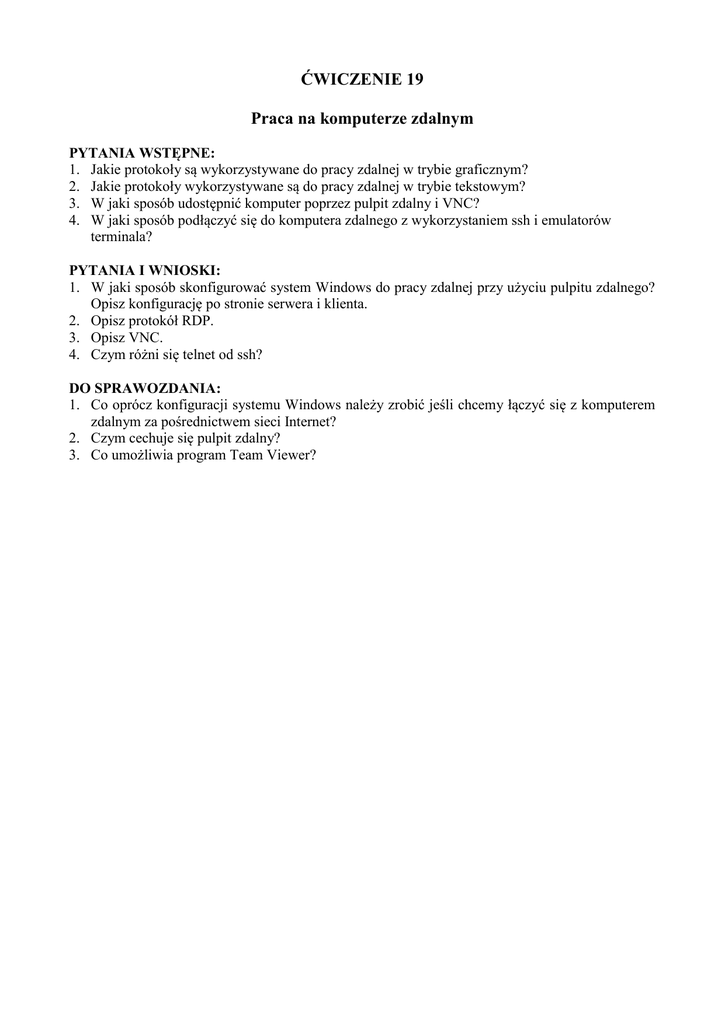 ĆWICZENIE 19 Praca na komputerze zdalnym PYTANIA WSTĘPNE: 1. Jakie protokoły są wykorzystywane do pracy zdalnej w trybie graficznym? 2. Jakie protokoły wykorzystywane są do pracy zdalnej w trybie tekstowym? 3. W jaki sposób udostępnić komputer poprzez pulpit zdalny i VNC? 4. W jaki sposób podłączyć się do komputera zdalnego z wykorzystaniem ssh i emulatorów terminala? PYTANIA I WNIOSKI: 1. W jaki sposób skonfigurować system Windows do pracy zdalnej przy użyciu pulpitu zdalnego? Opisz konfigurację po stronie serwera i klienta. 2. Opisz protokół RDP. 3. Opisz VNC. 4. Czym różni się telnet od ssh? DO SPRAWOZDANIA: 1. Co oprócz konfiguracji systemu Windows należy zrobić jeśli chcemy łączyć się z komputerem zdalnym za pośrednictwem sieci Internet? 2. Czym cechuje się pulpit zdalny? 3. Co umożliwia program Team Viewer?