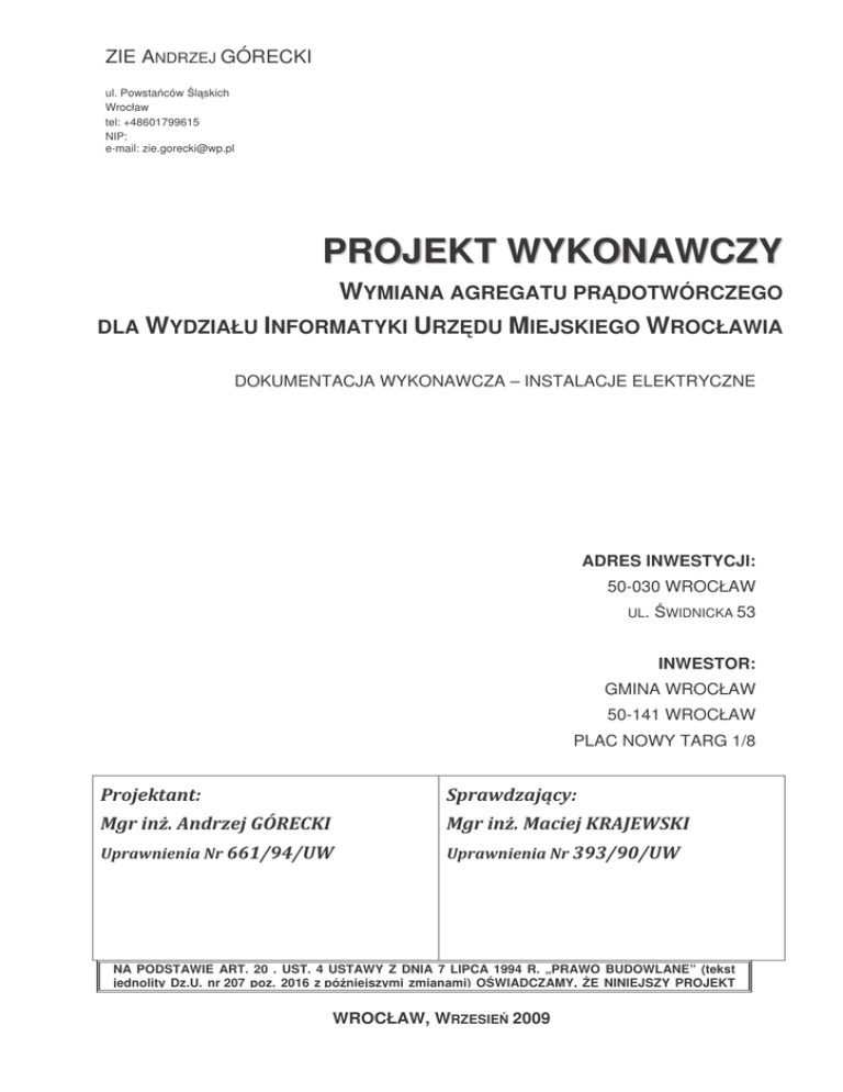ZIE ANDRZEJ GÓRECKI ul. PowstaĔców ĝląskich Wrocław tel: +48601799615 NIP: e-mail: [email protected] PR OJ EK T W YK ON A W C Z Y WYMIANA AGREGATU PRĄDOTWÓRCZEGO DLA WYDZIAŁU INFORMATYKI URZĉDU MIEJSKIEGO WROCŁAWIA DOKUMENTACJA WYKONAWCZA – INSTALACJE ELEKTRYCZNE ADRES INWESTYCJI: 50-030 WROCŁAW UL. ĝWIDNICKA 53 INWESTOR: GMINA WROCŁAW 50-141 WROCŁAW PLAC NOWY TARG 1/8 ǣ ¦ ǣ ĂǤ V ĂǤ ͼͼͷȀͿͺȀ ͿȀͿͶȀ NA PODSTAWIE ART. 20 . UST. 4 USTAWY Z DNIA 7 LIPCA 1994 R. „PRAWO BUDOWLANE” (tekst jednolity Dz.U. nr 207 poz. 2016 z póĨniejszymi zmianami) OĝWIADCZAMY, ĩE NINIEJSZY PROJEKT WROCŁAW, WRZESIEē 2009 WYKONANY ZOSTAŁ ZGODNIE Z WARUNKAMI TECHNICZNYMI, OBOWIĄZUJĄCYMI PRZEPISAMI, NORMAMI I ZASADAMI WIEDZY TECHNICZNEJ. PROJEKT STANOWI WŁASNOĝû INTELEKTUALNĄ AUTORÓW – KOPIOWANIE CAŁOĝCI LUB FRAGMENTÓW DOZWOLONE TYLKO ZA PISEMNĄ ZGODĄ. W PRZYPADKU WYKORZYSTANIA NINIEJSZEGO PROJEKTU WSZYSTKIE KOPIE MUSZĄ POSIADAû WSZELKIE ZAWARTE W ORYGINALNEJ WERSJI OZNACZENIA PRAW AUTORSKICH I INNE OZNACZENIA DOTYCZĄCE PRAW WŁASNOĝCI INTELEKTUALNEJ. WSZELKIE NAZWY PRODUCENTÓW I KONKRETNYCH URZĄDZEē ZOSTAŁY PRZYWOŁANE JEDYNIE W CELU USTALENIA WYMAGANEGO PRZEZ INWESTORA I PROJEKTANTA STANDARDU WYKONANIA I NALEĩY JE TRAKTOWAû JAKO WSKAZÓWKĉ. INWESTOR WYMAGA, ABY W RAMACH REALIZACJI STOSOWAû MATERIAŁY I URZĄDZENIA O NIE GORSZYCH OD PODANYCH W PROJEKCIE PARAMETRACH / WŁAĝCIWOĝCIACH FUNKCJONALNYCH I UĩYTKOWYCH. ¦ Ï ʹ Spis treĞci I.1 KARTA UZGODNIEē I ZMIAN .......................................................................................... 5 I.2 UPRAWNIENIA PROJEKTANTA ....................................................................................... 6 I.3 PRZEDMIOT I PODSTAWA OPRACOWANIA ....................................................................... 6 I.3.1 Podstawa opracowania.................................................................................................. 6 I.3.2 Przedmiot opracowania ................................................................................................. 6 I.3.3 ZałoĪenia projektowe. Wykaz przepisów i norm............................................................ 6 I.3.4 Inwestycje współzaleĪne i towarzyszące....................................................................... 7 I.3.5 Projekty związane.......................................................................................................... 7 I.4 OPIS TECHNICZNY INSTALACJI ...................................................................................... 8 I.4.1 Ogólna charakterystyka obiektu .................................................................................... 8 I.4.2 Układ technologiczny i ogólna charakterystyka odbiorników......................................... 8 I.4.3 Układ zasilania obiektu i poszczególnych instalacji....................................................... 8 I.4.4 Sposób rozprowadzenia instalacji. ................................................................................ 9 I.5 ROZDZIELNICE. ........................................................................................................... 9 I.5.1 Rozdzielnica TPA. ......................................................................................................... 9 I.5.2 Rozdzielnica RG_SZR................................................................................................. 10 I.5.3 Rozdzielnica RG_COM................................................................................................ 10 I.5.4 Rozdzielnica RG_CPD. ............................................................................................... 10 I.5.5 Nastawy czasowe układów automatyki przełączającej................................................ 11 I.6 LINIE ZASILAJĄCE ...................................................................................................... 11 I.7 ZDALNY NADZÓR....................................................................................................... 12 I.8 AGREGAT PRĄDOTWÓRCZY........................................................................................ 13 I.8.1 Zalecenia instalacyjne dla zespołu prądotwórczego.................................................... 13 I.8.1.1 Lokalizacja. ........................................................................................................ 13 I.8.1.2 Posadowienie. ................................................................................................... 13 I.8.1.3 Wentylacja. ........................................................................................................ 14 I.8.1.4 Układ wydechowy. ............................................................................................. 14 I.8.1.5 Układ paliwowy. ................................................................................................. 14 I.8.1.6 Instalacja elektryczna. ....................................................................................... 14 I.9 ZESPÓŁ PRĄDOTWÓRCZY O MOCY 100kVA PRP WEDŁUG ISO 8528 ........................... 15 I.9.1 NORMY PRODUKCYJNE ........................................................................................... 15 I.9.2 NORMY OCHRONY ĝRODOWISKA .......................................................................... 16 I.9.3 DANE TECHNICZNE ZESPOŁU................................................................................. 16 I.9.4 SPECYFIKACJA ZESPOŁU PRĄDOTWÓRCZEGO .................................................. 16 ¦ Ï ͵ I.9.4.1 Silnik diesla........................................................................................................ 16 I.9.4.2 Alternator synchroniczny ................................................................................... 17 I.9.4.3 Panel kontrolno – sterujący agregatu: ............................................................... 17 I.9.4.4 System nadzoru:...