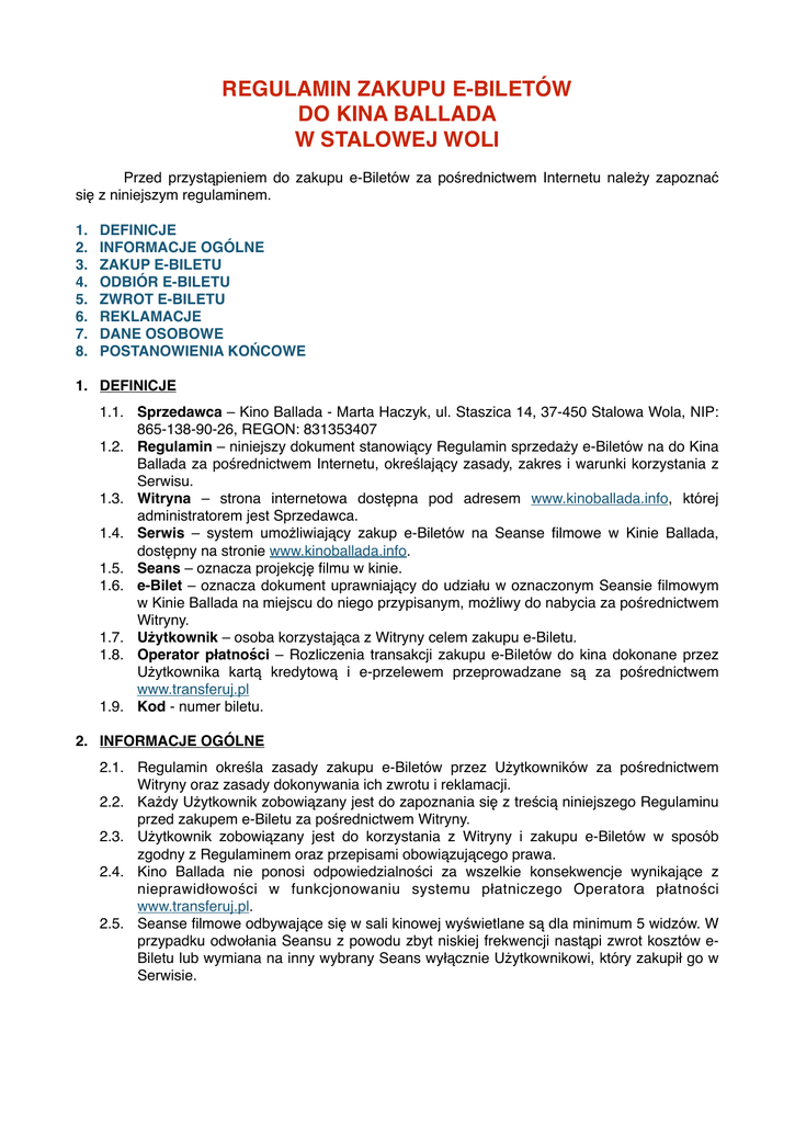 REGULAMIN ZAKUPU E-BILETÓW DO KINA BALLADA W STALOWEJ WOLI Przed przystąpieniem do zakupu e-Biletów za pośrednictwem Internetu należy zapoznać się z niniejszym regulaminem. 1. 2. 3. 4. 5. 6. 7. 8. DEFINICJE INFORMACJE OGÓLNE ZAKUP E-BILETU ODBIÓR E-BILETU ZWROT E-BILETU REKLAMACJE DANE OSOBOWE POSTANOWIENIA KOŃCOWE 1. DEFINICJE 1.1. Sprzedawca – Kino Ballada - Marta Haczyk, ul. Staszica 14, 37-450 Stalowa Wola, NIP: 865-138-90-26, REGON: 831353407 1.2. Regulamin – niniejszy dokument stanowiący Regulamin sprzedaży e-Biletów na do Kina Ballada za pośrednictwem Internetu, określający zasady, zakres i warunki korzystania z Serwisu. 1.3. Witryna – strona internetowa dostępna pod adresem www.kinoballada.info, której administratorem jest Sprzedawca. 1.4. Serwis – system umożliwiający zakup e-Biletów na Seanse filmowe w Kinie Ballada, dostępny na stronie www.kinoballada.info. 1.5. Seans – oznacza projekcję filmu w kinie. 1.6. e-Bilet – oznacza dokument uprawniający do udziału w oznaczonym Seansie filmowym w Kinie Ballada na miejscu do niego przypisanym, możliwy do nabycia za pośrednictwem Witryny. 1.7. Użytkownik – osoba korzystająca z Witryny celem zakupu e-Biletu. 1.8. Operator płatności – Rozliczenia transakcji zakupu e-Biletów do kina dokonane przez Użytkownika kartą kredytową i e-przelewem przeprowadzane są za pośrednictwem www.transferuj.pl 1.9. Kod - numer biletu. 2. INFORMACJE OGÓLNE 2.1. Regulamin określa zasady zakupu e-Biletów przez Użytkowników za pośrednictwem Witryny oraz zasady dokonywania ich zwrotu i reklamacji. 2.2. Każdy Użytkownik zobowiązany jest do zapoznania się z treścią niniejszego Regulaminu przed zakupem e-Biletu za pośrednictwem Witryny. 2.3. Użytkownik zobowiązany jest do korzystania z Witryny i zakupu e-Biletów w sposób zgodny z Regulaminem oraz przepisami obowiązującego prawa. 2.4. Kino Ballada nie ponosi odpowiedzialności za wszelkie konsekwencje wynikające z nieprawidłowości w funkcjonowaniu systemu płatniczego Operatora płatności www.transferuj.pl. 2.5. Seanse filmowe odbywające się w sali kinowej wyświetlane są dla minimum 5 widzów. W przypadku odwołania Seansu z powodu zbyt niskiej frekwencji nastąpi zwrot kosztów eBiletu lub wymiana na inny wybrany Seans wyłącznie Użytkownikowi, który zakupił go w Serwisie. www.kinoballada.info Strona 2 z 4 3. ZAKUP E-BILETU 3.1. Zakup e-Biletu następuje poprzez złożenie za pomocą Witryny zamówienia na e-Bilet na zasadach określonych w Regulaminie. 3.2. Dokonanie zakupu e-Biletów w systemie on-line oznacza akceptację Regulaminu. 3.3. Sprzedawcy przysługuje prawo do swobodnego decydowania o momencie rozpoczęcia i zakończenia sprzedaży e-Biletów na dany Seans za pośrednictwem Witryny, który może różnić się od okresu sprzedaży biletów w kasie Kina Ballada. 3.4. Zakup e-Biletu możliwy jest w zakładce „kup e-Bilet on-line” 3.5. Płatność za e-Bilet w systemie on-line możliwa będzie wyłącznie za pomocą Operatora płatności, na który Użytkownik zostanie przekierowany bezpośrednio po złożeniu zamówienia. 3.6. Użytkownik ma możliwość zapłaty za zamówione e-Bilety wyłącznie za pomocą form płatności udostępnionych na stronie płatności. 3.7. Płatność wynikająca z jednego zamówienia powinna zostać dokonana jednorazowo, w całości oraz zawierać wartość wszystkich zamówionych e-Biletów. Użytkownikowi nie przysługuje prawo do wykonania płatności na raty lub oddzielnie za poszczególne bilety. 3.8. Płatność powinna być dokonana nie wcześniej niż w momencie złożenia zamówienia i nie później niż w terminie 20 minut od złożenia zamówienia. Po upływie terminu na dokonanie płatności zamówienie zostanie anulowane. 3.9. Płatność dokonana po upływie 30 minut od złożenia zamówienia zostanie zaksięgowana na stronie płatności jako przedpłata, wykorzystanie lub zwrot nastąpi zgodnie z Regulaminem strony płatności. 3.10. Zgodnie z Rozporządzeniem Ministra Finansów z dnia 26 lipca 2010 r. sprzedaż eBiletów w zakresie zamówienia i płatności drogą internetową nie podlega fiskalizacji, w związku z czym Kupujący nie otrzymuje paragonu fiskalnego. 3.11. Ceny wskazane na stronach Witryny, w potwierdzeniu zakupu oraz na e-Biletach są kwotami brutto zawierającymi podatek VAT obliczony zgodnie z obowiązującymi przepisami. Koszt transakcji obejmuje prowizję Serwisu www.transferuj.pl. 3.12. Nie później niż w terminie 20 minut od dokonania płatności na adres e-mail Użytkownika zostanie wysłana wiadomość e-mail zawierająca wartość, miejsce, dane identyfikacyjne seansu, datę, godzinę, listę zakupionych e-Biletów. Z reguły trwa to 5 minut. 3.13. Osoby, które zakupiły w systemie sprzedaży e-Bilety ulgowe, zobowiązane są do okazania dokumentu uprawniającego do zniżki przed wejściem na seans̨, na który zostały zakupione e-Bilety. e-Bilety ulgowe bez udokumentowania prawa do ulgi nie uprawniają do wejścia na seans. 3.14. Sprzedaż e-Biletów w systemie on-line kończy się 60 minut przed rozpoczęciem seansu. 3.15. Sprzedawca zastrzega sobie możliwość zakończenia sprzedaży on-line w każdej chwili, bez podawania przyczyn. 3.16. Brak możliwości zakupu e-Biletów za pośrednictwem systemu sprzedaży on-line nie oznacza braku biletów w kasie Kina Ballada. 3.17. Sprzedawca nie ponosi odpowiedzialności za skutki podania nieprawdziwych lub błędnych danych w formularzu zamówienia. 4. ODBIÓR ZAKUPIONEGO E-BILETU 4.1. e-Bilet ważny jest od momentu jego otrzymania po dokonaniu płatności do momentu zakończenia Seansu filmowego, którego dotyczył. 4.2. Użytkownik może: • wydrukować e-Bilet wysłany przez system na adres poczty elektronicznej Użytkownika • wyświetlić stronę z wygenerowanym e-Biletem • pobrać zdjęcie e-Biletu 4.3. Każdy e-Bilet oznaczony jest indywidualnym kodem oraz zamieszczonym bezpośrednio pod n