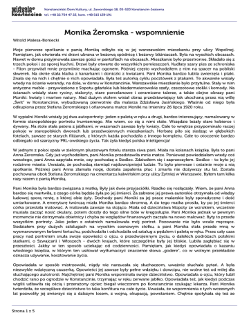 Konstanciński Dom Kultury, ul. Jaworskiego 18, 05-520 Konstancin-Jeziorna tel. +48 22 754 47 23, kom. +48 515 139 191 Monika Żeromska - wspomnienie Witold Malesa-Boniecki Moje pierwsze spotkanie z panią Moniką odbyło się w jej warszawskim mieszkaniu przy ulicy Wspólnej. Pamiętam, jak otwierała mi drzwi ubrana w beżową spódnicę i beżowy bliźniaczek. Była na wysokich obcasach. Nawet w domu przyjmowała zawsze gości w pantoflach na obcasach. Mieszkanie było przestronne. Składało się z trzech pokoi i ze sporej kuchni. Drzwi były otwarte do wszystkich pomieszczeń. Kudłaty szary pies ze schroniska - Filon przywitał mnie przymilnie machając ogonem. Później często wychodziłem z nim na spacer na pobliski skwerek. Na oknie stała klatka z kanarkami i doniczki z kwiatami. Pani Monika bardzo lubiła zwierzęta i ptaki. Znała się na nich i chętnie o nich opowiadała. Była też autorką cyklu pocztówek z ptakami. Te akwarele wisiały wtedy na ścianie werandy, na dole, w domu w Konstancinie. Warszawskie mieszkanie było przytulne. Stały w nim antyczne meble - przywiezione z Sopotu gdańskie lub biedermeierowskie szafy, czeczotowe stoliki i komody. Na ścianach wisiały stare ryciny, staloryty, stare porcelanowe i ceramiczne talerze, a także olejne obrazy pani Moniki: kwiaty i martwe natury. Nad dużym stołem wisiał obraz przedstawiający tak ukochaną przez nią willę „Świt” w Konstancinie, wybudowaną pierwotnie dla malarza Zdzisława Jasińskiego. Właśnie od niego była odkupiona przez Stefana Żeromskiego i ofiarowana matce Moniki na imieniny 26 lipca 1920 roku. W sypialni Moniki wisiały jej dwa autoportrety: jeden z paletą w ręku a drugi, bardzo interesujący, namalowany w formie staropolskiego portretu trumiennego. Nie wiem, co się z nimi stało. Wszędzie leżały stare kobierce i dywany. Na stole stała patera z jabłkami, w wazonach zawsze były kwiaty. Całe to wnętrze przypominało raczej pokoje w staropolskich dworach lub przedwojennych mieszkaniach. Herbatę piło się siedząc w głębokich fotelach, zawsze ze starych filiżanek, z których każda pochodziła z innego kompletu. Całe to otoczenie bardzo odbiegało od szarzyzny PRL-owskiego życia. Tak żyła kiedyś polska inteligencja! W jednym z pokoi spała w zielonym pluszowym fotelu starsza siwa pani. Miała na kolanach książkę. Była to pani Anna Żeromska. Gdy już wychodziłem, pani Monika przedstawiła mnie matce. Ponieważ powiedziałam wtedy coś wesołego, pani Anna zapytała mnie, czy pochodzę z Siedlec. Zdziwiłem się i zaprzeczyłem. Siedlce - to było jej rodzinne miasto. Uważała, że pochodzą stamtąd najdowcipniejsi ludzie. To było pierwsze i ostatnie moje z nią spotkanie. Później pani Anna złamała nogę, dostała zapalenia płuc i zmarła nie dożywszy stu lat. Została pochowana obok Stefana Żeromskiego na cmentarzu kalwińskim przy ulicy Żytniej w Warszawie. Byłem tam kilka razy razem z panią Moniką. Pani Monika była bardzo związana z matką. Były jak dwie przyjaciółki. Rzadko się rozłączały. Wiem, że pani Anna bardzo się martwiła, z czego córka będzie żyła po jej śmierci. Za zabrane jej prawa autorskie otrzymała od władzy ludowej sporą rentę, z której obie żyły. Dochody pani Moniki za jej prace malarskie były sporadyczne i dość umiarkowane. A emeryturę twórczą miała Monika bardzo skromną. A do tego matka prosiła, by po jej śmierci córka przestała malować. A malowała zawsze na stojąco. Miała od dzieciństwa kłopoty ze wzrokiem, wcześnie musiała zacząć nosić okulary, potem doszły do tego silne bóle w kręgosłupie. Pani Monika jednak w pewnym momencie nie dotrzymała obietnicy i chyba ze względów finansowych zaczęła na nowo malować. Były to przede wszystkim portrety. Jako jeden z ostatnich namalowała mój portret. Pozowanie nie było wcale męczące. Siedziałem przy dużych sztalugach na wysokim sosnowym stołku, a pani Monika stała przede mną w wysmarowanym farbami fartuchu, podchodziła i odchodziła od sztalug z pędzlem i paletą w ręku. Przez cały czas pracy nad portretem snuła swoje opowieści o ojcu, o przedwojennym życiu, o dalekich podróżach polskimi statkami, o Szwajcarii i Włoszech - dwóch krajach, które szczególnie były jej bliskie. Lubiła zagłębiać się w przeszłości. Jakby w ten sposób uciekając od codzienności. Pamiętam, jak kiedyś opowiadała o kazaniu włoskiego księdza, w którym ten usiłował wytłumaczyć znaczenie słowa „godere”, co w wolnym przekładzie oznacza używanie, kosztowanie życia. Opowiadała w sposób mistrzowski, nigdy nie narzucała się słuchaczom, uważnie słuchała pytań. A była niezwykle wdzięczną causerką. Opowieści jej zawsze były pełne wdzięku i dowcipu, nie wolne też od miłej dla słuchającego autoironii. Najchętniej pani Monika wspominała swoje dzieciństwo. Opowiadała o ojcu, który lubił chodzić rano po ogrodzie w Konstancinie, trzymając w ręku zerwane jabłko. Opowiadała też, jak kiedyś podczas wigilii udławiła się ością i przerażony ojciec biegał wieczorem po Konstancinie szukając lekarza. Pani Monika twierdziła, że szczęśliwe dzieciństwo to taka konfitura na całe życie. Uważała, że wspomnienia z tych wczesnych lat pozwoliły jej zmierzyć się z dalszym losem, z wojną, okupacją, powstaniem. Chętnie spotykała się też ze Strona 1 z 5 Konstanciński Dom Kultury, ul. Jaworskiego 18, 05-520 Konstancin-Jeziorna tel. +48 22 754 47 23, kom. +48 515 139 191 swoimi przyjaciółkami z młodości, z którymi wspominała dawne lata. Należały do nich m.in. Hanna i Barbara Skarżanki, Elżbieta Osterwianka, Hanna Szczepkowska, Halina Machlejdówna, Maria Skoczylasówna. Elżbieta Osterwianka pozowała jej do portretu swego słynnego ojca. Mojego portretu nie mogłem oglądać przed ostatecznym ukończeniem. Gdy go zobaczyłem, zdziwiłem się, że mam na nim długie podkręcone w