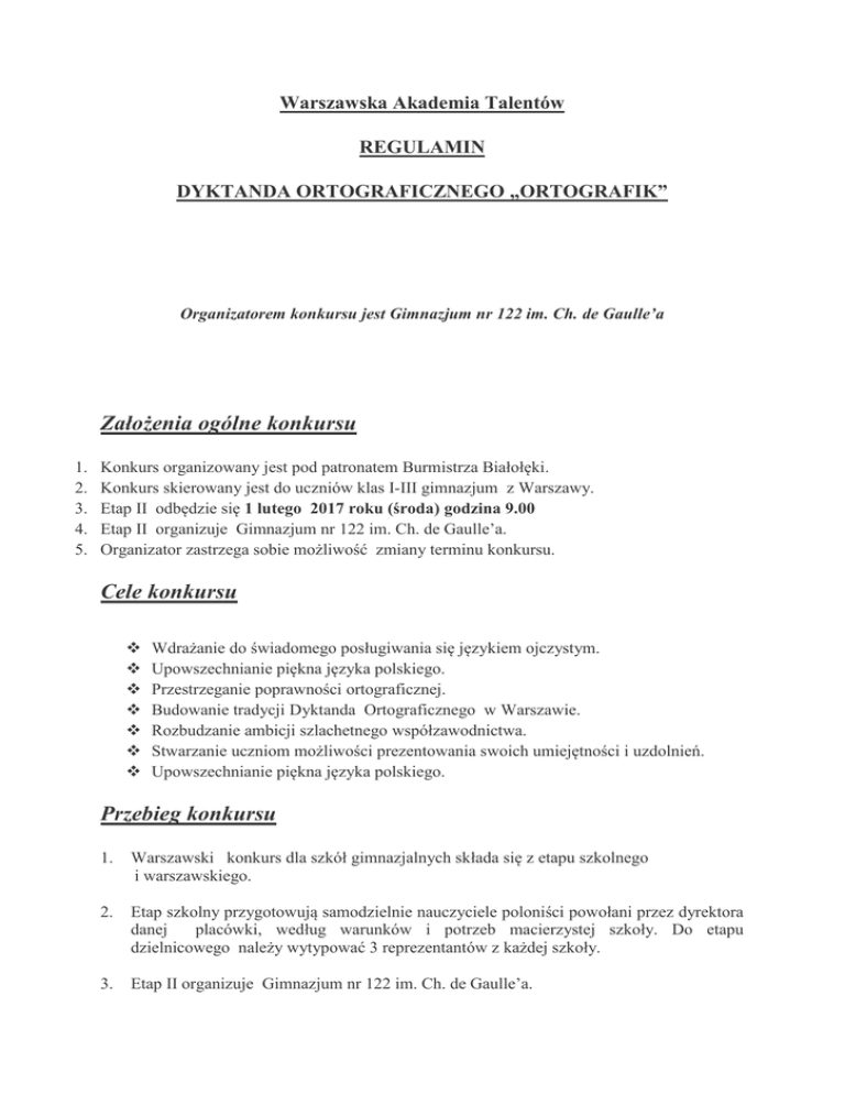 Warszawska Akademia Talentów REGULAMIN DYKTANDA ORTOGRAFICZNEGO „ORTOGRAFIK” Organizatorem konkursu jest Gimnazjum nr 122 im. Ch. de Gaulle’a Założenia ogólne konkursu 1. 2. 3. 4. 5. Konkurs organizowany jest pod patronatem Burmistrza Białołęki. Konkurs skierowany jest do uczniów klas I-III gimnazjum z Warszawy. Etap II odbędzie się 1 lutego 2017 roku (środa) godzina 9.00 Etap II organizuje Gimnazjum nr 122 im. Ch. de Gaulle’a. Organizator zastrzega sobie możliwość zmiany terminu konkursu. Cele konkursu Wdrażanie do świadomego posługiwania się językiem ojczystym. Upowszechnianie piękna języka polskiego. Przestrzeganie poprawności ortograficznej. Budowanie tradycji Dyktanda Ortograficznego w Warszawie. Rozbudzanie ambicji szlachetnego współzawodnictwa. Stwarzanie uczniom możliwości prezentowania swoich umiejętności i uzdolnień. Upowszechnianie piękna języka polskiego. Przebieg konkursu 1. Warszawski konkurs dla szkół gimnazjalnych składa się z etapu szkolnego i warszawskiego. 2. Etap szkolny przygotowują samodzielnie nauczyciele poloniści powołani przez dyrektora danej placówki, według warunków i potrzeb macierzystej szkoły. Do etapu dzielnicowego należy wytypować 3 reprezentantów z każdej szkoły. 3. Etap II organizuje Gimnazjum nr 122 im. Ch. de Gaulle’a. 4. Udział w konkursie jest równoznaczny z wyrażeniem zgody na przetwarzanie przez organizatorów danych osobowych uczestników zgodnie z ustawą z dnia 29.08.1997 r. o ochronie danych osobowych (Dz.U. z 2002r.Nr 101. poz.926) w zakresie niezbędnym do realizacji konkursu. 5. Kandydatów wyłonionych w drodze eliminacji szkolnych: 3 uczniów należy zgłaszać do 25 stycznia 2017 roku na adres: [email protected] Nauczyciele organizujący konkurs Anna Arciszewska i Małgorzata Szyłak – Szydłowska Ewentualne pytania prosimy zgłaszać na wyżej wymieniony adres e- mail. 6. Zgłaszający dołącza protokół ze szkolnego etapu konkursu - wzór w załączeniu. 7. Piszący powinien mieć ze sobą 2 długopisy. 8. Ocenie będzie podlegać poprawność ortograficzna i interpunkcyjna. 9. Wszelkie nieczytelne i niejednoznaczne zapisy wyrazów, znaków interpunkcyjnych będą interpretowane na niekorzyść piszącego. 10. Nie należy pisać pismem drukowanym. 11. Wszystkie prace będą kodowane. 12. W przypadku wystąpienia takich samych wyników w kilku pracach, organizatorzy zastrzegają sobie możliwość przeprowadzenia dodatkowego dyktanda w celu wyłonienia zwycięzcy. 13. Nad przebiegiem konkursu czuwać będzie komisja powołana przez organizatora. 14. Nagrodzone zostaną trzy pierwsze miejsca. 15. Wgląd do ocenionych prac ma wyłącznie komisja sprawdzająca. 16. Wgląd do własnej pracy będzie możliwy w terminie późniejszym. Przysługiwać będzie wyłącznie uczestnikom konkursu oraz nauczycielom przygotowującym ucznia. Prace pozostają własnością organizatora. 17. Tekst dyktanda zostanie przygotowany w oparciu o „Słownik ortograficzny z zasadami pisowni i interpunkcji” E. Polańskiego i P. Żmigrodzkiego wydawnictwo ZNAK. 18. Decyzja komisji konkursowej jest ostateczna. Ocena prac konkursowych 1. Wygrywa uczeń, który napisze bezbłędną pracę lub popełni najmniejszą liczbę błędów. 2. Decyzja komisji konkursowej jest ostateczna. 3. Wyniki konkursu zostaną przekazane 1 marca 2017 roku. Zapraszając do udziału w konkursie, życzymy jednocześnie, by stał się on miłą przygodą językową dla tych, którzy pragną zostać mistrzem polskiej ortografii. Z poważaniem Organizatorzy