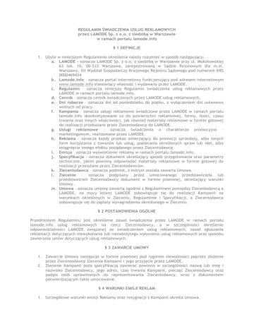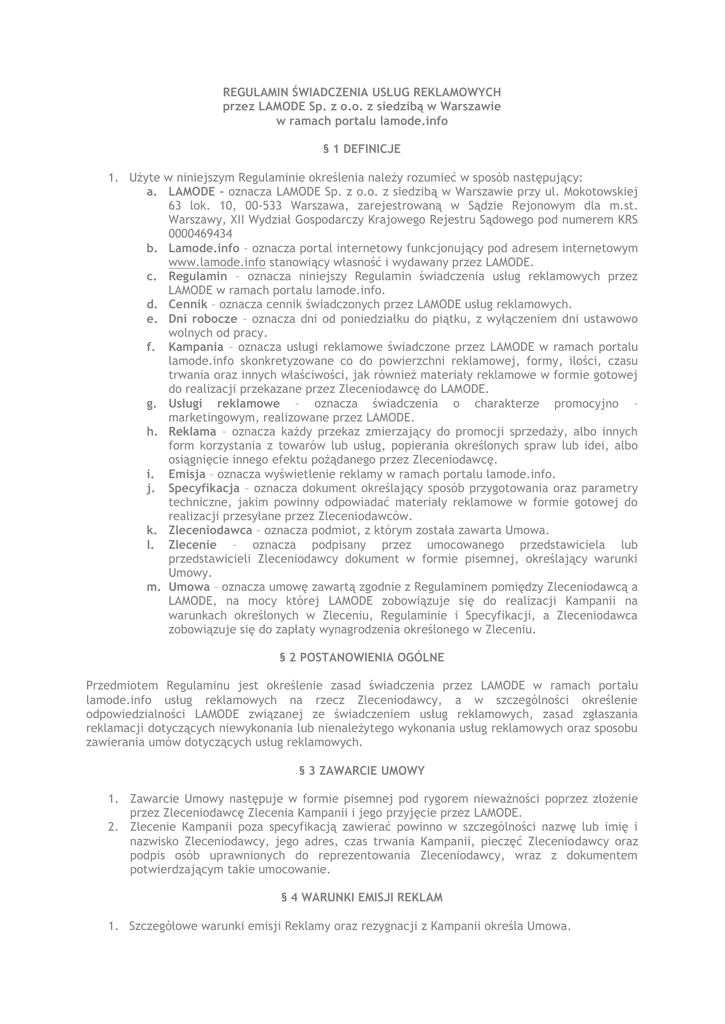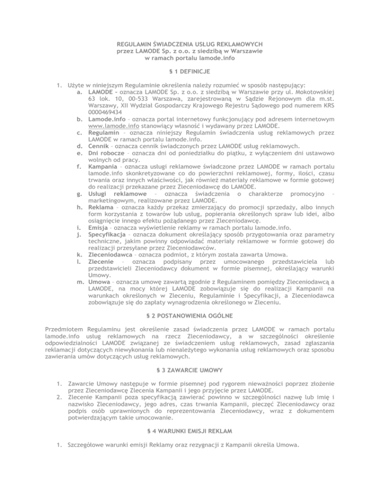 REGULAMIN ŚWIADCZENIA USŁUG REKLAMOWYCH przez LAMODE Sp. z o.o. z siedzibą w Warszawie w ramach portalu lamode.info § 1 DEFINICJE 1. Użyte w niniejszym Regulaminie określenia należy rozumieć w sposób następujący: a. LAMODE – oznacza LAMODE Sp. z o.o. z siedzibą w Warszawie przy ul. Mokotowskiej 63 lok. 10, 00-533 Warszawa, zarejestrowaną w Sądzie Rejonowym dla m.st. Warszawy, XII Wydział Gospodarczy Krajowego Rejestru Sądowego pod numerem KRS 0000469434 b. Lamode.info – oznacza portal internetowy funkcjonujący pod adresem internetowym www.lamode.info stanowiący własność i wydawany przez LAMODE. c. Regulamin – oznacza niniejszy Regulamin świadczenia usług reklamowych przez LAMODE w ramach portalu lamode.info. d. Cennik – oznacza cennik świadczonych przez LAMODE usług reklamowych. e. Dni robocze – oznacza dni od poniedziałku do piątku, z wyłączeniem dni ustawowo wolnych od pracy. f. Kampania – oznacza usługi reklamowe świadczone przez LAMODE w ramach portalu lamode.info skonkretyzowane co do powierzchni reklamowej, formy, ilości, czasu trwania oraz innych właściwości, jak również materiały reklamowe w formie gotowej do realizacji przekazane przez Zleceniodawcę do LAMODE. g. Usługi reklamowe – oznacza świadczenia o charakterze promocyjno – marketingowym, realizowane przez LAMODE. h. Reklama – oznacza każdy przekaz zmierzający do promocji sprzedaży, albo innych form korzystania z towarów lub usług, popierania określonych spraw lub idei, albo osiągnięcie innego efektu pożądanego przez Zleceniodawcę. i. Emisja – oznacza wyświetlenie reklamy w ramach portalu lamode.info. j. Specyfikacja – oznacza dokument określający sposób przygotowania oraz parametry techniczne, jakim powinny odpowiadać materiały reklamowe w formie gotowej do realizacji przesyłane przez Zleceniodawców. k. Zleceniodawca – oznacza podmiot, z którym została zawarta Umowa. l. Zlecenie – oznacza podpisany przez umocowanego przedstawiciela lub przedstawicieli Zleceniodawcy dokument w formie pisemnej, określający warunki Umowy. m. Umowa – oznacza umowę zawartą zgodnie z Regulaminem pomiędzy Zleceniodawcą a LAMODE, na mocy której LAMODE zobowiązuje się do realizacji Kampanii na warunkach określonych w Zleceniu, Regulaminie i Specyfikacji, a Zleceniodawca zobowiązuje się do zapłaty wynagrodzenia określonego w Zleceniu. § 2 POSTANOWIENIA OGÓLNE Przedmiotem Regulaminu jest określenie zasad świadczenia przez LAMODE w ramach portalu lamode.info usług reklamowych na rzecz Zleceniodawcy, a w szczególności określenie odpowiedzialności LAMODE związanej ze świadczeniem usług reklamowych, zasad zgłaszania reklamacji dotyczących niewykonania lub nienależytego wykonania usług reklamowych oraz sposobu zawierania umów dotyczących usług reklamowych. § 3 ZAWARCIE UMOWY 1. Zawarcie Umowy następuje w formie pisemnej pod rygorem nieważności poprzez złożenie przez Zleceniodawcę Zlecenia Kampanii i jego przyjęcie przez LAMODE. 2. Zlecenie Kampanii poza specyfikacją zawierać powinno w szczególności nazwę lub imię i nazwisko Zleceniodawcy, jego adres, czas trwania Kampanii, pieczęć Zleceniodawcy oraz podpis osób uprawnionych do reprezentowania Zleceniodawcy, wraz z dokumentem potwierdzającym takie umocowanie. § 4 WARUNKI EMISJI REKLAM 1. Szczegółowe warunki emisji Reklamy oraz rezygnacji z Kampanii określa Umowa. 2. LAMODE zastrzega sobie prawo odmowy emisji Reklamy, a w szczególności Reklam niezgodnych z tematyką portalu, obowiązującym prawem, dobrymi obyczajami, zasadami współżycia społecznego, nieprzyzwoitych bądź obraźliwych. 3. LAMODE nie ponosi odpowiedzialności za formę i treść świadczonych w ramach portalu usług reklamowych. W wypadku naruszenia treścią lub formą reklam praw osób trzecich i wystąpienia z roszczeniami przeciwko LAMODE, Zleceniodawca zobowiązuje się do wstąpienia w miejsce LAMODE do procesu sądowego, albo przystąpienia do procesu w charakterze interwenienta ubocznego. 4. Zleceniodawca, w zależności od postanowień zawartej Umowy jest zobowiązany do dostarczenia LAMODE bezpośrednio na płycie CD lub DVD, bądź też w drodze elektronicznej wszystkich informacji oraz materiałów koniecznych do emisji Reklamy w formie gotowej do realizacji Kampanii, najpóźniej na 3 dni robocze przed ustalonym w Umowie terminem rozpoczęcia emisji. 5. W przypadku dostarczenia informacji omówionych w pkt 4 z opóźnieniem lub w formie niezgodnej z wymogami zamawianej Reklamy LAMODE zastrzega sobie prawo wprowadzenia zmian w przewidzianym Umową terminie emisji. § 5 ZASADY PŁATNOŚCI 1. Wynagrodzenie należne LAMODE za emisję Reklam jest ustalane na podstawie Cennika w dniu złożenia Zlecenia Kampanii przez Zleceniodawcę i każdorazowo potwierdzane w Umowie. Cennik nie stanowi oferty w rozumieniu Kodeksu Cywilnego. 2. LAMODE wystawi Zleceniodawcy fakturę VAT dotyczącą wynagrodzenia za emisję Reklamy w dniu przewidzianego w Umowie rozpoczęcia jej emisji, chyba że Umowa stanowi inaczej. 3. Zleceniodawca zobowiązuje się do zapłaty na rzecz LAMODE wynagrodzenia wskazanego w fakturze VAT w terminie 7 dni od dnia jej otrzymania. 4. W przypadku niedokonania płatności wynagrodzenia w ustalonym terminie LAMODE zastrzega sobie prawo do wstrzymania emisji reklamy bez ponoszenia z tego tytułu jakiejkolwiek odpowiedzialności. § 6 REKLAMACJE 1. W przypadku nie wyemitowania lub niewłaściwego wyemitowania materiału reklamowego z winy LAMODE zobowiązuje się ona do powtórnego wyemitowania materiału reklamowego w ustalonym ze Zleceniodawcą terminie. 2. Wszelkie reklamacje Zleceniodawca zobowiązany jest zgłosić faksem (nr + 48 22 618 66 80) oraz potwierdzić e-mailem ([email protected]). 3. Reklamacja powinna zawierać w szczególności: a. imię i nazwisko albo nazwę oraz adres zamieszkania lub siedziby Zleceniodawcy; b. określenie przedmiotu reklamacji oraz przedsta
