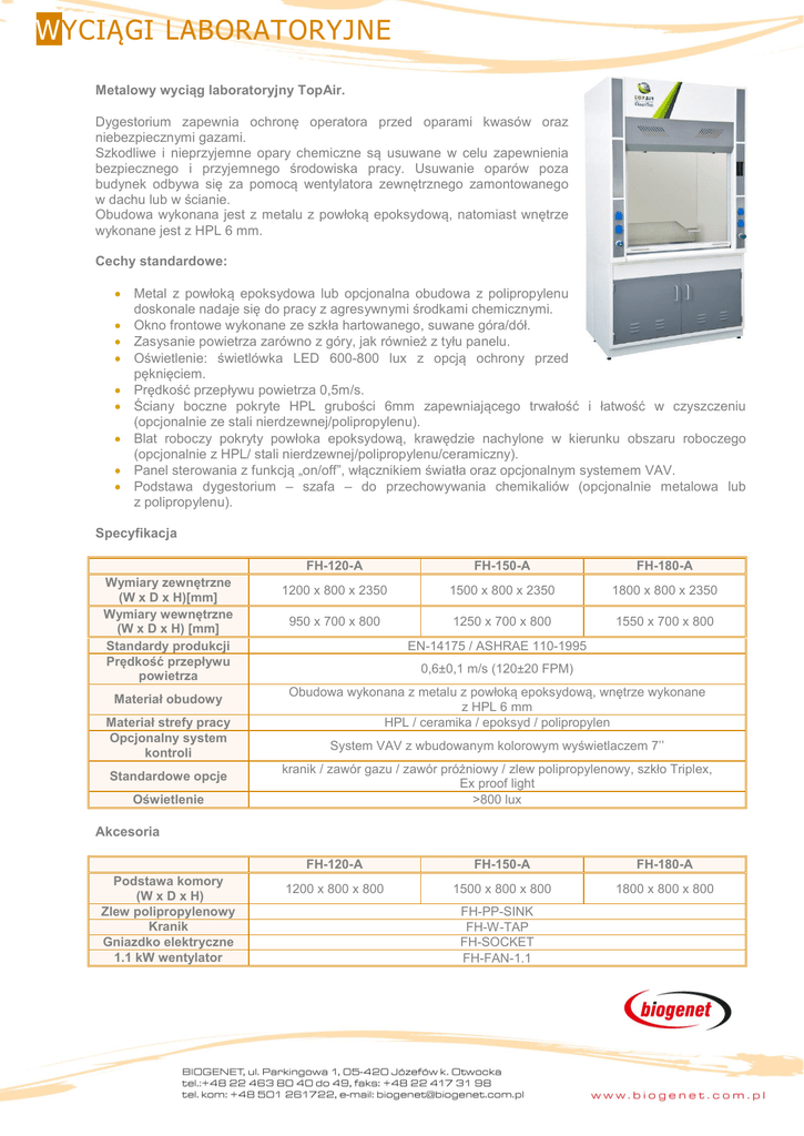 WYCIĄGI LABORATORYJNE Metalowy wyciąg laboratoryjny TopAir. Dygestorium zapewnia ochronę operatora przed oparami kwasów oraz niebezpiecznymi gazami. Szkodliwe i nieprzyjemne opary chemiczne są usuwane w celu zapewnienia bezpiecznego i przyjemnego środowiska pracy. Usuwanie oparów poza budynek odbywa się za pomocą wentylatora zewnętrznego zamontowanego w dachu lub w ścianie. Obudowa wykonana jest z metalu z powłoką epoksydową, natomiast wnętrze wykonane jest z HPL 6 mm. Cechy standardowe: Metal z powłoką epoksydowa lub opcjonalna obudowa z polipropylenu doskonale nadaje się do pracy z agresywnymi środkami chemicznymi. Okno frontowe wykonane ze szkła hartowanego, suwane góra/dół. Zasysanie powietrza zarówno z góry, jak również z tyłu panelu. Oświetlenie: świetlówka LED 600-800 lux z opcją ochrony przed pęknięciem. Prędkość przepływu powietrza 0,5m/s. Ściany boczne pokryte HPL grubości 6mm zapewniającego trwałość i łatwość w czyszczeniu (opcjonalnie ze stali nierdzewnej/polipropylenu). Blat roboczy pokryty powłoka epoksydową, krawędzie nachylone w kierunku obszaru roboczego (opcjonalnie z HPL/ stali nierdzewnej/polipropylenu/ceramiczny). Panel sterowania z funkcją „on/off”, włącznikiem światła oraz opcjonalnym systemem VAV. Podstawa dygestorium – szafa – do przechowywania chemikaliów (opcjonalnie metalowa lub z polipropylenu). Specyfikacja Wymiary zewnętrzne (W x D x H)[mm] Wymiary wewnętrzne (W x D x H) [mm] Standardy produkcji Prędkość przepływu powietrza Materiał obudowy Materiał strefy pracy Opcjonalny system kontroli Standardowe opcje Oświetlenie FH-120-A FH-150-A FH-180-A 1200 x 800 x 2350 1500 x 800 x 2350 1800 x 800 x 2350 950 x 700 x 800 1250 x 700 x 800 1550 x 700 x 800 EN-14175 / ASHRAE 110-1995 0,6±0,1 m/s (120±20 FPM) Obudowa wykonana z metalu z powłoką epoksydową, wnętrze wykonane z HPL 6 mm HPL / ceramika / epoksyd / polipropylen System VAV z wbudowanym kolorowym wyświetlaczem 7’’ kranik / zawór gazu / zawór próżniowy / zlew polipropylenowy, szkło Triplex, Ex proof light >800 lux Akcesoria Podstawa komory (W x D x H) Zlew polipropylenowy Kranik Gniazdko elektryczne 1.1 kW wentylator FH-120-A FH-150-A FH-180-A 1200 x 800 x 800 1500 x 800 x 800 1800 x 800 x 800 FH-PP-SINK FH-W-TAP FH-SOCKET FH-FAN-1.1