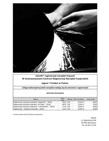 Cennik* regeneracji narzędzi tnących W Autoryzowanym Centrum Regeneracji Narzędzi Fryzjerskich Jaguar i Tondeo w Polsce. Usługi wykonujemy jeżeli narzędzia nadają się do ostrzenia i regeneracji! NOŻYCZKI FRYZJERSKIE Nazwa Regeneracja nożyczek fryzjerskich "degażówki" - SILOG Cena Waluta VAT od zakupu netto 39,02 PLN 23,00 % Cena brutto 48,00 Regeneracja nożyczek fryzjerskich "do ślizgu" - SILOG 56,91 PLN 23,00 % 70,00 Regeneracja nożyczek fryzjerskich "z mikroszlifem" - SILOG 37,40 PLN 23,00 % 46,00 Regeneracja - nałożenie mikroszlifu - SILOG 14,63 PLN 23,00 % 18,00 *Cennik ważny od 01.05.2016 do odwołania SILOG ul. Wiertnicza 149 02-952 Warszawa Tel. 22 651-72-56 Cennik* regeneracji ostrzy do maszynek W Autoryzowanym Centrum Regeneracji Narzędzi Fryzjerskich Jaguar i Tondeo w Polsce. Usługi wykonujemy jeżeli narzędzia nadają się do ostrzenia i regeneracji! OSTRZA DO MASZYNEK FRYZJERSKICH Nazwa Regeneracja ostrza CM 2000, Bellina, Genius, SCII, Bella – ostrzenie w normalnym trybie do 14 dni Regeneracja ostrza CM 2000, Bellina, Genius, SCII, Bella – ostrzenie EXPRESS 48h Cena netto Waluta VAT od zakupu Cena brutto 29,27 PLN 23,00 % 36,00 40,57 PLN 23,00 % 49,90 *Cennik ważny od 01.05.2016 do odwołania SILOG ul. Wiertnicza 149 02-952 Warszawa Tel. 22 651-72-56