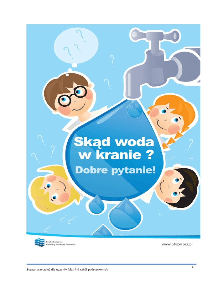 Scenariusze zajęć dla uczniów klas 4-6 szkół podstawowych 1 TEMAT: Jak mogę zadbać o zasoby wody w moim otoczeniu? Cel ogólny: wypromowanie wśród uczniów właściwych zachowań w aspekcie ochrony zasobów wodnych. Cele szczegółowe: - uzmysłowienie uczniom konieczności ochrony zasobów wodnych, - wskazanie uczniom zachowań, które prowadzą do degradacji jakości wody - przedstawienie uczniom postaw i zachowań zapewniających ochronę zasobów wodnych. Czas: 45 minut Miejsce: sala lekcyjna Materiały pomocnicze: 1. wiadro i miarka do odmierzania objętości wody (np.: o pojemności 1 litra) 2. plansze informacyjne obrazujące źródła wody i ich wielkość; 3. globus lub mapa fizyczna świata; 4. zestaw TAK czy NIE; Przebieg zajęć Przed rozpoczęciem zajęć, nauczyciel wraz z uczniami podstawia wiadro pod kranem i ustawia zawór w taki sposób, aby woda powoli kapała do wiadra (można to wykonać w toalecie, kuchni lub na zewnątrz budynku). 1. Ile jest wody na świecie (Ziemi)? Nauczyciel pyta, ile jest wody na Ziemi i wskazuje na globus lub mapę świata. Dzieci analizując globus lub mapę sprawdzają jaką część Ziemi stanowią wody powierzchniowe. Nauczyciel dalej dopytuje, czy na mapie widzą więcej lądów czy mórz, oceanów i rzek? Prosi także uczniów, żeby spróbowali oszacować jaką część Ziemi stanowią wody, czy jest to Scenariusze zajęć dla uczniów klas 4-6 szkół podstawowych 2 połowa, mniej niż połowa czy może dużo więcej niż połowa. Prowadząc analizę mapy lub globusa wspólnie stwierdzają, że wody na powierzchni Ziemi stanowią zdecydowaną większość. Nauczyciel uściśla, że wody zajmują około 75% tj. ¾ powierzchni Ziemi. Następnie prowadzący zajęcia pyta czy prócz mórz i oceanów woda występuje jeszcze gdzieś? Prawdopodobnie uczniowie wskażą na jeziora, rzeki, stawy. Dalej, jeśli żadne z dzieci nie wymieniło wód podziemnych, trzeba dopytywać, czy ktoś słyszał o wodach podziemnych, czy ktoś widział takie wody np.; w studni lub wielkim wykopie (np.: pod budynki lub w miejscu funkcjonowania kopalni odkrywkowej węgla, gliny czy żwiru). Podsumowując tę część zajęć nauczyciel prezentuje TABLICĘ- ŹRÓDŁA WODY zawierającą informacje o tym, jaką część wszystkich wód stanowią poszczególne „źródła wody”. Nauczyciel powinien zwrócić uwagę nie tylko na wielkości liczbowe, które dla dzieci mogą być niezrozumiałe, ale przede wszystkim na wskaźniki graficzne obrazujące wzajemne relacje między poszczególnymi „źródłami wody”. Jakich źródeł wody jest najwięcej? Uczniowie odpowiadają, że wody mórz i oceanów stanowią zdecydowaną większość. Jednocześnie uczniowie wraz z prowadzącym dochodzą do wniosku, że wody te są słone i z tego powodu nie nadają się do picia. Można więc podsumować, że tylko bardzo niewielka część wód nadaje się do picia czy zaspokojenia najważniejszej naszej potrzeby związanej z wodą. TABLICA: ŹRÓDŁA WODY Scenariusze zajęć dla uczniów klas 4-6 szkół podstawowych 3 2. Do czego nam woda? Na tak postawione pytanie dzieci znajdą wiele odpowiedzi: do prania, podlewania, mycia, pływania, kąpania, picia itd. Wszystkie odpowiedzi można zapisać na tablicy, ale bezwzględnie konieczne jest wyeksponowanie picia jako najważniejszej potrzeby zaspakajanej prze dostępne zasoby wodne. Skoro wiadomo, że woda jest nam potrzebna do picia, a więc do życia to, co możemy zrobić, aby tej wody było jak najwięcej? 3. Co możemy zrobić żeby zadbać o zasoby wody w naszym otoczeniu? Takim pytaniem można rozpocząć kolejną cześć zajęć. Prawdopodobnie uczniowie tej grupy wiekowej będą potrafili wymienić kilka zachowań, postaw chroniących wody przed zanieczyszczeniem czy degradacją, np.: nie wyrzucanie butelek do jeziora, rzeki. Prowadzący zajęcia dzieli tablicę na dwie części i opisuje je TAK I NIE. Prezentuje uczniom rozsypankę obrazków, które ilustrują właściwe i niewłaściwe zachowania, jeśli chodzi o oszczędzanie wody. OBRAZKI: Scenariusze zajęć dla uczniów klas 4-6 szkół podstawowych 4 Wybiera parę uczniów i prosi o wybór niewłaściwego i odpowiadającego mu prawidłowego zachowania. Uczniowie muszą wytłumaczyć swój wybór i zapisać hasło zachęcające do oszczędzania wody wykorzystując omówiony przykład na papierowej kropelce, którą otrzymują od nauczyciela. W ten sam sposób postępują po kolei pozostałe pary uczniów. Przedstawiciel każdej pary przyczepia swoją kropelkę na przygotowanej tablicy w klasie. Tablica jest zatytułowana : Na naszej tablicy każda kropla się liczy! Druga osoba z pary odczytuje hasło. WZÓR KROPLI Scenariusze zajęć dla uczniów klas 4-6 szkół podstawowych 5 Teraz jest czas na sprawdzenie ile wody nakapało podczas zajęć z niedokręconego kranu. Nauczyciel wraz z uczniami idzie sprawdzić ile wody jest we wiadrze. Razem mierzą zebraną objętość wody przy pomocy miarki. Wynik uczniowie zapisują w zeszytach. Podsumowując zajęcia prowadzący informuje uczniów, że Polska jest krajem o bardzo małych zasobach wody zdatnej do picia i dlatego każdy z nas musi zwracać szczególną uwagę na ochronę źródeł wody i oszczędne gospodarowanie wodą. Nasza tablica będzie przypominała Wam i edukowała waszych kolegów w jaki sposób możemy zadbać o wodę w naszym otoczeniu Zadanie domowe Na podstawie wyników uzyskanych podczas zajęć w szkole, policzyć ile wody może „wykapać” z kranu w ciągu doby. Zmierz ile wody wypływa z kranu podczas mycia zębów jeśli nie zakręcisz wody. Pamiętaj aby woda którą zgromadzisz w naczyniu, po pomiarze została ponownie wykorzystana (podlewanie roślin, spłukanie toalety). Zęby myjesz przynajmniej dwa razy dziennie. Przy kolejnym myciu zębów zmierz ilość wody, którą odlewasz do Scenariusze zajęć dla uczniów klas 4-6 szkół podstawowych 6 kubka przy zakręconym kranie.