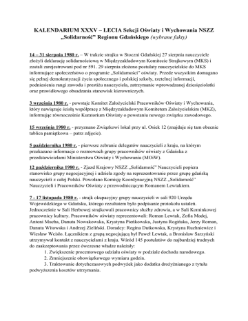 KALENDARIUM XXXV – LECIA Sekcji Oświaty i Wychowania NSZZ „Solidarność” Regionu Gdańskiego (wybrane fakty) 14 – 31 sierpnia 1980 r. – W trakcie strajku w Stoczni Gdańskiej 27 sierpnia nauczyciele złożyli deklarację solidarnościową w Międzyzakładowym Komitecie Strajkowym (MKS) i zostali zarejestrowani pod nr 591. 29 sierpnia złożono postulaty nauczycielskie do MKS informujące społeczeństwo o programie „Solidarności” oświaty. Przede wszystkim domagano się pełnej demokratyzacji życia społecznego i polskiej szkoły, rzetelnej informacji, podniesienia rangi zawodu i prestiżu nauczyciela, zatrzymanie wprowadzanej dziesięciolatki oraz prawidłowego obsadzania stanowisk kierowniczych. 3 września 1980 r. - powstaje Komitet Założycielski Pracowników Oświaty i Wychowania, który nawiązuje ścisłą współpracę z Międzyzakładowym Komitetem Założycielskim (MKZ), informując równocześnie Kuratorium Oświaty o powstaniu nowego związku zawodowego. 15 września 1980 r. - przyznano Związkowi lokal przy ul. Osiek 12 (znajduje się tam obecnie tablica pamiątkowa – patrz zdjęcie). 5 października 1980 r. - pierwsze zebranie delegatów nauczycieli z kraju, na którym przekazano informacje o rozmowach grupy pracowników oświaty z Gdańska z przedstawicielami Ministerstwa Oświaty i Wychowania (MOiW). 12 października 1980 r. - Zjazd Krajowy NSZZ „Solidarność” Nauczycieli popiera stanowisko grupy negocjacyjnej i udziela zgody na reprezentowanie przez grupę gdańską nauczycieli z całej Polski. Powołano Komisję Koordynacyjną NSZZ „Solidarność” Nauczycieli i Pracowników Oświaty z przewodniczącym Romanem Lewtakiem. 7 - 17 listopada 1980 r. - strajk okupacyjny grupy nauczycieli w sali 920 Urzędu Wojewódzkiego w Gdańsku, którego rezultatem było podpisanie protokołu ustaleń. Jednocześnie w Sali Herbowej strajkowali pracownicy służby zdrowia, a w Sali Kominkowej pracownicy kultury. Pracowników oświaty reprezentowali: Roman Lewtak, Zofia Madej, Antoni Mucha, Danuta Nowakowska, Krystyna Pieńkowska, Justyna Rogińska, Jerzy Roman, Danuta Witowska i Andrzej Zieliński. Doradcy: Regina Dutkowska, Krystyna Ruchniewicz i Wiesław Wcisło. Łącznikiem z grupą negocjującą był Paweł Lewtak, a Bronisław Sarzyński utrzymywał kontakt z nauczycielami z kraju. Wśród 145 postulatów do najbardziej trudnych do zaakceptowania przez ówczesne władze należały: 1. Zwiększenie procentowego udziału oświaty w podziale dochodu narodowego. 2. Zmniejszenie obowiązkowego wymiaru godzin. 3. Traktowanie dotychczasowych podwyżek jako dodatku drożyźnianego z tytułu podwyższenia kosztów utrzymania. październik – grudzień 1980 - powstawanie kół „Solidarności” w szkołach i placówkach oświatowych, ustalanie nowej struktury Związku oraz wybór delegatów na zebrania wyborcze. 22 stycznia 1981 r. - Udział w strajku ostrzegawczym NSZZ „Solidarność” w sprawie dostępu do środków masowego przekazu. 4 lutego 1981 r. - Rozpoczynają się prace ogólnopolskiego zespołu do zmian programowych z historii pod przewodnictwem dr Anny Radziwiłł, w których z Gdańska bierze udział Krystyna Rzewuska oraz Małgorzata Szweykowska. 11-12 kwietnia 1981 r. - Jerzy Roman na zjeździe Krajowej Komisji Koordynacyjnej w Gdańsku zostaje wybrany przewodniczącym Krajowej Sekcji Oświaty i Wychowania, a jego zastępcą zostaje Bronisław Sarzyński. 8 sierpnia 1981 r. - zaczyna wychodzić „Wiatr od morza”, którego zadaniem jest popieranie i propagowanie programu Związku. 5-10 września oraz 26 września-7 października 1981 r. - udział w I Krajowym Zjeździe „Solidarności”, na którym podjęto uchwałę dotyczącą ustawy o szkolnictwie wyższym (poparcie dla zasady samorządności szkoły) oraz zobowiązano krajowe władze Związku do podjęcia działań umożliwiających zmiany w programie nauczania historii, języka polskiego i nauk społecznych. W czasie tego Zjazdu wystosowano przesłanie do ludzi pracy Europy Wschodniej oraz do Polonii całego świata. 13 grudnia 1981 r. - Ogłoszono stan wojenny. Internowano 7 tys. działaczy Związku. Z gdańskiej „Solidarności” oświaty Krystynę Pieńkowską. Przedstawiciele środowiska oświatowego organizowali modlitwy w Kościele Mariackim w intencji internowanych. 26 stycznia 1982 r. - Uchwalenie Karty Nauczyciela, która była wynikiem całorocznej pracy członków naszego Związku ze znacznym udziałem gdańskiej solidarności oświatowej. Uwaga: W okresie delegalizacji związku Gdańska „Solidarność” oświatowa stworzyła trzy środowiska oświatowe współdziałające ze sobą: TAJNĄ KOMISJĘ ZAKŁADOWĄ, DUSZPASTERSTWO NAUCZYCIELI (przy wsparciu Ks. Stanisława Bogdanowicza Kościoła Mariackiego), GRUPĘ O. RYSZARDA MYŚLIWCA (spotkania w Kościele św. Bartłomieja). 1982 – 1984 - weryfikacje środowiska nauczycielskiego w obecności członków komitetów PZPR (zmuszanie do udzielania odpowiedzi na szereg pytań, m.in. jak nauczyciel oddziałuje na młodzież pod kątem akceptacji ideologii i zasad ustrojowych socjalistycznego państwa, w jaki sposób umacnia i rozwija świecki charakter szkoły i świecką obyczajowość. Przy okazji występowały naciski, aby zapisywać się do neozwiązków, którym władze zezwoliły na reaktywowanie działalności. Styczeń 1988 r. - wznowiono wydawanie „Wiatru od morza” (niezależne pismo o charakterze publicystycznym, przedstawiające aktualne problemy oświaty i poszukujące dróg jej naprawy). 25 września 1988 r. - List do Lecha Wałęsy od nauczycieli z całej Polski podpisany również przez przedstawicieli gdańskiej oświaty (Zofię Kuropatwińską i Zofię Madej), w którym zwrócono uwagę na katastrofalny stan oświaty, a do naprawy „dopuszczane są jedynie kręgi MEN i ZNP, chociaż istotne inicjatywy powstają w niezależnych środowiskach opiniotwórczych”. 3 października 1988 r. - powołano z in