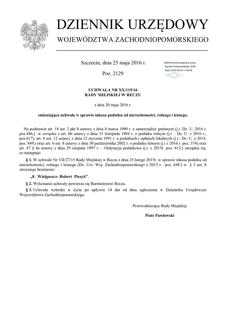 DZIENNIK URZĘDOWY WOJEWÓDZTWA ZACHODNIOPOMORSKIEGO Szczecin, dnia 25 maja 2016 r. Elektronicznie podpisany przez: Kamilla Grobicka-Madej; ZUW Data: 2016-05-25 11:20:00 Poz. 2129 UCHWAŁA NR XX/119/16 RADY MIEJSKIEJ W RECZU z dnia 20 maja 2016 r. zmieniająca uchwałę w sprawie inkasa podatku od nieruchomości, rolnego i leśnego. Na podstawie art. 18 ust. 2 pkt 8 ustawy z dnia 8 marca 1990 r. o samorządzie gminnym (j.t. Dz. U. 2016 r. poz.446,) w związku z art. 6b ustawy z dnia 15 listopada 1984 r. o podatku rolnym (j.t. : Dz. U. z 2016 r., poz.617), art. 6 ust. 12 ustawy z dnia 12 stycznia 1991 r. o podatkach i opłatach lokalnych (j.t.: Dz. U. z 2014, poz. 849,) oraz art. 6 ust. 8 ustawy z dnia 30 października 2002 r. o podatku leśnym (j.t z 2016 r. poz. 374) oraz art. 47 § 4a ustawy z dnia 29 sierpnia 1997 r. – Ordynacja podatkowa (j.t. z 2015r. poz. 613,) zarządza się, co następuje: § 1. W uchwale Nr VII/27/15 Rady Miejskiej w Reczu z dnia 25 lutego 2015r. w sprawie inkasa podatku od nieruchomości, rolnego i leśnego (Dz. Urz. Woj. Zachodniopomorskiego z 2015 r. poz. 648.) w § 3 ust. 8 otrzymuje brzmienie: „8 . Wielgoszcz- Robert Piesyk”. § 2. Wykonanie uchwały powierza się Burmistrzowi Recza. § 3. Uchwała wchodzi w życie po upływie 14 dni od dnia ogłoszenia w Dzienniku Urzędowym Województwa Zachodniopomorskiego. Przewodniczący Rady Miejskiej Piotr Pawłowski