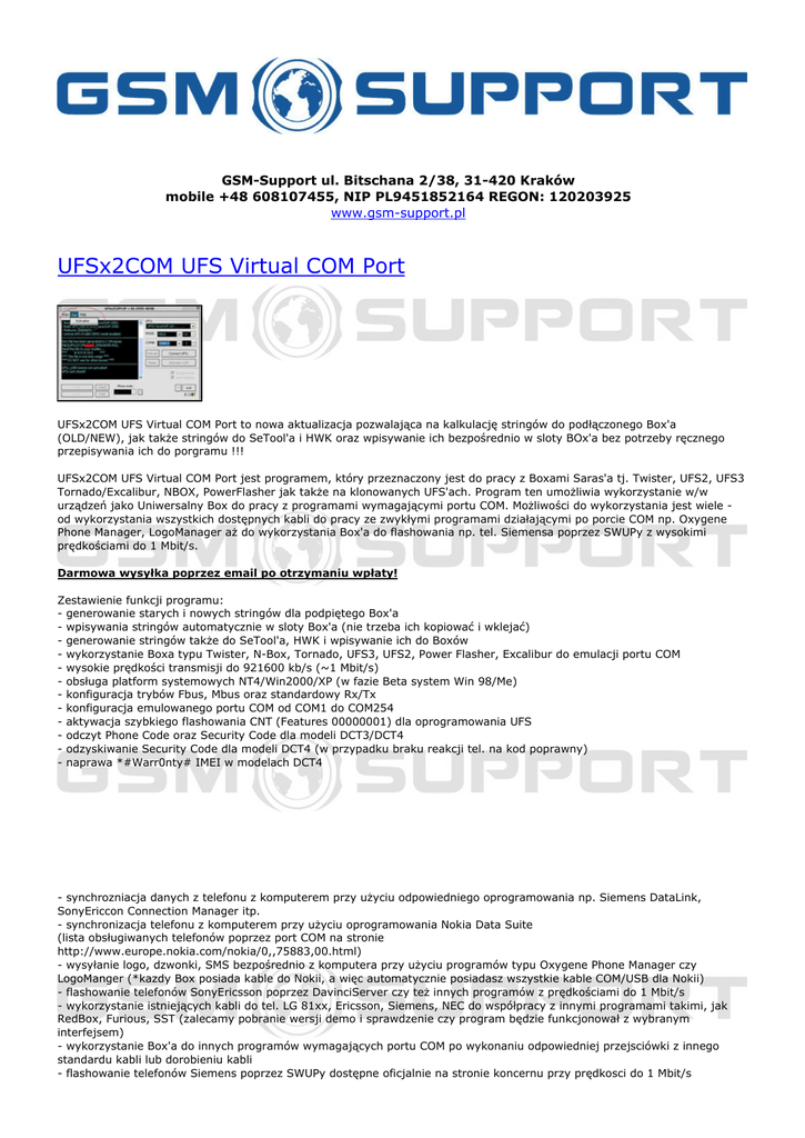 GSM-Support ul. Bitschana 2/38, 31-420 Kraków mobile +48 608107455, NIP PL9451852164 REGON: 120203925 www.gsm-support.pl UFSx2COM UFS Virtual COM Port UFSx2COM UFS Virtual COM Port to nowa aktualizacja pozwalająca na kalkulację stringów do podłączonego Box'a (OLD/NEW), jak także stringów do SeTool'a i HWK oraz wpisywanie ich bezpośrednio w sloty BOx'a bez potrzeby ręcznego przepisywania ich do porgramu !!! UFSx2COM UFS Virtual COM Port jest programem, który przeznaczony jest do pracy z Boxami Saras'a tj. Twister, UFS2, UFS3 Tornado/Excalibur, NBOX, PowerFlasher jak także na klonowanych UFS'ach. Program ten umożliwia wykorzystanie w/w urządzeń jako Uniwersalny Box do pracy z programami wymagającymi portu COM. Możliwości do wykorzystania jest wiele od wykorzystania wszystkich dostępnych kabli do pracy ze zwykłymi programami działającymi po porcie COM np. Oxygene Phone Manager, LogoManager aż do wykorzystania Box'a do flashowania np. tel. Siemensa poprzez SWUPy z wysokimi prędkościami do 1 Mbit/s. Darmowa wysyłka poprzez email po otrzymaniu wpłaty! Zestawienie funkcji programu: - generowanie starych i nowych stringów dla podpiętego Box'a - wpisywania stringów automatycznie w sloty Box'a (nie trzeba ich kopiować i wklejać) - generowanie stringów także do SeTool'a, HWK i wpisywanie ich do Boxów - wykorzystanie Boxa typu Twister, N-Box, Tornado, UFS3, UFS2, Power Flasher, Excalibur do emulacji portu COM - wysokie prędkości transmisji do 921600 kb/s (~1 Mbit/s) - obsługa platform systemowych NT4/Win2000/XP (w fazie Beta system Win 98/Me) - konfiguracja trybów Fbus, Mbus oraz standardowy Rx/Tx - konfiguracja emulowanego portu COM od COM1 do COM254 - aktywacja szybkiego flashowania CNT (Features 00000001) dla oprogramowania UFS - odczyt Phone Code oraz Security Code dla modeli DCT3/DCT4 - odzyskiwanie Security Code dla modeli DCT4 (w przypadku braku reakcji tel. na kod poprawny) - naprawa *#Warr0nty# IMEI w modelach DCT4 - synchrozniacja danych z telefonu z komputerem przy użyciu odpowiedniego oprogramowania np. Siemens DataLink, SonyEriccon Connection Manager itp. - synchronizacja telefonu z komputerem przy użyciu oprogramowania Nokia Data Suite (lista obsługiwanych telefonów poprzez port COM na stronie http://www.europe.nokia.com/nokia/0,,75883,00.html) - wysyłanie logo, dzwonki, SMS bezpośrednio z komputera przy użyciu programów typu Oxygene Phone Manager czy LogoManger (*kazdy Box posiada kable do Nokii, a więc automatycznie posiadasz wszystkie kable COM/USB dla Nokii) - flashowanie telefonów SonyEricsson poprzez DavinciServer czy też innych programów z prędkościami do 1 Mbit/s - wykorzystanie istniejących kabli do tel. LG 81xx, Ericsson, Siemens, NEC do współpracy z innymi programami takimi, jak RedBox, Furious, SST (zalecamy pobranie wersji demo i sprawdzenie czy program będzie funkcjonował z wybranym interfejsem) - wykorzystanie Box'a do innych programów wymagających portu COM po wykonaniu odpowiedniej przejsciówki z innego standardu kabli lub dorobieniu kabli - flashowanie telefonów Siemens poprzez SWUPy dostępne oficjalnie na stronie koncernu przy prędkosci do 1 Mbit/s Do korzystania z programu niezbędne jest posiadanie jednego z urządzeń typu Twister, UFS2, UFS3 Tornado/Excalibur, NBOX, PowerFlasher lub klon w/w. Zestaw zawiera: - oprogramowanie UFSX2COM - licencja UFSX2COM na 1 komputer - instrukcja uruchomienia ©2012 www.gsm-support.pl Opis ten nie stanowi oferty w rozumieniu Kodeksu Cywilnego. GSM-Support zastrzega sobie prawo do możliwych błędów w opisie produktu. Prosimy o weryfikację z Państwa strony, a w razie wątpliwości o kontakt. GSM-Support ul. Bitschana 2/38 31-420 Kraków POLSKA tel. 608107455 e-mail: [email protected] Powered by TCPDF (www.tcpdf.org)