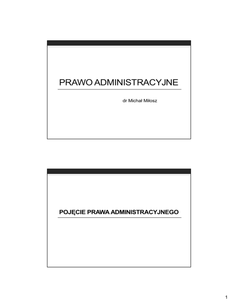 PRAWO ADMINISTRACYJNE dr Michał Miłosz POJĘCIE PRAWA ADMINISTRACYJNEGO 1 Całość norm prawnych powszechnie obowiązujących jako jednolity SYSTEM PRAWA. WYBRANE KRYTERIA WYODRĘBNIANIA GAŁĘZI PRAWA kryterium przedmiot regulacji [jest to również kryterium wyodrębniania DZIEDZIN PRAWA] kryterium metody regulacji (metoda cywilno-, karno-, administracyjno-prawna); kryterium zasad prawa; kryterium charakteru norm prawnych; charakterystyczne instytucje prawne; kodyfikacje; tradycja historyczna; potrzeby dydaktyczne. ZAKRES POJĘCIA PRAWA ADMINISTRACYJNEGO – RÓŻNE KONCEPCJE • brak jest definicji legalnej pojęcia prawa administracyjnego. • koncepcja szerokiego ujmowania pojęcie prawa administracyjnego jako zespołu norm materialnych, formalnych i ustrojowych – tzw. prawo administracyjne w szerokim znaczeniu (sensu largo). • prawo administracyjne w znaczeniu szerokim to zespół norm prawnych regulujących organizację i funkcjonowanie administracji publicznej oraz zachowanie się podmiotów w stosunku do niej nie podporządkowanych w zakresie nie unormowanym przez przepisy należące do innych gałęzi prawa. 2 Koncepcja wąskiego ujmowania pojęcia prawa administracyjnego i wyodrębnienie wśród gałęzi prawa: 1. prawa ustroju administracji publicznej (prawa administracyjnego ustrojowego), 2. administracyjnego prawa proceduralnego, 3. prawa administracyjnego (materialnego), – prawo administracyjne w wąskim znaczeniu (sensu stricto). koncepcja prawa administracyjnego profesora W. Dawidowicza odwołująca się do charakteru norm prawa administracyjnego. • Prawo materialne – obejmuje gałęzie prawa regulujące bezpośrednio stosunki społeczne - normy prawa materialnego regulują obowiązki i uprawnienia adresatów oraz ograniczają ich wolności. • Prawo formalne (proceduralne) – obejmuje gałęzie prawa regulujące tryb i zasady, które wyznaczają postępowanie mające na celu stosowanie norm prawa materialnego. • Prawo ustrojowe – obejmuje normy regulujące organizację i zasady funkcjonowania organów władzy. 3 • METODY DEFINIOWANIA ADMINISTRACYJNEGO POJĘCIA PRAWA - definicje negatywne / pozytywne - definicje określające pojęcie prawa administracyjnego poprzez odwołanie się do pojęcia administracji publicznej, - definicje opierając do cech prawa administracyjnego (np. cechy władztwa administracyjnego), - definicje odwołujące się do charakterystyki norm prawa administracyjnego. • Definicja M. Jaroszczyńskiego prawo administracyjne to „ ... gałąź prawa, która obejmuje ogół norm regulujących stosunki społeczne wynikające w procesie administracyjnej działalności organów państwowych” [M. Jaroszczyński, M. Zimmermann, W. Brzeziński, Polskie prawo administracyjne, cześć ogólna, Warszawa 1956] 4 • Definicja J. Starościaka „gałąź prawa, która reguluje działalność organów państwowych, podejmowaną w celu wykonania ustalonych prawem zadań organizatorskich wypełnianych w swoistych formach działania” – definicja odwołująca się do kategorii prawnych form działania „trzon prawa administracyjnego stanowią te przepisy, które mogą stanowić podstawę powstania stosunku administracyjnoprawnego” – definicja odwołująca się do kategorii stosunku administracyjno-prawnego [J. Starościak, Prawo administracyjne, Warszawa 1978] DEFINICJA PRAWA ADMINISTRACYJNEGO OPIERAJĄCA SIĘ NA CHARAKTERYSTYCE NORM PRAWA ADMINISTRACYJNEGO Prawo administracyjne (materialne): gałąź prawa, którą tworzy zespół norm powszechnie obowiązujących, o charakterze ogólnym i abstrakcyjnym, związanych funkcjonalnie z organami administracji w sensie ich stosowania lub kontroli przestrzegania, • których przedmiotem jest regulacja praw i obowiązków podmiotów nie podporządkowanych organizacyjnie ani służbowo administracji publicznej oraz • które nadają organów administracji publicznej kompetencje do jednostronnego regulowania sytuacji prawnej podmiotów zewnętrznych oraz do kontroli przestrzegania prawa i do stosowania środków egzekucyjnych w celu przywrócenia stanu zgodnego z prawem. 5 • W teorii prawa wyróżniono dwa zasadnicze rodzaje oddziaływania prawa na sytuację prawną adresatów: bezpośrednie oraz pośrednie oddziaływanie norm prawnych. • Za tym teoretycznym rozróżnieniem w nauce prawa administracyjnego przyjmuje się, że w powszechnie obowiązującym prawie administracyjnym istnieją dwa zasadnicze sposoby kształtowania sytuacji prawnej. • Wiążą się one z występowaniem w ramach prawa administracyjnego dwóch typów norm materialnych: - norm bezpośrednio regulujących sytuację prawną adresatów, - norm prawnych pośrednio regulujące sytuację prawną adresatów. NORMY PRAWA ADMINISTRACYJNEGO BEZPOŚREDNIO REGULUJĄCE SYTUACJE PRAWNĄ ADRESATÓW • normy ustanawiające bezpośrednio (tzn. bez udziału organu administracyjnego) uprawnienia lub obowiązki adresatów, którzy znajdą się w określonej sytuacji określonej przez prawo - normy te są bezpośrednio źródłem obowiązków lub uprawnień. • normy te tworzą po stronie adresata uprawnienia i obowiązki bez konieczności uruchomiania procesu stosowania prawa i wydania decyzji administracyjnej. • Funkcjonalnie związane są z nimi normy, które wyposażają organy administracji publicznej w kompetencje do kontroli przestrzegania prawa oraz do stosowania środków egzekucyjnych w celu przywrócenia stanu zgodnego z prawem. 6 NORMY PRAWA ADMINISTRACYJNEGO POŚREDNIO REGULUJĄCE SYTUACJE PRAWNĄ ADRESATÓW • normy takie nie tworzą konkretnie-indywidualnej sytuacji prawnej adresata, do jej ukształtowania konieczne jest akt stosowania normy (wydanie decyzji administracyjnej), w wyniku czego zostaje określona sytuacja prawna określonego podmiotu normy te tworzą po stronie adresata uprawnienia i obowiązki bez konieczności uruchomiania procesu stosowania prawa i wydania decyzji administracyjnej, • istnienie