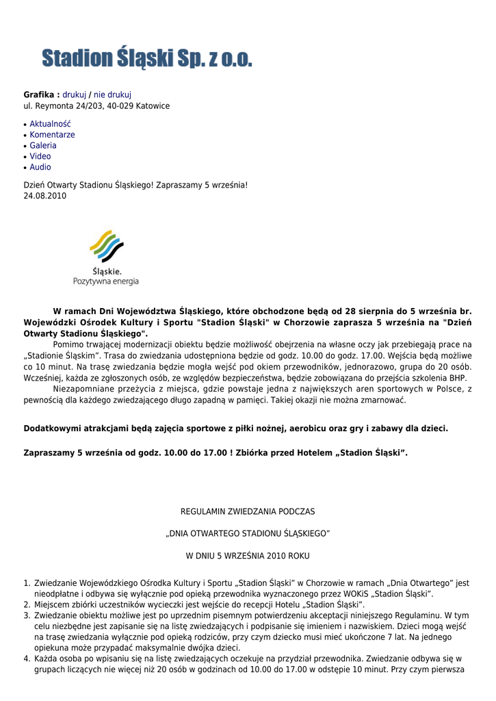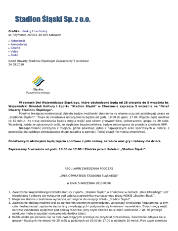 Grafika : drukuj / nie drukuj ul. Reymonta 24/203, 40-029 Katowice ● ● ● ● ● Aktualność Komentarze Galeria Video Audio Dzień Otwarty Stadionu Śląskiego! Zapraszamy 5 września! 24.08.2010 W ramach Dni Województwa Śląskiego, które obchodzone będą od 28 sierpnia do 5 września br. Wojewódzki Ośrodek Kultury i Sportu "Stadion Śląski" w Chorzowie zaprasza 5 września na "Dzień Otwarty Stadionu Śląskiego". Pomimo trwającej modernizacji obiektu będzie możliwość obejrzenia na własne oczy jak przebiegają prace na „Stadionie Śląskim”. Trasa do zwiedzania udostępniona będzie od godz. 10.00 do godz. 17.00. Wejścia będą możliwe co 10 minut. Na trasę zwiedzania będzie mogła wejść pod okiem przewodników, jednorazowo, grupa do 20 osób. Wcześniej, każda ze zgłoszonych osób, ze względów bezpieczeństwa, będzie zobowiązana do przejścia szkolenia BHP. Niezapomniane przeżycia z miejsca, gdzie powstaje jedna z największych aren sportowych w Polsce, z pewnością dla każdego zwiedzającego długo zapadną w pamięci. Takiej okazji nie można zmarnować. Dodatkowymi atrakcjami będą zajęcia sportowe z piłki nożnej, aerobicu oraz gry i zabawy dla dzieci. Zapraszamy 5 września od godz. 10.00 do 17.00 ! Zbiórka przed Hotelem „Stadion Śląski”. REGULAMIN ZWIEDZANIA PODCZAS „DNIA OTWARTEGO STADIONU ŚLĄSKIEGO” W DNIU 5 WRZEŚNIA 2010 ROKU 1. Zwiedzanie Wojewódzkiego Ośrodka Kultury i Sportu „Stadion Śląski” w Chorzowie w ramach „Dnia Otwartego” jest nieodpłatne i odbywa się wyłącznie pod opieką przewodnika wyznaczonego przez WOKiS „Stadion Śląski”. 2. Miejscem zbiórki uczestników wycieczki jest wejście do recepcji Hotelu „Stadion Śląski”. 3. Zwiedzanie obiektu możliwe jest po uprzednim pisemnym potwierdzeniu akceptacji niniejszego Regulaminu. W tym celu niezbędne jest zapisanie się na listę zwiedzających i podpisanie się imieniem i nazwiskiem. Dzieci mogą wejść na trasę zwiedzania wyłącznie pod opieką rodziców, przy czym dziecko musi mieć ukończone 7 lat. Na jednego opiekuna może przypadać maksymalnie dwójka dzieci. 4. Każda osoba po wpisaniu się na listę zwiedzających oczekuje na przydział przewodnika. Zwiedzanie odbywa się w grupach liczących nie więcej niż 20 osób w godzinach od 10.00 do 17.00 w odstępie 10 minut. Przy czym pierwsza grupa może wyruszyć na trasę zwiedzania o godz. 10.00, a ostatnia grupa o godz. 16.50. Czas zwiedzania trasy przez jedną grupę zwiedzającą wynosi maksymalnie 10 minut. 5. Niezależnie od podanych godzin zwiedzania, ze względów bezpieczeństwa w godzinach od 10.00 do 17.00 przez wyznaczoną trasę może przejść nie więcej niż 900 osób. 6. Zwiedzanie obiektu odbywa się po wyznaczonej trasie i na własną odpowiedzialność osób zwiedzających. Ze względów bezpieczeństwa oraz faktu, że zwiedzania odbywa się także w wyznaczonej części placu budowy modernizowanego obiektu, każdy z uczestników musi przejść szkolenie BHP. Szkolenie odbywać się będzie przed wejściem na trasę zwiedzania w holu recepcji Hotelu „Stadion Śląski”. 7. Szkolenie BHP przeprowadzać będą uprawnieni do tego pracownicy Hochtief Polska. Każdy z uczestników wycieczki, podczas całej trasy zwiedzania, musi mieć założoną odzież ochronną: kask ochronny i kamizelkę odblaskową. Odzież ochronną, każdy ze zwiedzających otrzyma podczas szkolenia BHP od pracownika Hochtief Polska. Zwiedzający na całej trasie zwiedzania zobowiązani są do przestrzegania zasad bezpieczeństwa, także bezpieczeństwa innych uczestników wycieczki. 8. Osoby zwiedzające zobowiązane są do stosowania się do poleceń przewodnika oraz poruszania się wyłącznie po wyznaczonej trasie zwiedzania. Za niewłaściwe zachowanie oraz niepodporządkowanie się poleceniom obsługi, korzystający może zostać natychmiast usunięty z obiektu. Na całej trasie zwiedzania obowiązuje całkowity zakaz palenia tytoniu oraz spożywania napojów alkoholowych. Osoby będące pod wpływem alkoholu i środków odurzających nie będą wpuszczane na trasę zwiedzania. 9. Po przejściu trasy zwiedzania, każdy ze zwiedzających zobowiązany jest do zdania odzieży ochronnej w holu recepcji Hotelu „Stadion Śląski” pracownikom WOKiS „Stadion Śląski”. 10. Podczas zwiedzania zezwala się na fotografowanie do celów prywatnych, przy czym zabrania się wnoszenia na trasę zwiedzania sprzętu foto-video, których ogniskowa przekracza 65 mm. 11. Na trasę zwiedzania zabrania się wprowadzania zwierząt, wjeżdżania pojazdami silnikowymi, rowerami, wózkami oraz jazdy na rolkach i deskorolkach. WOKiS „STADION ŚLĄSKI” HOCHTIEF POLSKA więcej informacji na temat Dni Województwa Śląskiego: www.silesia-region.pl wszystkie wiadomości tladyee oHUKaP mgnmiaegzomr, [url=http://ifsefgehvhob.com/]ifsefgehvhob[/url], [link=http://knqgnbcafqbk.com/]knqgnbcafqbk[/link], http://nuqvfhhpdiwl.com/ 2011-10-13 02:43:42 sjucudent P6E9uw miilhkurhhhr, [url=http://smoczubkwlpg.com/]smoczubkwlpg[/url], [link=http://gncqohpfcdzq.com/]gncqohpfcdzq[/link], http://zjvnhwaczfgk.com/ 2011-12-04 03:57:20 ArOjJcRCtNoJalSCciB Poza tym EXIF zdjęć Allena Paula wskazuje, że jest to zdjęcie z lądowania. Pierwsze zdjęcie - wylot, drguie przylot, trzecie - Katyń itd. 2012-08-06 00:08:00 UamFvhvo rXrGNE cbpueunwsowi 2012-08-06 21:09:30 Treść komentarza: Autor: Przepisz token jeżeli chcesz wysłać powyższy komentarz to NIE ZAZNACZAJ tego pola dodaj komentarz