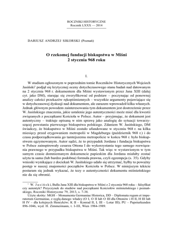 ROCZNIKI HISTORYCZNE Rocznik LXXX — 2014 DARIUSZ ANDRZEJ SIKORSKI (Poznań) O rzekomej fundacji biskupstwa w Miśni 2 stycznia 968 roku I. W studium ogłoszonym w poprzednim tomie Roczników Historycznych Wojciech Jasiński1 podjął się krytycznej oceny dotychczasowego stanu badań nad datowanym na 2 stycznia 968 r. dokumentem dla Miśni wystawionym przez Jana XIII (dalej cyt. jako DM), starając się zweryfikować od podstaw – poczynając od ponownej analizy całości przekazów rękopiśmiennych – wszystkie argumenty pojawiające się w dotychczasowej dyskusji nad dokumentem, ale zarazem wprowadził kilka własnych. Jednak głównym powodem zainteresowania tym dokumentem jest dostrzeżenie przez W. Jasińskiego znaczenia, jakie ustalenie jego autentyczności może mieć dla kwestii związanych z początkami Kościoła w Polsce. Autor – przyjmując, że dokument jest autentyczny – traktuje opisaną w nim sprawę jako analogię do sytuacji towarzyszącej powstaniu pierwszego biskupstwa polskiego. Zdaniem W. Jasińskiego, DM świadczy, że biskupstwo w Miśni zostało ufundowane w styczniu 968 r. na kilka miesięcy przed erygowaniem metropolii w Magdeburgu (październik 968 r.) i do czasu podporządkowania go tamtejszemu metropolicie w końcu 968 r. było biskupstwem egzymowanym. Autor sądzi, że to przypadek Jordana i fundacja biskupstwa w Polsce zainspirowały cesarza Ottona I do wykorzystania tego samego rozwiązania prawnego w przypadku biskupstwa w Miśni. Tak więc w wystawionym w tym samym czasie domniemanym dokumencie papieskim dla Jordana miałaby zostać użyta ta sama (lub bardzo podobna) formuła prawna, czyli egzempcja (s. 35). Gdyby wnioski wynikające z dociekań W. Jasińskiego udało się utrzymać, byłby to poważny postęp w naszej znajomości początków Kościoła w Polsce. W niniejszym tekście postaram się jednak wykazać, że tezy o autentyczności dokumentu miśnieńskiego nie da się obronić. 1 W. J a s i ń s k i, Bulla Jana XIII dla biskupstwa w Miśni z 2 stycznia 968 roku – falsyfikat czy autentyk? Przyczynek do studiów nad początkami Kościołów miśnieńskiego i poznańskiego, Roczniki Historyczne 79, 2013, s. 7-38. Użyte skróty: MGH – Monumenta Germaniae Historica, DD – Diplomata regum et imperatorum Germaniae, z syglą danego władcy (O I, O II lub O III dla Ottonów i H II, H III lub H IV – dla kolejnych Henryków; K II – Konrad II, L III – Lotar III); PU – Papsturkunden 896-1046, wyd. H. Zimmermann, t. I-III, Wien 1984-1989. 32 Dariusz Andrzej Sikorski W. Jasiński stoi na stanowisku, że tekst dokumentu Jana XIII, w znanej nam postaci (poza dwiema interpolacjami z grupy rękopisów F, C, D), jest w całości autentyczny. Podobieństwa do datowanego na ten sam dzień dyplomu papieskiego (bez wątpienia autentycznego) dla opactwa w Hersfeld (dalej cyt. jako DH), w którym zostało ono egzymowane spod władzy miejscowego biskupa, wynikają z faktu, iż oba dokumenty przygotował ten sam kancelista Stefan, oraz z analogicznych – przynajmniej w zakresie odnoszącym się do klasztorów – rozporządzeń obu dokumentów papieskich. Zbieżności między DH a DM są szczególnie uderzające dlatego, że DM przygotowano wyłącznie na podstawie już gotowego DH2. W. Jasiński przyjmuje zatem – za Joachimem Huthem3 – stanowisko, które można określić jako maksymalistyczne, gdyż inni badacze tego zabytku (m.in. Karl Uhlirz i Harald Zimmermann) uważali, że za podstawę DM służył jakiś autentyczny, zaginiony przywilej Jana XIII dla klasztoru w Miśni, lecz znany tekst jest w znacznym stopniu, zwłaszcza w odniesieniu do tej części, która jest interpretowana jako egzempcja biskupstwa, podfałszowany. Nie wyliczam już badaczy uznających ten dokument w całości za fałszerstwo, które przygotowano na podstawie wspomnianego przywileju dla klasztoru w Hersfeld4. Część argumentów za autentycznością DM W. Jasiński przejął z trwającej już 130 lat dyskusji nad DM. Jednak Autor nie zauważył, że niektóre z nich – formułowane przecież kilkanaście dekad wcześniej – możemy obecnie łatwo zweryfikować, dysponując pełniejszą wiedzą. Dotyczy to m.in. przytoczonej przez Autora opinii K. Uhlirza z 1895 r. (s. 10), że jest mało prawdopodobne, aby fałszerz przeprowadził specjalną kwerendę poza Miśnią w celu znalezienia odpowiedniego dokumentu papieskiego, który mógłby wykorzystać do fałszerstwa. Opinia Uhlirza opiera się na doświadczeniu, które rzeczywiście potwierdza taką tendencję ówczesnych fałszerzy, gdyż jako podkładek używali dokumentów z najbliższego otoczenia, najczęściej z zasobów rodzimej instytucji, ale nie jest to jednak regułą, która by wykluczała wykorzystanie oryginalnego dokumentu znajdującego się w innej instytucji, np. w klasztorze w Hersfeld, przez fałszerza pracującego na rzecz biskupstwa w Miśni5. Tej ścisłej zależności dowodzi fakt, że w DM partie wspólne z Liber diurnus (LD) nie przekraczają tych zapożyczeń z LD, które znajdują się w DH. Innymi słowy, DM nie zawiera żadnej nadwyżki pochodzącej z LD w stosunku do DH, czyli jest po prostu nieprawdopodobne, aby kancelista, korzystając nawet wyłącznie z tych samych formularzy w LD, napisał tekst pod tym względem identyczny. 3 J. H u t h, Neues zur Missions- und Frühgeschichte des Bistums Meißen und seiner Nachbarn. Das heidnische und christliche Slaventum, w: Acta II Congressus internationalis historiae Slavicae Salisburgo-Ratisbonensis anno 1967 celebrati, Wiesbaden 1970, s. 76-78; t e n ż e, Die Frühgeschichte der Bistümer Meissen und Prag im Lichte der Bulle „Si semper sunt” vom 2. I. 968, Annales Instituti Slavici. Veröffentlichungen des Institutum SalisburgoRatisbonense Slavicum Salzburg-Wien-Regensburg 8 (Millenium Dioeceseos Pragensis 9731973. Beiträge zur Kirchengeschichte Mitteleuropas im 9.-11. Jahrhundert), Wien 1974. 4 Omówienie u Th. L u d w i g, Die