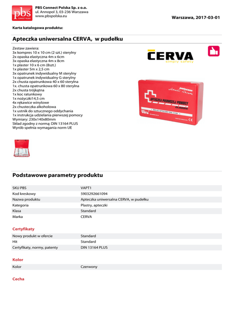 PBS Connect Polska Sp. z o.o. ul. Annopol 3, 03-236 Warszawa www.pbspolska.eu Karta katalogowa produktu: Apteczka uniwersalna CERVA, w pudełku Zestaw zawiera: 3x kompres 10 x 10 cm (2 szt.) sterylny 2x opaska elastyczna 4m x 6cm 3x opaska elastyczna 4m x 8cm 1x plaster 10 x 6 cm (8szt.) 1x plaster 5m x 2,5 cm 3x opatrunek indywidualny M sterylny 1x opatrunek indywidualny G sterylny 2x chusta opatrunkowa 40 x 60 sterylna 1x. chusta opatrunkowa 60 x 80 sterylna 2x chusta trójkątna 1x koc ratunkowy 1x nożyczki14,5 cm 4x rękawice winylowe 2x chusteczka alkoholowa 1x ustnik do sztucznego oddychania 1x instrukcja udzielania pierwszej pomocy Wymiary: 230x140x80mm Skład zgodny z normą: DIN 13164 PLUS Wyrób spełnia wymagania norm UE Podstawowe parametry produktu SKU PBS VAPT1 Kod kreskowy 5903292661094 Nazwa produktu Apteczka uniwersalna CERVA, w pudełku Kategoria Plastry, apteczki Klasa Standard Marka CERVA Certyfikaty Nowy produkt w ofercie Standard Hit Standard Certyfikaty, normy, patenty DIN 13164 PLUS Kolor Kolor Cecha Czerwony Warszawa, 2017-03-01 PBS Connect Polska Sp. z o.o. ul. Annopol 3, 03-236 Warszawa www.pbspolska.eu Karta katalogowa produktu cd. Apteczka uniwersalna CERVA, w pudełku Podstawowe parametry produktu Produkt Apteczka Typ W pudełku W ofercie od 2014-01 Wspólny słownik zamówień CPV 33141116-6 Warszawa, 2017-03-01
