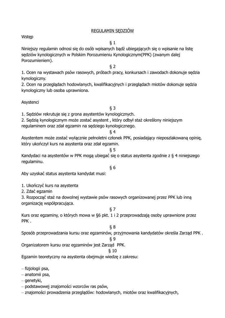 REGULAMIN SĘDZIÓW Wstęp §1 Niniejszy regulamin odnosi się do osób wpisanych bądź ubiegających się o wpisanie na listę sędziów kynologicznych w Polskim Porozumieniu Kynologicznym(PPK) (zwanym dalej Porozumieniem). §2 1. Ocen na wystawach psów rasowych, próbach pracy, konkursach i zawodach dokonuje sędzia kynologiczny. 2. Ocen na przeglądach hodowlanych, kwalifikacyjnych i przeglądach miotów dokonuje sędzia kynologiczny lub osoba uprawniona. Asystenci §3 1. Sędziów rekrutuje się z grona asystentów kynologicznych. 2. Sędzią kynologicznym może zostać asystent , który odbył staż określony niniejszym regulaminem oraz zdał egzamin na sędziego kynologicznego. §4 Asystentem może zostać wyłącznie pełnoletni członek PPK, posiadający nieposzlakowaną opinię, który ukończył kurs na asystenta oraz zdał egzamin. §5 Kandydaci na asystentów w PPK mogą ubiegać się o status asystenta zgodnie z § 4 niniejszego regulaminu. §6 Aby uzyskać status asystenta kandydat musi: 1. Ukończyć kurs na asystenta 2. Zdać egzamin 3. Rozpocząć staż na dowolnej wystawie psów rasowych organizowanej przez PPK lub inną organizację współpracująca. §7 Kurs oraz egzaminy, o których mowa w §6 pkt. 1 i 2 przeprowadzają osoby uprawnione przez PPK . §8 Sposób przeprowadzania kursu oraz egzaminów, przyjmowania kandydatów określa Zarząd PPK . §9 Organizatorem kursu oraz egzaminów jest Zarząd PPK. § 10 Egzamin teoretyczny na asystenta obejmuje wiedzę z zakresu: – fizjologii psa, – anatomii psa, – genetyki, – podstawowej znajomości wzorców ras psów, – znajomości prowadzenia przeglądów: hodowlanych, miotów oraz kwalifikacyjnych, – znajomości podstaw zoopsychologii, – znajomość regulaminów PPK. Egzamin praktyczny obejmuje: – ocenie psów na ringu wystawowym, – podczas przeglądu hodowlanego i kwalifikacyjnego, – podczas przeglądu miotu. Sprawdzenie znajomości: – obowiązków osób funkcyjnych na ringu wystawowym. § 11 Po zaliczeniu egzaminu , kandydat otrzymuje nominację na asystenta. § 12 Nominacja, o której mowa w § 11 uprawnia asystenta do przebywania na ringu podczas wystawy w charakterze asystenta sędziego kynologicznego, sekretarza ringowego oraz opiekuna ringu. § 13 1. Staż sędziego nie może trwać dłużej niż 2 lata od momentu otrzymania nominacji na sędziego stażystę. 2. W czasie trwania stażu, sędzia zobowiązany jest to zaliczenia określonej ilości asyst, przeglądów, sekretarzowania oraz opiekuna ringu. 3. Po okresie dwóch lat od momentu otrzymania nominacji, w przypadku braku podejścia do egzaminu na sędziego kynologicznego, nominacja zostaje anulowana. 4. Nominacja może zostań również anulowana za niezaliczenie egzaminu na sędziego kynologicznego, nieprzestrzeganie regulaminów PPK. § 14 1. Asystenta na równi z sędzią kynologicznym obowiązuje Kodeks Etyki Sędziego, który jest integralną częścią niniejszego regulaminu. 2. Asystent powinien wykonywać prace społeczne na rzecz PPK. § 15 W przypadku zaliczenia przez asystenta stażu w okresie do 2 lat od momentu otrzymania nominacji, może on przystąpić do egzaminu na sędziego kynologicznego. § 16 1. Sposób przeprowadzania egzaminu na sędziego kynologicznego określa Zarząd PPK. 2. Zakres egzaminu na sędziego kynologicznego obejmuje m.in: – rozszerzoną znajomość wzorców ras psów, – znajomość wzorców ras wybranej specjalizacji, – znajomość regulaminów PPK, – znajomość wybranych zagadnień w hodowli psów rasowych, – wykorzystanie wiedzy w praktycznej ocenie eksterieru, – znajomość prowadzenia dokumentacji hodowlanej. § 17 1. Zaliczenie egzaminu na sędziego kynologicznego jest podstawą do wydania nominacji na sędziego kynologicznego. Nominacja, o której tu mowa wydawana jest przez Zarząd Porozumienia i wiąże się z wpisaniem na listę sędziów kynologicznych PPK. 2. W przypadku niezaliczenia egzaminu kandydat na sędziego kynologicznego może ponownie przystąpić do egzaminu jednak nie wcześniej jak po upływie sześciu miesięcy od daty ostatniego egzaminu. 3. Wpisanie na listę sędziów kynologicznych, o którym mowa w § 17 pkt. 1 umożliwia osobie wpisanej samodzielne podejmowanie decyzji, o których mowa w § 2 niniejszego regulaminu. Sędziowie kynologiczni: § 18 Sędziowie kynologiczni dzielą się na sędziów międzynarodowych, sędziów ras oraz sędziów prób pracy psów. 1. Sędzią międzynarodowym zostaje osoba, która zdała egzamin na sędziego kynologicznego i została wpisana na listę sędziów kynologicznych Porozumienia. Sędzia kynologiczny może dokonywać oceny na krajowych i międzynarodowych wystawach psów rasowych, próbach pracy, konkursach, zawodach, wykonywać przeglądy hodowlane, kwalifikacyjne, przeglądy miotów oraz oceny hodowli. Sędzia międzynarodowy może oceniać psy na wystawach międzynarodowych, na które otrzymał zaproszenie. 2. Sędzia ras – to sędzia, który posiada odpowiednią wiedzę i uprawnienia do dokonywania oceny określonej rasy, kilku ras, bądź wszystkich ras. Sędzia wszystkich ras – to sędzia, który posiada odpowiednią wiedzę i uprawnienia do sędziowania wszystkich ras uznanych przez PPK na wszystkich wystawach. Sędzia taki uprawniony jest także do oceny konkurencji finałowych BOG, BIS. 3. Sędzia prób pracy psów – ocenia psy podczas zawodów, konkursów bądź pracy psów. 4. Sędziowie kynologiczni otrzymują od Zarządu pieczątkę sędziego kynologicznego oraz legitymację sędziowską, które są własnością PPK. 5. Sędziowie z innych organizacji kynologicznych po załączeniu odpowiednich dokumentów potwierdzających ich uprawnienia mogą otrzymać tytuł międzynarodowego sędziego Porozumienia. Kodeks etyki sędziego § 19 1. Sędzia kynologiczny podczas wykonywania swoich obowiązków powinien zawsze kierować się zasadami uczciwości, godności, honoru, poczuciem obowiązku oraz przest
