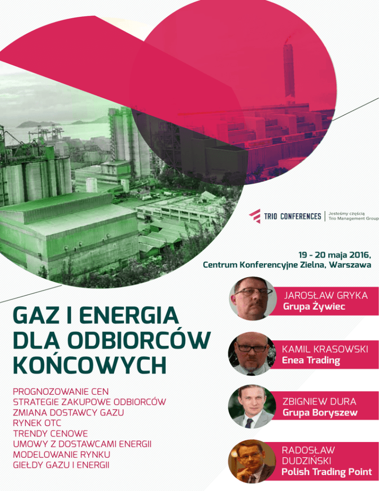19 - 20 maja 2016, Centrum Konferencyjne Zielna, Warszawa GAZ I ENERGIA DLA ODBIORCÓW KOŃCOWYCH PROGNOZOWANIE CEN STRATEGIE ZAKUPOWE ODBIORCÓW ZMIANA DOSTAWCY GAZU RYNEK OTC TRENDY CENOWE UMOWY Z DOSTAWCAMI ENERGII MODELOWANIE RYNKU GIEŁDY GAZU I ENERGII JAROSŁAW GRYKA Grupa Żywiec KAMIL KRASOWSKI Enea Trading ZBIGNIEW DURA Grupa Boryszew RADOSŁAW DUDZIŃSKI Polish Trading Point GAZ I ENERGIA DLA ODBIORCÓW KOŃCOWYCH Data: 19-20 maja 2016, Centrum Konferencyjne Zielna, Warszawa CHCIAŁBYŚ WIEDZIEĆ JAK z sukcesem zmienić dostawcę gazu? Szukasz narzędzi, aby skutecznie przewidywać ceny gazu i energii? Zastanawiasz się jak planować zakupy, by przy zachowaniu oszczędności zabezpieczyć dostawy? A może powstający rynek OTC będzie dobrym rozwiązaniem dla Twojej firmy? Borykasz się z zapisami umowy z dostawcą i nie wiesz, czy jest bezpieczna? A może chciałbyś poznać strategie zakupowe innych odbiorców końcowych? Weź udział w warsztatach i dowiedz się, jak możesz udoskonalić zarządzanie zakupami gazu i energii w swojej firmie. SWOJĄ WIEDZĄ I DOŚWIADCZENIEM PODZIELĄ SIĘ Z TOBĄ M.IN.: Jarosław Gryka, Category Manager / Energy, Aluminium & Risk Management, Grupa Żywiec – opowie, jak jego firma z sukcesem ROZSTAŁA SIĘ Z NAJWIĘKSZYM DOSTAWCĄ GAZU i czy warto było podjąć ten wysiłek Zbigniew Dura, Dyrektor ds. Zakupów w Grupie Boryszew – pokaże jak w praktyce wygląda PROCES ZMIANY DOSTAWCY GAZU i co trzeba zrobić, by cała operacja przebiegła pomyślnie Radosław Dudzinski, Prezes Zarządu Polish Trading Point – zaprezentuje obecne i planowane możliwości pozagiełdowego obrotu towarami na RYNKU OTC dr Paweł Słomiński, Członek Zarządu w Enigaz – omówi najważniejsze dla odbiorców końcowych zagadnienia wynikające z regulacji IRiESP i REMIT To wydarzenie jest z pewnością dla Ciebie, jeśli zajmujesz się zakupami gazu i energii, obszarem surowców energetycznych, zarządzania zasobami, analiz, strategii, ryzyka, prawnym, umów, odpowiadasz za produkcję i sprawy techniczne. Zapraszamy także spółki obrotu i dostawców energii i gazu. Oprócz możliwości wzbogacenia wiedzy, będziesz miał szansę przedyskutować ważne dla Ciebie zagadnienia z praktykami z innych branż, którzy odpowiadają za ten sam obszar zawodowy. Serdecznie zapraszam do kontaktu /Agnieszka Piśniak / Conference Coordination Director / [email protected] /+48 500 435 956 9:30 – Rejestracja, poranna kawa / 9.55 Przywitanie uczestników i rozpoczęcie warsztatów 10.00 Obowiązki i wyzwania regulacyjne uczestników rynku gazu Znaczenie zmian w Instrukcji Ruchu i Eksploatacji Sieci Przesyłowej dla odbiorców końcowych – co w praktyce oznaczają wprowadzone zapisy REMIT – jakie obowiązki na odbiorców końcowych nakłada system monitorowania hurtowych rynków energii i gazu (kto, co, jak, gdzie, kiedy) dr Paweł Słomiński, Członek Zarządu, Maciej Markowski, Członek Zarządu, Enigaz 11.00 Cena gazu dla odbiorcy końcowego Czynniki krótko i długoterminowe wpływające na ceny błękitnego paliwa Trendy cenowe na rynkach zachodnich i w Polsce – jak może się kształtować cena surowca w przyszłości Cena u odbiorcy – co się składa na koszt dostarczenia gazu do odbiorcy końcowego Uruchomienie terminalu LNG – czy i jak może wpłynąć na cenę gazu Uwarunkowania prawne rozwoju rynku Łukasz Lewicki, Zastępca Dyrektora Departamentu Handlu Hurtowego, Duon Marketing and Trading 11.40 Przerwa na kawę 12.00 Zmiana dostawcy nie taka straszna, jak ją malują – o tym, że warto szukać alternatywnych sprzedawców i jak to zrobić z sukcesem Czy rynek pomaga podejmować odważne decyzje? Przesłanki do zmiany dostawcy gazu – wolność vs. zależność – co wybrać? Jakie ryzyka towarzyszą zmianie dostawcy? Czy strach ma wielkie oczy? Jaka jest strategia firmy? Ile można zyskać? Jeden czy dwóch dostawców gazu? Elastyczny kontrakt, elastyczna budowa ceny – czy taka zmiana jest naprawdę możliwa? Jarosław Gryka, Category Manager/ Energy, Aluminium & Risk Management, Grupa Żywiec 13.00 Sprzedawca gazu niejedno ma imię Proces zmiany dostawcy: jakie kroki należy podjąć, by operacja przebiegła bez komplikacji Korzyści ze zmiany dostawcy – finansowe, operacyjne, prawne itp. Ryzyko – czy rezygnacja z operatora wiodącego zawsze ma sens i przyniesie więcej korzyści niż strat? Elastyczność umowy – czy możliwa jest optymalizacja cenowa w trakcie trwania umowy Zbigniew Dura, Dyrektor ds. Zakupów, Grupa Boryszew 13.40 Lunch 14.20 Zakupy energii i gazu – gdzie się na nie wybrać i jak prowadzić, by zabezpieczyć dostawy Modele zakupu – przykłady modeli transak cyjnych na podstawie danych rynkowych Transakcje giełdowe – Czy kupowanie na giełdzie jest dla wszystkich? Jak czytać notowania? Jakie czynniki mogą powodować ruchy notowań? Rynek dojrzewający – o dostępnych produktach energetycznych i gazowych dla odbiorców końcowych Nowa rola sprzedawcy energii i gazu – rosnące zapotrzebowanie na zintegrowane usługi doradcze dla klientów końcowych z obszaru energetyki Małgorzata Eull, Head of B2B, RWE Polska S.A. 15.00 Przerwa na kawę 15.10 Rynek OTC – czy pozagiełdowy obrót towarami może być odpowiedzią na potrzeby odbiorców Rynki OTC w Europie – jak tam odbywa się handel i czy można to przełożyć na polskie realia Obecne możliwości dokonywania transakcji na platformie OTC Elektroniczna platforma handlu – zasady i koszty działania Radosław Dudziński, Prezes Zarządu, Polish Trading Point 16.00 Zakończenie pierwszego dnia warsztatów Program warsztatów 19 maja, czwartek ENERGIA 9.00 Rejestracja i poranna kawa 9.30 Współpraca z dostawcami energii elektrycznej – co każdy odbiorca wiedzieć powinien Umowy z dostawcami – co powinna zawierać bezpieczna dla odbiorcy umowa ze sprzedawcą Klauzule niedozwolone oraz postanowienia, których należy się wystrzegać Możliwości reg