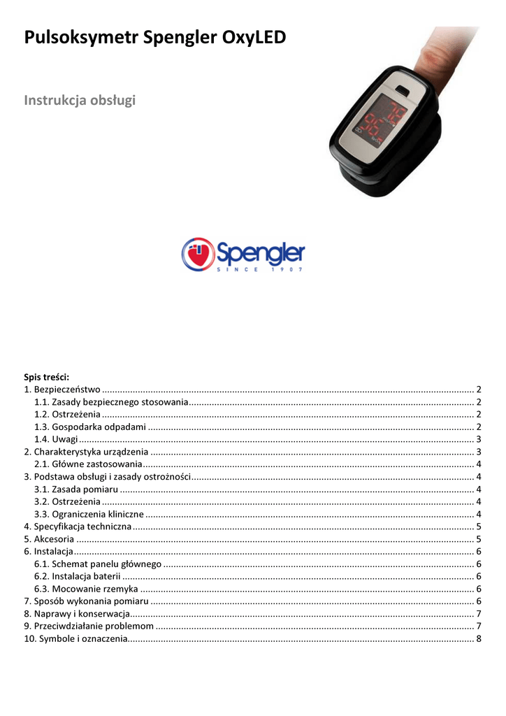 Pulsoksymetr Spengler OxyLED Instrukcja obsługi Spis treści: 1. Bezpieczeństwo .................................................................................................................................................. 2 1.1. Zasady bezpiecznego stosowania................................................................................................................ 2 1.2. Ostrzeżenia .................................................................................................................................................. 2 1.3. Gospodarka odpadami ................................................................................................................................ 2 1.4. Uwagi ........................................................................................................................................................... 3 2. Charakterystyka urządzenia ............................................................................................................................... 3 2.1. Główne zastosowania.................................................................................................................................. 4 3. Podstawa obsługi i zasady ostrożności............................................................................................................... 4 3.1. Zasada pomiaru ........................................................................................................................................... 4 3.2. Ostrzeżenia .................................................................................................................................................. 4 3.3. Ograniczenia kliniczne ................................................................................................................................. 4 4. Specyfikacja techniczna ...................................................................................................................................... 5 5. Akcesoria ............................................................................................................................................................ 5 6. Instalacja............................................................................................................................................................. 6 6.1. Schemat panelu głównego .......................................................................................................................... 6 6.2. Instalacja baterii .......................................................................................................................................... 6 6.3. Mocowanie rzemyka ................................................................................................................................... 6 7. Sposób wykonania pomiaru ............................................................................................................................... 6 8. Naprawy i konserwacja....................................................................................................................................... 7 9. Przeciwdziałanie problemom ............................................................................................................................. 7 10. Symbole i oznaczenia........................................................................................................................................ 8 Wprowadzenie Dziękujemy za zakup pulsoksymetru OxyLED. Niniejsza instrukcja została napisana w zgodności z dyrektywą MDD93/42/EEC oraz poprawką 2007/47/EC dla urządzeń medycznych. Wszelkie wprowadzone przez producenta modyfikacje urządzenia zmieniające treść instrukcji obsługi nie wymagają dalszego powiadamiania. Przed rozpoczęciem eksploatacji prosimy o uważne przeczytanie niniejszej instrukcji obsługi, gdyż błędna eksploatacja urządzenia może prowadzić do błędnych pomiarów lub może być przyczyną uszkodzenia urządzenia lub kontuzji odniesionej przez pacjenta. Producent nie ponosi odpowiedzialności za problemy wynikłe ze złej eksploatacji urządzenia i innych zaniedbań użytkownika. Gwarancja producenta nie obejmuje tego rodzaju nieprawidłowości. Uwagi ogólne Stosowanie urządzenia w sposób bezustanny może być nieprzyjemne a nawet bolesne, szczególnie u pacjentów o ograniczonym mikrokrążeniu. Zalecamy, aby nie umieszczać czujnika na tym samym palcu przez okres dłuższy niż 2 godziny. U niektórych pacjentów należy do tego podejść z jeszcze większą rozwagą. Pulsoksymetr nie może być umieszczany na tkankach, gdzie występuje obrzęk lub nadmierna wrażliwość. Stosowane przez pulsoksymetr światło podczerwieni (niewidoczne) jest szkodliwe dla oczu, dlatego nie należy wpatrywać się w źródło światła. Badana osoba nie powinna stosować lakieru do paznokci oraz makijażu na skórze w miejscu stosowania. Pozanoście nie powinny być zbyt długie. Prosimy o zapoznanie się z literaturą, która dokładnie opisuje środki ostrożności i inne ograniczenia kliniczne związane ze stosowaniem pulsoksymetrów. Urządzenie nie jest przeznaczone do zabiegów leczniczych. 1. BEZPIECZEŃSTWO 1.1. Zasady bezpiecznego stosowania • Regularnie, przynajmniej raz na tydzień, sprawdzaj urządzenie pod kątem występowania widocznych uszkodzeń. • W przypadku wystąpienia jakichkolwiek widocznych uszkodzeń, przestań stosować urządzenie. • Wszelkie naprawy urządzenia mogą być wykonywane tylko przez wykwalifikowany serwis. • Pulsoksymetr nie może być stosowany jednocześnie z urządzeniami, które nie zostały wyspecyfikowane w niniejszej instrukcji. • Urządzenie zostało skalibrowane fabrycznie. 1.2. Ostrzeżenia • Nie wolno stosować urządzenia w obecności łatwopalnych gazów, np. niektórych środków znieczulających. Grozi to wybuchem. • Nie wolno stosować urządzenia podczas badania rezonansem magnetycznych lub tom
