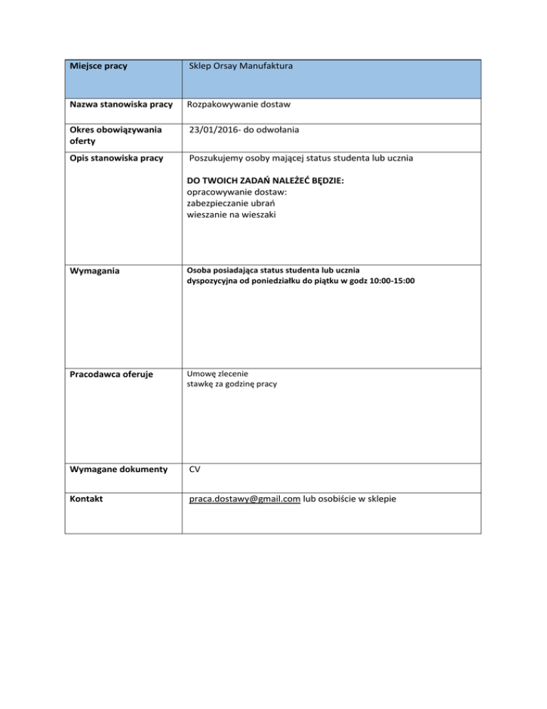Miejsce pracy Sklep Orsay Manufaktura Nazwa stanowiska pracy Rozpakowywanie dostaw Okres obowiązywania oferty 23/01/2016- do odwołania Opis stanowiska pracy Poszukujemy osoby mającej status studenta lub ucznia DO TWOICH ZADAŃ NALEŻEĆ BĘDZIE: opracowywanie dostaw: zabezpieczanie ubrań wieszanie na wieszaki Wymagania Osoba posiadająca status studenta lub ucznia dyspozycyjna od poniedziałku do piątku w godz 10:00-15:00 Pracodawca oferuje Umowę zlecenie stawkę za godzinę pracy Wymagane dokumenty CV Kontakt [email protected] lub osobiście w sklepie