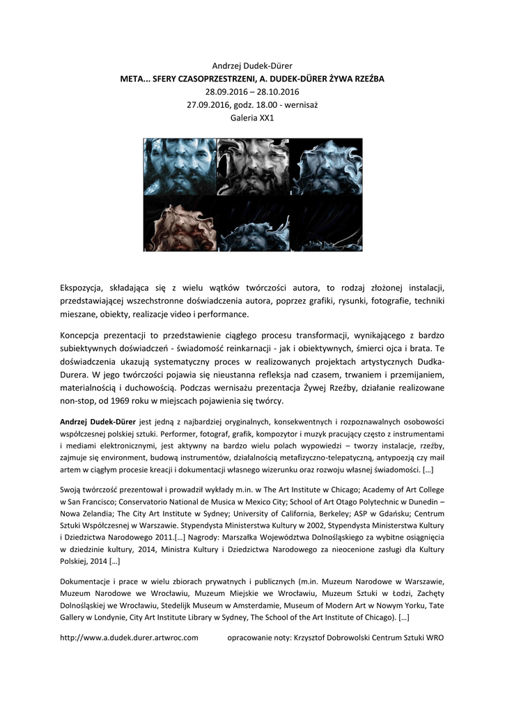 Andrzej Dudek-Dürer META... SFERY CZASOPRZESTRZENI, A. DUDEK-DÜRER ŻYWA RZEŹBA 28.09.2016 – 28.10.2016 27.09.2016, godz. 18.00 - wernisaż Galeria XX1 Ekspozycja, składająca się z wielu wątków twórczości autora, to rodzaj złożonej instalacji, przedstawiającej wszechstronne doświadczenia autora, poprzez grafiki, rysunki, fotografie, techniki mieszane, obiekty, realizacje video i performance. Koncepcja prezentacji to przedstawienie ciągłego procesu transformacji, wynikającego z bardzo subiektywnych doświadczeń - świadomość reinkarnacji - jak i obiektywnych, śmierci ojca i brata. Te doświadczenia ukazują systematyczny proces w realizowanych projektach artystycznych DudkaDurera. W jego twórczości pojawia się nieustanna refleksja nad czasem, trwaniem i przemijaniem, materialnością i duchowością. Podczas wernisażu prezentacja Żywej Rzeźby, działanie realizowane non-stop, od 1969 roku w miejscach pojawienia się twórcy. Andrzej Dudek-Dürer jest jedną z najbardziej oryginalnych, konsekwentnych i rozpoznawalnych osobowości współczesnej polskiej sztuki. Performer, fotograf, grafik, kompozytor i muzyk pracujący często z instrumentami i mediami elektronicznymi, jest aktywny na bardzo wielu polach wypowiedzi – tworzy instalacje, rzeźby, zajmuje się environment, budową instrumentów, działalnością metafizyczno-telepatyczną, antypoezją czy mail artem w ciągłym procesie kreacji i dokumentacji własnego wizerunku oraz rozwoju własnej świadomości. […] Swoją twórczość prezentował i prowadził wykłady m.in. w The Art Institute w Chicago; Academy of Art College w San Francisco; Conservatorio National de Musica w Mexico City; School of Art Otago Polytechnic w Dunedin – Nowa Zelandia; The City Art Institute w Sydney; University of California, Berkeley; ASP w Gdańsku; Centrum Sztuki Współczesnej w Warszawie. Stypendysta Ministerstwa Kultury w 2002, Stypendysta Ministerstwa Kultury i Dziedzictwa Narodowego 2011.[…] Nagrody: Marszałka Województwa Dolnośląskiego za wybitne osiągnięcia w dziedzinie kultury, 2014, Ministra Kultury i Dziedzictwa Narodowego za nieocenione zasługi dla Kultury Polskiej, 2014 […] Dokumentacje i prace w wielu zbiorach prywatnych i publicznych (m.in. Muzeum Narodowe w Warszawie, Muzeum Narodowe we Wrocławiu, Muzeum Miejskie we Wrocławiu, Muzeum Sztuki w Łodzi, Zachęty Dolnośląskiej we Wrocławiu, Stedelijk Museum w Amsterdamie, Museum of Modern Art w Nowym Yorku, Tate Gallery w Londynie, City Art Institute Library w Sydney, The School of the Art Institute of Chicago). […] http://www.a.dudek.durer.artwroc.com opracowanie noty: Krzysztof Dobrowolski Centrum Sztuki WRO