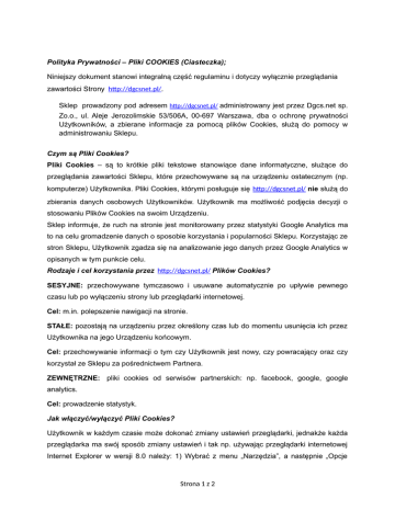 Polityka Prywatności – Pliki COOKIES (Ciasteczka); Niniejszy dokument stanowi integralną część regulaminu i dotyczy wyłącznie przeglądania zawartości Strony http://dgcsnet.pl/. Sklep prowadzony pod adresem http://dgcsnet.pl/ administrowany jest przez Dgcs.net sp. Zo.o., ul. Aleje Jerozolimskie 53/506A, 00-697 Warszawa, dba o ochronę prywatności Użytkowników, a zbierane informacje za pomocą plików Cookies, służą do pomocy w administrowaniu Sklepu. Czym są Pliki Cookies? Pliki Cookies – są to krótkie pliki tekstowe stanowiące dane informatyczne, służące do przeglądania zawartości Sklepu, które przechowywane są na urządzeniu ostatecznym (np. komputerze) Użytkownika. Pliki Cookies, którymi posługuje się http://dgcsnet.pl/ nie służą do zbierania danych osobowych Użytkowników. Użytkownik ma możliwość podjęcia decyzji o stosowaniu Plików Cookies na swoim Urządzeniu. Sklep informuje, że ruch na stronie jest monitorowany przez statystyki Google Analytics ma to na celu gromadzenie danych o sposobie korzystania i popularności Sklepu. Korzystając ze stron Sklepu, Użytkownik zgadza się na analizowanie jego danych przez Google Analytics w opisanych w tym punkcie celu. Rodzaje i cel korzystania przez http://dgcsnet.pl/ Plików Cookies? SESYJNE: przechowywane tymczasowo i usuwane automatycznie po upływie pewnego czasu lub po wyłączeniu strony lub przeglądarki internetowej. Cel: m.in. polepszenie nawigacji na stronie. STAŁE: pozostają na urządzeniu przez określony czas lub do momentu usunięcia ich przez Użytkownika na jego Urządzeniu końcowym. Cel: przechowywanie informacji o tym czy Użytkownik jest nowy, czy powracający oraz czy korzystał ze Sklepu za pośrednictwem Partnera. ZEWNĘTRZNE: pliki cookies od serwisów partnerskich: np. facebook, google, google analytics. Cel: prowadzenie statystyk. Jak włączyć/wyłączyć Pliki Cookies? Użytkownik w każdym czasie może dokonać zmiany ustawień przeglądarki, jednakże każda przeglądarka ma swój sposób zmiany ustawień i tak np. używając przeglądarki internetowej Internet Explorer w wersji 8.0 należy: 1) Wybrać z menu „Narzędzia”, a następnie „Opcje Strona 1 z 2 internetowe”; 2) Przejść do zakładki „Prywatność”; 3) Użyć suwaka w celu ustawienia preferencji." Przeglądarki internetowe często domyślnie mają ustawioną możliwość instalowania Plików Cookies na urządzeniu końcowym Użytkownika. Sklep informuje, iż wyłączenie przez Użytkownika możliwości korzystania z plików Cookies może wpłynąć na funkcjonalność Sklepu. Jakie dane są przetwarzane? http://dgcsnet.pl/ przetwarza dane podane dobrowolnie przez Użytkownika w celu otrzymywania aktualności związanych z działalnością Sklepu. Sklep zobowiązuje się do bezpiecznego przechowywania danych i nie odstępowania ich osobom trzecim. Użytkownik ma prawo wglądu do swoich danych oraz ma możliwość zgłoszenia żądania usunięcia bądź poprawienia danych poprzez wysłanie wiadomości e-mail. Przekierowanie do innych stron. Sklep http://dgcsnet.pl/ zawiera odnośniki do innych stron WWW. Użytkownik każdorazowo wchodząc na nową stronę WWW powinien zapoznać się z Polityka Prywatności – Pliki Cookies. Sklep http://dgcsnet.pl/ nie ponosi odpowiedzialności za Politykę Prywatności – Pliki Cookies obowiązujące na tych stronach. Zmiany. W przypadku zmiany obowiązującej polityki prywatności – plików Cookies, wprowadzone zostaną odpowiednie modyfikacje do powyższego zapisu. Strona 2 z 2