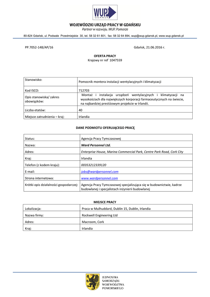 80-824 Gdańsk, ul. Podwale Przedmiejskie 30, tel. 58 32 61 801, fax: 58 32 64 894, [email protected], www.wup.gdansk.pl PP.7052-148/AP/16 Gdańsk, 21.06.2016 r. OFERTA PRACY : Krajowy nr ref 1047559 Stanowisko: Kod ISCO: Opis stanowiska/ zakres obowiązków: Pomocnik montera instalacji wentylacyjnych i klimatyzacji 712703 Montaż i instalacja urządzeń wentylacyjnych i klimatyzacji na wysokościach dla największych korporacji farmaceutycznych na świecie, na najbardziej prestiżowym projekcie w Irlandii. Liczba etatów: 40 Miejsce zatrudnienia – kraj: Irlandia DANE PODMIOTU OFERUJĄCEGO PRACĘ Status: Agencja Pracy Tymczasowej Nazwa: Ward Personnel Ltd. Adres: Enterprise House, Marina Commercial Park, Centre Park Road, Cork City Kraj: Irlandia Telefon (z kodem kraju): 00353212339120 E-mail: [email protected] Strona internetowa: www.wardpersonnel.com Krótki opis działalności gospodarczej: Agencja Pracy Tymczasowej specjalizująca się w budownictwie, kadrze budowlanej i specjalistach inżynierii budowlanej MIEJSCE PRACY Lokalizacja: Praca w Mulhuddard, Dublin 15, Dublin, Irlandia Nazwa firmy: Rockwell Engineering Ltd Adres: Macroom, Cork Kraj: Irlandia WYMAGANIA Doświadczenie zawodowe: Minimum 1 rok doświadczenia w układaniu kanałów wentylacyjnych. Znajomość języków: Język Poziom 1.angielski 1.komunikatywny WYNAGRODZENIE I WARUNKI ZATRUDNIENIA Wysokość pensji brutto: 15,66 + dodatki za pracę w nadgodzinach +dodatek za dojazd (nawet w przypadku pracy bez konieczności dojazdu) 39 godzin płatnych 100%, każda kolejna płatna 150%, w soboty powyżej 4 godziny- 200% Waluta, w jakiej wypłacana jest pensja: EUR Rodzaj stawki wynagrodzenia: godzinowa Premie: Za nadgodziny Rodzaj umowy: Umowa o pracę Wymiar czasu pracy: Pełen etat Czas trwania umowy: nieokreślony Liczba godzin tygodniowo: 45 + Zmiany i praca w dni wolne: Praca w soboty Data rozpoczęcia: 01.07.2016 Inne informacje: Zakwaterowanie we własnym zakresie, natomiast firma organizuje pierwsze zakwaterowanie(ok. 400 EUR/miesiąc), a także pomoc w pozostałych sprawach organizacyjnych na miejscu. SPOSÓB SKŁADANIA WNIOSKU Wymagane dokumenty: CV Język, w którym muszą być sporządzone przedkładane dokumenty: Język angielski lub polski Do kogo należy wysłać dokumenty: [email protected] oraz do wiadomości asystenta EURES: [email protected]. W tytule maila proszę wpisać: „Irlandia – pomocnik montera instalacji wentylacyjnej i klimatyzacji” Gdzie należy wysłać dokumenty: Mateusz Mis 00353877971161,[email protected] DODATKOWE INFORMACJE Pracodawca oferuje dodatkowa opłatę na fundusz emerytalny oraz ubezpieczenie zdrowotne+ dodatkowe ubezpieczenie od wypadku. Praca w bardzo przyjaznej atmosferze, gdzie firma na pierwszym miejscu stawia pracownika i szacunek wobec jego osoby. Start w grupach po 4 osoby od początku Lipca, wiec jeżeli ktoś nie może zacząć od razu, nadal może się zakwalifikować na kolejne wyjazdy. Doświadczeni monterzy mogą zorganizować swoja własna ekipę. WAŻNOŚĆ Data publikacji: 22.06.2016 Termin przedkładania podań o pracę / zakończenia ważności oferty: Do odwołania Agencja WARD Personnel oświadczyła, że prowadzi działalność zgodnie z przepisami obowiązującymi w Irlandii. Uprzejmie informujemy, że skontaktujemy się wyłącznie z wybranymi kandydatami. UWAGA: 1. Umowa z zagranicznym pracodawcą zostanie zawarta zgodnie z prawem kraju zatrudnienia. Oznacza to, że wszystkie roszczenia odnośnie do warunków, które obejmuje umowa, można kierować wyłącznie do odpowiedniego sądu w kraju zatrudnienia. Publiczne służby zatrudnienia (EURES) nie mogą pośredniczyć ani reprezentować pracownika w sądzie kraju zatrudnienia w przypadku sporu z pracodawcą. 2. Publiczne służby zatrudnienia (EURES) dokładają wszelkich starań, aby zapewnić rzetelność i wiarygodność ofert pracy zgłoszonych w lokalnym urzędzie pracy. Należy wyjaśnić, że oferta pracy została zgłoszona przez stronę trzecią i EURES nie odpowiada za ewentualne rozbieżności między warunkami pracy określonymi w ofercie pracy i warunkami oferowanymi przez potencjalnego pracodawcę. 3. Publiczne służby zatrudnienia (EURES) informują, że będą zbierać, przetwarzać i przekazywać potencjalnym pracodawcom zgodnie z przepisami dotyczącymi ochrony danych osobowych wszystkie dane osobowe dostarczone przez osoby poszukujące pracy.