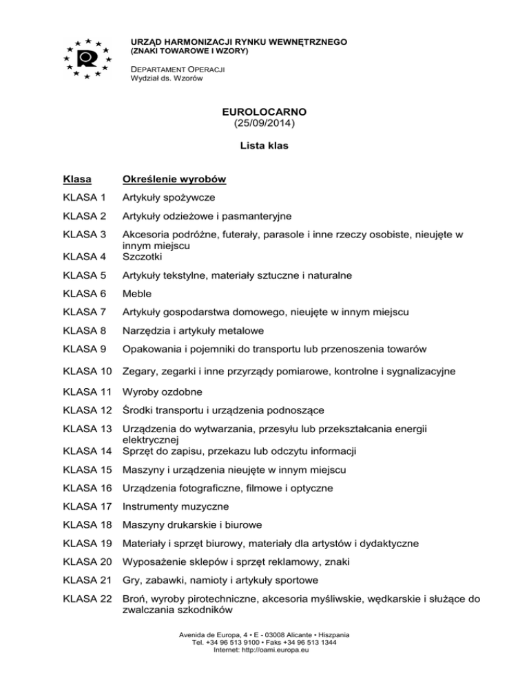 URZĄD HARMONIZACJI RYNKU WEWNĘTRZNEGO (ZNAKI TOWAROWE I WZORY) DEPARTAMENT OPERACJI Wydział ds. Wzorów EUROLOCARNO (25/09/2014) Lista klas Klasa Określenie wyrobów KLASA 1 Artykuły spożywcze KLASA 2 Artykuły odzieżowe i pasmanteryjne KLASA 3 KLASA 4 Akcesoria podróżne, futerały, parasole i inne rzeczy osobiste, nieujęte w innym miejscu Szczotki KLASA 5 Artykuły tekstylne, materiały sztuczne i naturalne KLASA 6 Meble KLASA 7 Artykuły gospodarstwa domowego, nieujęte w innym miejscu KLASA 8 Narzędzia i artykuły metalowe KLASA 9 Opakowania i pojemniki do transportu lub przenoszenia towarów KLASA 10 Zegary, zegarki i inne przyrządy pomiarowe, kontrolne i sygnalizacyjne KLASA 11 Wyroby ozdobne KLASA 12 Środki transportu i urządzenia podnoszące KLASA 13 Urządzenia do wytwarzania, przesyłu lub przekształcania energii elektrycznej KLASA 14 Sprzęt do zapisu, przekazu lub odczytu informacji KLASA 15 Maszyny i urządzenia nieujęte w innym miejscu KLASA 16 Urządzenia fotograficzne, filmowe i optyczne KLASA 17 Instrumenty muzyczne KLASA 18 Maszyny drukarskie i biurowe KLASA 19 Materiały i sprzęt biurowy, materiały dla artystów i dydaktyczne KLASA 20 Wyposażenie sklepów i sprzęt reklamowy, znaki KLASA 21 Gry, zabawki, namioty i artykuły sportowe KLASA 22 Broń, wyroby pirotechniczne, akcesoria myśliwskie, wędkarskie i służące do zwalczania szkodników Avenida de Europa, 4 • E - 03008 Alicante • Hiszpania Tel. +34 96 513 9100 • Faks +34 96 513 1344 Internet: http://oami.europa.eu KLASA 23 Urządzenia do przesyłu cieczy, urządzenia sanitarne, grzewcze, wentylacyjne i klimatyzacyjne; paliwa stałe KLASA 24 Urządzenia medyczne i laboratoryjne KLASA 25 Elementy budowlane i konstrukcyjne KLASA 26 Urządzenia oświetleniowe KLASA 27 Artykuły tytoniowe i akcesoria dla palaczy KLASA 28 Środki farmaceutyczne i kosmetyki, artykuły toaletowe i urządzenia fryzjersko-kosmetyczne KLASA 29 Urządzenia i sprzęt przeciwpożarowy, ratunkowy i do zapobiegania wypadkom KLASA 30 Artykuły do hodowli zwierząt KLASA 31 Maszyny i urządzenia do przygotowywania żywności i napojów nieujęte w innym miejscu KLASA 32 Graficzne symbole i logo, wzory powierzchniowe, zdobienia -I/2- Lista klas i podklas Klasa i podklasa Określenie wyrobów KLASA 1 Artykuły spożywcze 01 Pieczywo, herbatniki, ciasta, makaron i inne produkty zbożowe, czekoladki, wyroby cukiernicze, lody Warzywa i owoce Sery, masło i substytuty masła, inny nabiał Mięso (także wieprzowina), ryby [wolne] Pokarm dla zwierząt Różne Artykuły odzieżowe i pasmanteryjne Bielizna damska i męska, gorsety, biustonosze, bielizna nocna Odzież Nakrycia głowy Obuwie, skarpety i pończochy Krawaty, szaliki, chustki na szyję, chustki Rękawice Pasmanteria i akcesoria odzieżowe Różne Akcesoria podróżne, futerały, parasole i inne rzeczy osobiste, nieujęte w innym miejscu Kufry, walizki, aktówki, dyplomatki, torebki, etui na klucze, walizki specjalnie zaprojektowane ze względu na swoją zawartość, portfele i podobne wyroby [wolne] Parasole, parasole przeciwsłoneczne, osłony przeciwsłoneczne i laski Wentylatory Różne Szczotki Szczotki i miotły do sprzątania Szczotki do toalet, szczotki do ubrań i szczotki do butów Szczotki do maszyn Pędzle, szczotki kucharskie Różne Artykuły tekstylne, materiały sztuczne i naturalne Artykuły z przędzy Koronki Wyroby haftowane Taśmy, wstążki i inne ozdoby Tkaniny Materiały sztuczne lub naturalne Różne 02 03 04 05 06 99 KLASA 2 01 02 03 04 05 06 07 99 KLASA 3 01 02 03 04 99 KLASA 4 01 02 03 04 99 KLASA 5 01 02 03 04 05 06 99 -I/3- KLASA 6 01 02 03 04 05 06 07 08 09 10 11 12 13 99 KLASA 7 01 02 03 04 05 06 07 08 99 KLASA 8 01 02 03 04 05 06 07 08 09 10 99 Meble Siedzenia Łóżka Stoły i podobne meble Meble do przechowywania Zestawy mebli Pozostałe meble i akcesoria meblarskie Lustra i ramki Wieszaki na ubrania Materace i poduszki Zasłony i żaluzje wewnętrzne Dywany, maty i chodniki Gobeliny Koce i inne okrycia, bielizna domowa i bielizna stołowa Różne Artykuły gospodarstwa domowego, nieujęte w innym miejscu Wyroby porcelanowe, wyroby szklane, naczynia i inne podobne artykuły Sprzęt, naczynia i pojemniki do gotowania Noże, widelce i łyżki stołowe Urządzenia i przyrządy, obsługiwane ręcznie, do przygotowywania jedzenia lub napojów Żelazka, pralki, suszarki i sprzęt do sprzątania Inne naczynia stołowe Inne pojemniki do użytku w gospodarstwie domowym Przyrządy do kominków Różne Narzędzia i artykuły metalowe Narzędzia i części do wiercenia, mielenia i kopania Młotki i inne podobne narzędzia oraz urządzenia Narzędzia i urządzenia tnące Śrubokręty i inne podobne narzędzia i urządzenia Inne narzędzia i urządzenia Uchwyty, gałki i zawiasy Urządzenia blokujące i zamykające Urządzenia mocujące, wspierające i do montażu nieujęte w innych klasach Metalowe okucia i elementy mocujące do drzwi, okien i mebli oraz podobne wyroby Stojaki do rowerów i motocykli Różne -I/4- KLASA 9 Opakowania i pojemniki do transportu lub przenoszenia towarów Butelki, manierki, dzbanki, gąsiory, balony szklane oplecione i pojemniki z aerozolem 02 Puszki, beczki metalowe i drewniane 03 Pudła, skrzynie, pojemniki, puszki (konserwowe) 04 Kosze i klatki 05 Torby, saszetki, tuby i kapsułki 06 Liny i obręcze 07 Zamknięcia i mocowania 08 Palety i platformy do podnośników widłowych 09 Pojemniki na odpady i nieczystości, i stojaki do nich 99 Różne KLASA 10 Zegary, zegarki i inne przyrządy pomiarowe, kontrolne i sygnalizacyjne 01 01 02 03 04 05 Zegary i budziki Zegarki i zegarki na rękę Inne instrumenty do pomiaru czasu Inne przyrządy i urządzenia pomiarowe Instrumenty, przyrządy i urządzenia do kontroli, bezpieczeństwa lub testowania 06 Urządzenia i przyrządy sygnalizacyjne 07 Obudowy, tarcze, wskazówki i wszystkie inne części i akcesoria do urządzeń pomiarowych, kontrolnych i sygnalizacyjnych 99 Różne KLAS