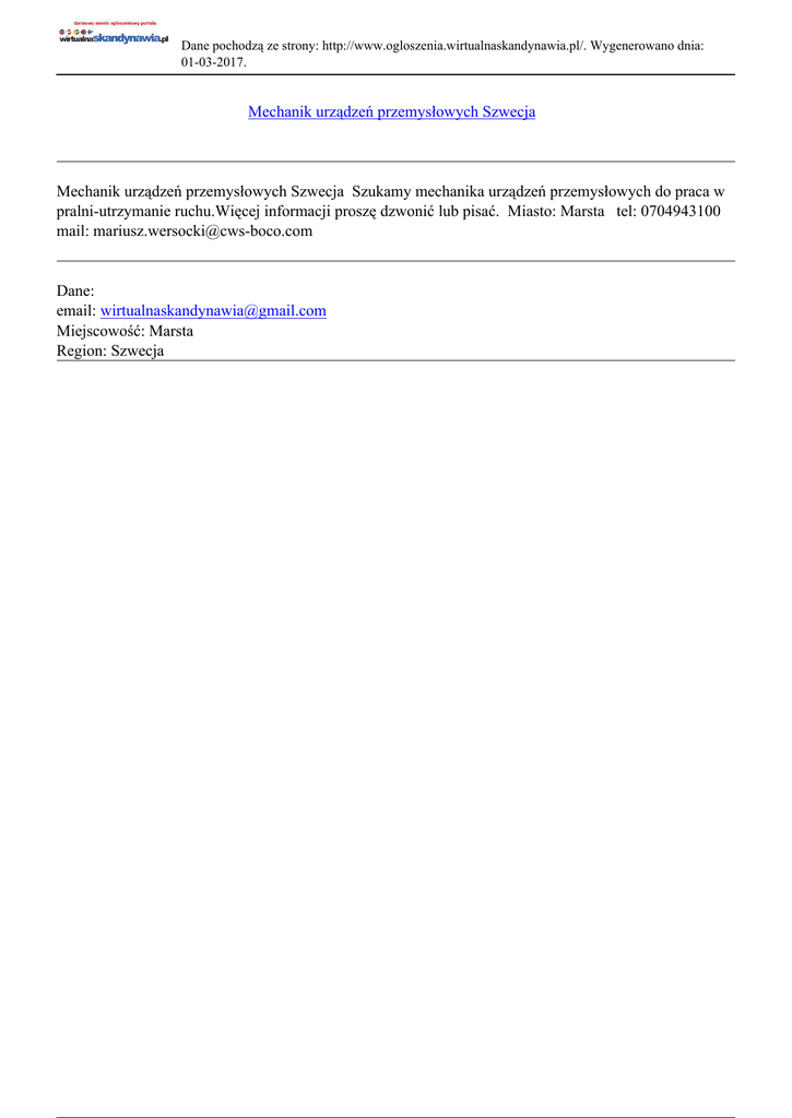 Dane pochodzą ze strony: http://www.ogloszenia.wirtualnaskandynawia.pl/. Wygenerowano dnia: 01-03-2017. Mechanik urządzeń przemysłowych Szwecja Mechanik urządzeń przemysłowych Szwecja Szukamy mechanika urządzeń przemysłowych do praca w pralni-utrzymanie ruchu.Więcej informacji proszę dzwonić lub pisać. Miasto: Marsta tel: 0704943100 mail: [email protected] Dane: email: [email protected] Miejscowość: Marsta Region: Szwecja
