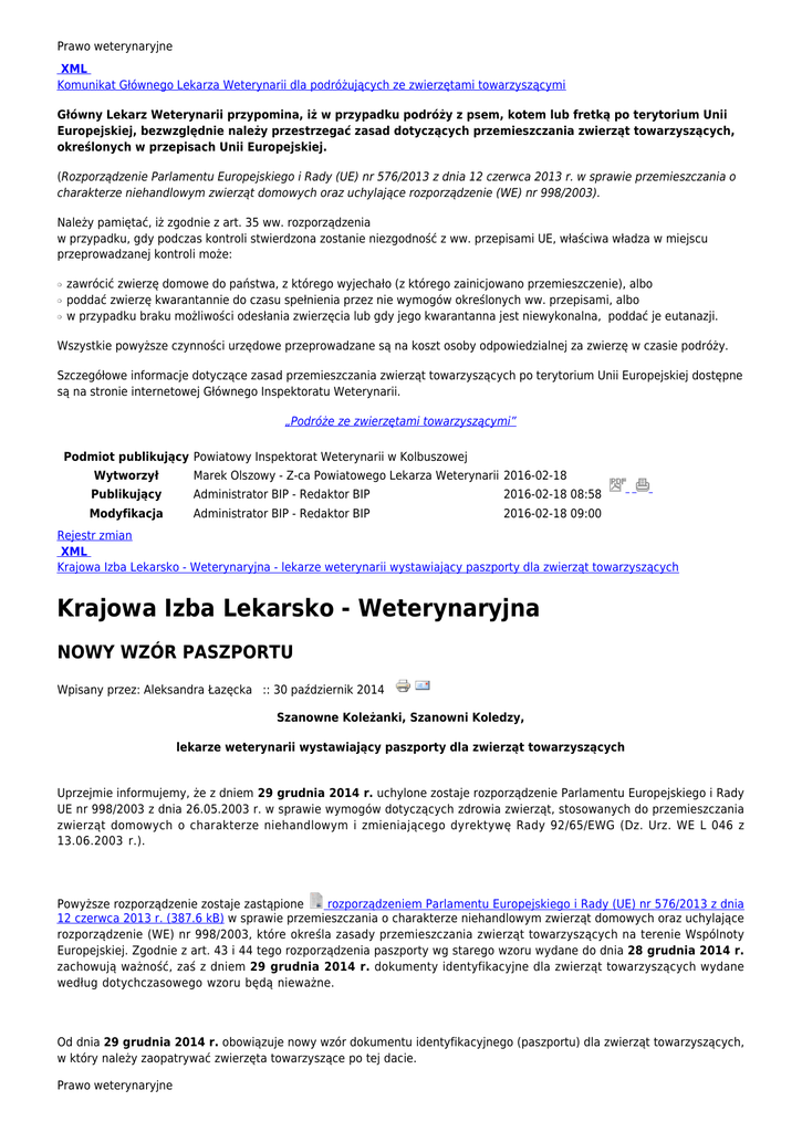Prawo weterynaryjne XML Komunikat Głównego Lekarza Weterynarii dla podróżujących ze zwierzętami towarzyszącymi Główny Lekarz Weterynarii przypomina, iż w przypadku podróży z psem, kotem lub fretką po terytorium Unii Europejskiej, bezwzględnie należy przestrzegać zasad dotyczących przemieszczania zwierząt towarzyszących, określonych w przepisach Unii Europejskiej. (Rozporządzenie Parlamentu Europejskiego i Rady (UE) nr 576/2013 z dnia 12 czerwca 2013 r. w sprawie przemieszczania o charakterze niehandlowym zwierząt domowych oraz uchylające rozporządzenie (WE) nr 998/2003). Należy pamiętać, iż zgodnie z art. 35 ww. rozporządzenia w przypadku, gdy podczas kontroli stwierdzona zostanie niezgodność z ww. przepisami UE, właściwa władza w miejscu przeprowadzanej kontroli może: ❍ ❍ ❍ zawrócić zwierzę domowe do państwa, z którego wyjechało (z którego zainicjowano przemieszczenie), albo poddać zwierzę kwarantannie do czasu spełnienia przez nie wymogów określonych ww. przepisami, albo w przypadku braku możliwości odesłania zwierzęcia lub gdy jego kwarantanna jest niewykonalna, poddać je eutanazji. Wszystkie powyższe czynności urzędowe przeprowadzane są na koszt osoby odpowiedzialnej za zwierzę w czasie podróży. Szczegółowe informacje dotyczące zasad przemieszczania zwierząt towarzyszących po terytorium Unii Europejskiej dostępne są na stronie internetowej Głównego Inspektoratu Weterynarii. „Podróże ze zwierzętami towarzyszącymi” Podmiot publikujący Powiatowy Inspektorat Weterynarii w Kolbuszowej Wytworzył Marek Olszowy - Z-ca Powiatowego Lekarza Weterynarii 2016-02-18 Publikujący Administrator BIP - Redaktor BIP 2016-02-18 08:58 Modyfikacja Administrator BIP - Redaktor BIP 2016-02-18 09:00 Rejestr zmian XML Krajowa Izba Lekarsko - Weterynaryjna - lekarze weterynarii wystawiający paszporty dla zwierząt towarzyszących Krajowa Izba Lekarsko - Weterynaryjna NOWY WZÓR PASZPORTU Wpisany przez: Aleksandra Łazęcka :: 30 październik 2014 Szanowne Koleżanki, Szanowni Koledzy, lekarze weterynarii wystawiający paszporty dla zwierząt towarzyszących Uprzejmie informujemy, że z dniem 29 grudnia 2014 r. uchylone zostaje rozporządzenie Parlamentu Europejskiego i Rady UE nr 998/2003 z dnia 26.05.2003 r. w sprawie wymogów dotyczących zdrowia zwierząt, stosowanych do przemieszczania zwierząt domowych o charakterze niehandlowym i zmieniającego dyrektywę Rady 92/65/EWG (Dz. Urz. WE L 046 z 13.06.2003 r.). Powyższe rozporządzenie zostaje zastąpione rozporządzeniem Parlamentu Europejskiego i Rady (UE) nr 576/2013 z dnia 12 czerwca 2013 r. (387.6 kB) w sprawie przemieszczania o charakterze niehandlowym zwierząt domowych oraz uchylające rozporządzenie (WE) nr 998/2003, które określa zasady przemieszczania zwierząt towarzyszących na terenie Wspólnoty Europejskiej. Zgodnie z art. 43 i 44 tego rozporządzenia paszporty wg starego wzoru wydane do dnia 28 grudnia 2014 r. zachowują ważność, zaś z dniem 29 grudnia 2014 r. dokumenty identyfikacyjne dla zwierząt towarzyszących wydane według dotychczasowego wzoru będą nieważne. Od dnia 29 grudnia 2014 r. obowiązuje nowy wzór dokumentu identyfikacyjnego (paszportu) dla zwierząt towarzyszących, w który należy zaopatrywać zwierzęta towarzyszące po tej dacie. Prawo weterynaryjne Prawo weterynaryjne Nowe druki paszportów będą dostępne po 10 grudnia 2014 roku. Sposób wypełniania nowego paszportu reguluje Rozporządzenie Wykonawcze Komisji (UE) Nr 577/2013 z dnia 28 czerwca 2013 r. (184.36 kB) w sprawie wzorów dokumentów identyfikacyjnych dla przemieszczania o charakterze niehandlowym psów, kotów i fretek, ustanowienia wykazów terytoriów i państw trzecich oraz formatu, szaty graficznej i wymogów językowych dotyczących oświadczeń potwierdzających spełnienie określonych warunków przewidzianych w rozporządzeniu Parlamentu Europejskiego i Rady (UE) nr 576/2013. Załączniki do rozporządzenia: ● ● ● ● ● NOWY WZÓR PASZPORTU - KRAJE UE (7.04 MB) NOWY WZÓR PASZPORTU - KRAJE TRZECIE (7.38 MB) Format, szata graficzna i wymogi językowe dotyczące oświadczeń (721.08 kB) Wzór świadectwa zdrowia zwierząt dla przemieszczania o charakterze niehandlowym psów, kotów lub fretek z terytorium lub państwa trzeciego do państwa członkowskiego zgodnie z art. 5 ust. 1 i 2 rozporządzenia (UE) nr 576/2013 ( 995.14 kB) Pisemne oświadczenie, o którym mowa w art. 25 ust. 3 rozporządzenia (UE) nr 576/2013 (713.72 kB) Zwracamy uwagę, że nowy druk paszportu będzie wyposażony w dodatkowe, samoprzylepne laminaty służące do zabezpieczenia niektórych informacji zawartych w paszporcie zgodnie z cytowanym poniżej rozporządzeniem. Cyt. z rozporządzenia nr 577/2013: „5. Zabezpieczenia: a) po wprowadzeniu wymaganych informacji w sekcji III paszportu stronę pokrywa się przejrzystym samoprzylepnym laminatem; b) jeśli informacje na jednej ze stron paszportu mają postać naklejki, naklejkę tę pokrywa się przejrzystym samoprzylepnym laminatem w przypadku gdy naklejka ta nie ulega samoczynnemu zniszczeniu przy jej usunięciu.” Podmiot publikujący Powiatowy Inspektorat Weterynarii w Kolbuszowej Wytworzył Marek Olszowy - Z-ca Powiatowego Lekarza Weterynarii 2014-11-06 Publikujący Administrator BIP - Redaktor BIP Rejestr zmian Prawo weterynaryjne 2014-11-06 12:36