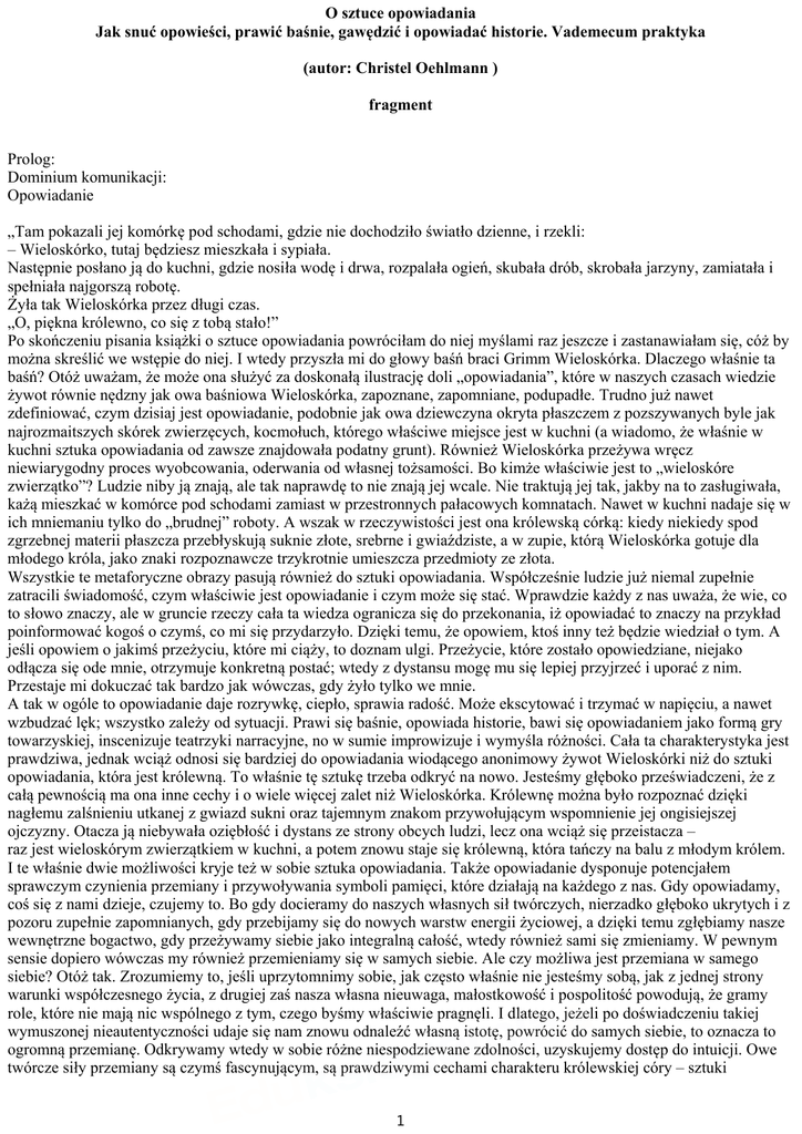 O sztuce opowiadania Jak snuć opowieści, prawić baśnie, gawędzić i opowiadać historie. Vademecum praktyka (autor: Christel Oehlmann ) fragment Prolog: Dominium komunikacji: Opowiadanie „Tam pokazali jej komórkę pod schodami, gdzie nie dochodziło światło dzienne, i rzekli: – Wieloskórko, tutaj będziesz mieszkała i sypiała. Następnie posłano ją do kuchni, gdzie nosiła wodę i drwa, rozpalała ogień, skubała drób, skrobała jarzyny, zamiatała i spełniała najgorszą robotę. Żyła tak Wieloskórka przez długi czas. „O, piękna królewno, co się z tobą stało!” Po skończeniu pisania książki o sztuce opowiadania powróciłam do niej myślami raz jeszcze i zastanawiałam się, cóż by można skreślić we wstępie do niej. I wtedy przyszła mi do głowy baśń braci Grimm Wieloskórka. Dlaczego właśnie ta baśń? Otóż uważam, że może ona służyć za doskonałą ilustrację doli „opowiadania”, które w naszych czasach wiedzie żywot równie nędzny jak owa baśniowa Wieloskórka, zapoznane, zapomniane, podupadłe. Trudno już nawet zdefiniować, czym dzisiaj jest opowiadanie, podobnie jak owa dziewczyna okryta płaszczem z pozszywanych byle jak najrozmaitszych skórek zwierzęcych, kocmołuch, którego właściwe miejsce jest w kuchni (a wiadomo, że właśnie w kuchni sztuka opowiadania od zawsze znajdowała podatny grunt). Również Wieloskórka przeżywa wręcz niewiarygodny proces wyobcowania, oderwania od własnej tożsamości. Bo kimże właściwie jest to „wieloskóre zwierzątko”? Ludzie niby ją znają, ale tak naprawdę to nie znają jej wcale. Nie traktują jej tak, jakby na to zasługiwała, każą mieszkać w komórce pod schodami zamiast w przestronnych pałacowych komnatach. Nawet w kuchni nadaje się w ich mniemaniu tylko do „brudnej” roboty. A wszak w rzeczywistości jest ona królewską córką: kiedy niekiedy spod zgrzebnej materii płaszcza przebłyskują suknie złote, srebrne i gwiaździste, a w zupie, którą Wieloskórka gotuje dla młodego króla, jako znaki rozpoznawcze trzykrotnie umieszcza przedmioty ze złota. Wszystkie te metaforyczne obrazy pasują również do sztuki opowiadania. Współcześnie ludzie już niemal zupełnie zatracili świadomość, czym właściwie jest opowiadanie i czym może się stać. Wprawdzie każdy z nas uważa, że wie, co to słowo znaczy, ale w gruncie rzeczy cała ta wiedza ogranicza się do przekonania, iż opowiadać to znaczy na przykład poinformować kogoś o czymś, co mi się przydarzyło. Dzięki temu, że opowiem, ktoś inny też będzie wiedział o tym. A jeśli opowiem o jakimś przeżyciu, które mi ciąży, to doznam ulgi. Przeżycie, które zostało opowiedziane, niejako odłącza się ode mnie, otrzymuje konkretną postać; wtedy z dystansu mogę mu się lepiej przyjrzeć i uporać z nim. Przestaje mi dokuczać tak bardzo jak wówczas, gdy żyło tylko we mnie. A tak w ogóle to opowiadanie daje rozrywkę, ciepło, sprawia radość. Może ekscytować i trzymać w napięciu, a nawet wzbudzać lęk; wszystko zależy od sytuacji. Prawi się baśnie, opowiada historie, bawi się opowiadaniem jako formą gry towarzyskiej, inscenizuje teatrzyki narracyjne, no w sumie improwizuje i wymyśla różności. Cała ta charakterystyka jest prawdziwa, jednak wciąż odnosi się bardziej do opowiadania wiodącego anonimowy żywot Wieloskórki niż do sztuki opowiadania, która jest królewną. To właśnie tę sztukę trzeba odkryć na nowo. Jesteśmy głęboko przeświadczeni, że z całą pewnością ma ona inne cechy i o wiele więcej zalet niż Wieloskórka. Królewnę można było rozpoznać dzięki nagłemu zalśnieniu utkanej z gwiazd sukni oraz tajemnym znakom przywołującym wspomnienie jej ongisiejszej ojczyzny. Otacza ją niebywała oziębłość i dystans ze strony obcych ludzi, lecz ona wciąż się przeistacza – raz jest wieloskórym zwierzątkiem w kuchni, a potem znowu staje się królewną, która tańczy na balu z młodym królem. I te właśnie dwie możliwości kryje też w sobie sztuka opowiadania. Także opowiadanie dysponuje potencjałem sprawczym czynienia przemiany i przywoływania symboli pamięci, które działają na każdego z nas. Gdy opowiadamy, coś się z nami dzieje, czujemy to. Bo gdy docieramy do naszych własnych sił twórczych, nierzadko głęboko ukrytych i z pozoru zupełnie zapomnianych, gdy przebijamy się do nowych warstw energii życiowej, a dzięki temu zgłębiamy nasze wewnętrzne bogactwo, gdy przeżywamy siebie jako integralną całość, wtedy również sami się zmieniamy. W pewnym sensie dopiero wówczas my również przemieniamy się w samych siebie. Ale czy możliwa jest przemiana w samego siebie? Otóż tak. Zrozumiemy to, jeśli uprzytomnimy sobie, jak często właśnie nie jesteśmy sobą, jak z jednej strony warunki współczesnego życia, z drugiej zaś nasza własna nieuwaga, małostkowość i pospolitość powodują, że gramy role, które nie mają nic wspólnego z tym, czego byśmy właściwie pragnęli. I dlatego, jeżeli po doświadczeniu takiej wymuszonej nieautentyczności udaje się nam znowu odnaleźć własną istotę, powrócić do samych siebie, to oznacza to ogromną przemianę. Odkrywamy wtedy w sobie różne niespodziewane zdolności, uzyskujemy dostęp do intuicji. Owe twórcze siły przemiany są czymś fascynującym, są prawdziwymi cechami charakteru królewskiej córy – sztuki 1 opowiadania. I właśnie te siły są dla mnie szczególnie ważne. Chciałabym pokazać, w jak wielu dziedzinach codziennego życia działają takie siły przemiany i jak można na powrót je w sobie świadomie odnaleźć. Chodzi mi przy tym tylko o opowiadanie ustne, bo tego rodzaju siły i właściwości są powiązane w niewytłumaczalny sposób wyłącznie ze słowem mówionym. Oddziaływa ono bowiem o wiele silniej niż słowo pisane. Słowo mówione oddycha i żyje: porusza nas, jest bezpośrednie i pierwotne. 