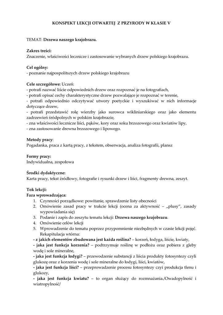 KONSPEKT LEKCJI OTWARTEJ Z PRZYRODY W KLASIE V TEMAT: Drzewa naszego krajobrazu. Zakres treści: Znaczenie, właściwości lecznicze i zastosowanie wybranych drzew polskiego krajobrazu. Cel ogólny: - poznanie najpospolitszych drzew polskiego krajobrazu Cele szczegółowe: Uczeń: - potrafi nazwać liście odpowiednich drzew oraz rozpoznać je na fotografiach, - potrafi opisać cechy charakterystyczne drzew pozwalające je rozpoznać w terenie, - potrafi odpowiednio odczytywać utwory poetyckie i wyszukiwać w nich informacje dotyczące drzew, - potrafi przedstawić rolę wierzby jako surowca wikliniarskiego oraz jako elementu zadrzewień śródpolnych w polskim krajobrazie, - zna właściwości lecznicze liści, pąków, kory oraz soku brzozowego oraz kwiatów lipy, - zna zastosowanie drewna brzozowego i lipowego. Metody pracy: Pogadanka, praca z kartą pracy, z tekstem, obserwacja, analiza fotografii, plansz Formy pracy: Indywidualna, zespołowa Środki dydaktyczne: Karta pracy, tekst źródłowy, fotografie i rysunki drzew i liści, fragmenty drewna, zeszyt. Tok lekcji: Faza wprowadzająca: 1. Czynności porządkowe: powitanie, sprawdzenie listy obecności 2. Omówienie zasad pracy w trakcie lekcji (ocena za aktywność – „plusy”, zasady wypowiadania się) 3. Podanie i zapis do zeszytu tematu lekcji: Drzewa naszego krajobrazu. 4. Omówienie celów lekcji 5. Wprowadzenie do tematu poprzez przypomnienie niezbędnych w czasie lekcji pojęć. Rekapitulacja wtórna: - z jakich elementów zbudowana jest każda roślina? – korzeń, łodyga, liście, kwiaty, - jaka jest funkcja korzenia? – podtrzymuje roślinę w podłożu oraz pobiera z gleby wodę i sole mineralne, - jaka jest funkcja łodygi? – przewodzenie substancji z liścia produkty fotosyntezy czyli glukozę oraz z korzenia wodę i sole mineralne do łodygi, liści, kwiatów, - jaka jest funkcja liści? – przeprowadzenie procesu fotosyntezy czyi produkcja tlenu i glukozy, - jaka jest funkcja kwiatu? – to organ służący do rozmnażania./Owadopylność i wiatropylność/ Faza realizacyjna: 1. Przypomnienie tematu lekcji. 2. Uczniowie odczytują wiersze: Wprowadzenie: „Drzewa” L. Staffa 3. Obserwacja liści, gałęzi brzozy, lipy i wierzby oraz przeglądanie zdjęć tych drzew i ich rozpoznawanie. 4. Rysunki drzew w stanie bezlistnym i opisywanie cech charakterystycznych tych drzew. BURZA MÓZGÓW. Uzupełnianie zadanie 1 w karcie pracy. Brzoza – wysmukła, białokora, liście małe, wiosną jasnozielone, kwiaty niepozorne./wiatropylne/. Zdobi polany leśne, drogi, w parkach rozjaśnia ciemne grupy drzew. Lipa – rozłożysta, o szerokiej koronie, liście sercowate o niesymetrycznej podstawie, małe, ale liczne białożółte kwiaty, bardzo mocno pachnące i obficie wydają nektar, do którego zlatują się roje pszczół./owadopylne/ Wierzba – gruby, często spróchniały pień, kwiaty w baziach rozwijają się przed liśćmi, korona głowiastego kształtu. Sadzona przy drogach i zabudowaniach wiejskich./wiatropylna/ 5. Następnie uczniowie odczytują wiersz T. Lenartowicza „Lipa” –Piotr Iwaniec. Wiersz wywołuje sielską wizję polskiej wsi. Lipa jest drzewem sadzonym przy chatach, malowniczo otaczały niegdyś kościółki. Od tych drzew pochodzą nazay miejscowości: Lipka, Lipno, Lipce oraz nazwiska: Lipiński, Lipski, Lipowicz. Z drzewa lipowego Wit Stwosz wyrzeźbił Ołtarz w Kościele Mariackim w Krakowie(fotografia), z drewna lipowego rzeźbiono ozdoby, wytwarzano sprzęty, np. skrzypce. Lipę sadzono też dla upamiętniania ważnych wydarzeń w życiu rodziny np. narodziny, ślub czy wydarzenia związane z historią. Skąd pochodzi najsłynniejsza lipa, z której natchnienie czerpał Jan Kochanowski? – z Czarnolasu 6. I oto fragment utworu mistrza Jana 7. Lipę opisywał również Juliusz Słowacki 8. Wspominał ją również Adam Mickiewicz w „Panu Tadeuszu” 9. Leopold Staff tak pisał o brzozie 10. Inna poetka – Maria Pawlikowska – Jasnorzewska pisała o wierzbie 11. Po krótkiej podróży w poezję zastanówmy się, jaka rolę spełniają wierzby jako surowiec wikliniarski oraz jako element zadrzewień śródpolnych w polskim krajobrazie rolniczym: - zmniejszenie deficytu wody, - wyhamowanie wiatru, - ograniczenie erozji gleby, - oczyszczanie wód poprzez absorbowanie i przetwarzanie związków chemicznych stosowanych w rolnictwie, - dogodne warunki życia dla różnych zwierząt np. owadów, ptaków, ssaków, płazów 12. Uczniowie pracując w dwójkach z tekstami źródłowymi przygotowują informacje dotyczące: a) właściwości leczniczych liści, pąków, kory i soku brzozowego (osoby które otrzymały tekst źródłowy pt .”Brzoza”) b) właściwości lecznicze kwiatów lipy, (osoby które otrzymały tekst źródłowy pt ”Lipa”) c) zastosowanie drewna brzozowego, lipowego oraz wierzbowego(osoby które otrzymały tekst źródłowy pt .”Wierzba”) Czas pracy 5 minut 13. Analiza: Brzoza – Liście działają moczopędnie, oczyszczająco, napotnie. Pączki usuwają zastój gruczołów chłonnych, kora oczyszcza (np krew), ma właściwości trawienne i przeciwgorączkowe, świeży sok działa przeczyszczająco, usuwa kamicę moczową. Świeży sok z liści brzozy pobudza przesączanie w kłębkach nerkowych i zwiększa wydalanie szkodliwych produktów przemiany materii oraz potu i żółci. Huba brzozowa a właściwie czyr brzozowy działa przeciwzapalnie, przeciwbakteryjnie, wzmacniająco, zwiększa odporność organizmu i zwalcza wirusy szkodliwe dla organizmu, ma więc znaczenie przeciwnowotworowe, zmniejsza niebezpieczeństwo przerzutów. Odwary podawane doustnie działają przeciwzapalnie na błony śluzowe przewodu pokarmowego, a w irygacjach - na błony śluzowe narządów rodnych. Przetwory z brzozy muszą być dawkowane przez lekarza ! Wskazania lecznicze: wewnętrznie: obrzęk pochodzenia sercowo-nerkowego, skąpomocz, nadmiar związków azotowych we krwi daj