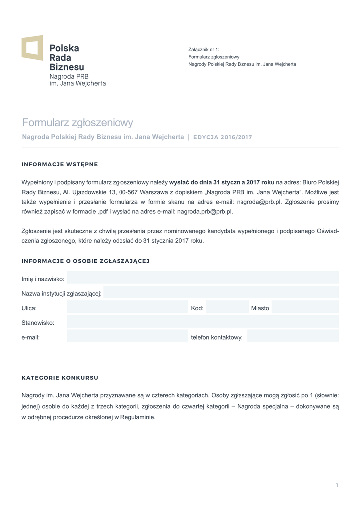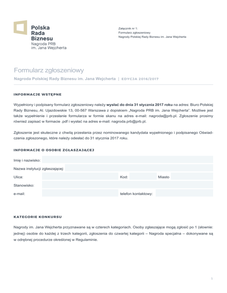 Załącznik nr 1: Formularz zgłoszeniowy Nagrody Polskiej Rady Biznesu im. Jana Wejcherta Formularz zgłoszeniowy Nagroda Polskiej Rady Biznesu im. Jana Wejcherta | ED YC JA 2 016 / 2 017 IN FORM A C J E W STĘP NE Wypełniony i podpisany formularz zgłoszeniowy należy wysłać do dnia 31 stycznia 2017 roku na adres: Biuro Polskiej Rady Biznesu, Al. Ujazdowskie 13, 00-567 Warszawa z dopiskiem „Nagroda PRB im. Jana Wejcherta”. Możliwe jest także wypełnienie i przesłanie formularza w formie skanu na adres e-mail: [email protected]. Zgłoszenie prosimy również zapisać w formacie .pdf i wysłać na adres e-mail: [email protected]. Zgłoszenie jest skuteczne z chwilą przesłania przez nominowanego kandydata wypełnionego i podpisanego Oświadczenia zgłoszonego, które należy odesłać do 31 stycznia 2017 roku. INFORM AC J E O OS OB I E Z GŁ A S Z A JĄ CE J Imię i nazwisko: Nazwa instytucji zgłaszającej: Ulica: Kod: Miasto Stanowisko: e-mail: telefon kontaktowy: KATEG ORI E K ON K U R S U Nagrody im. Jana Wejcherta przyznawane są w czterech kategoriach. Osoby zgłaszające mogą zgłosić po 1 (słownie: jednej) osobie do każdej z trzech kategorii, zgłoszenia do czwartej kategorii – Nagroda specjalna – dokonywane są w odrębnej procedurze określonej w Regulaminie. 1 KATEGORIA SUKCES Osoby kwalifikujące się do tej kategorii powinny spełniać niektóre z poniższych warunków: zrealizowanie lub sfinalizowanie w roku poprzedzającym spektakularnego projektu, który wywarł trwały wpływ na rynek; budowa (lub rewitalizacja) nowej silnej marki (marek); wypromowanie polskiej marki za granicą; spektakularny wzrost udziału w rynku; bezkonkurencyjność zrealizowanego projektu; umasowienie dostępu do nowych technologii bądź innych rozwiązań biznesowych. KATEGORIA WIZJA I INNOWACJE Osoby kwalifikujące się do tej kategorii powinny wyróżniać się zastosowaniem odważnej, nowej i niekonwencjonalnej idei biznesowej, a w szczególności: skuteczne i konsekwentne dążenie do realizacji własnej wizji biznesowej wbrew rynkowemu sceptycyzmowi; wprowadzenie na rynek nowatorskich rozwiązań, usług, produktów mogących wpływać pozytywnie na budowanie pozycji firmy wobec konkurencji; odwaga w podejmowaniu skutecznych choć niestandardowych decyzji biznesowych mających trwały, pozytywny wpływ na funkcjonowanie i rozwój przedsiębiorstw; zdolność i determinacja przezwyciężania kryzysów. KATEGORIA DZIAŁALNOŚĆ SPOŁECZNA Osoby kwalifikujące się do tej kategorii powinny wykorzystywać dostępny kapitał, wiedzę lub pozycję społeczną, i będąc uczestnikiem życia gospodarczego, politycznego i kulturalnego, powinny realizować działania społeczne i filantropijne, w szczególności: aktywne zaangażowanie kapitałowe lub osobowe w działalność charytatywną lub edukacyjną; skuteczne promowanie idei i rozwiązań wpływających na poprawę życia społecznego; zaangażowanie w przełamywanie społecznego tabu w celu poprawy standardów i jakości życia publicznego (np. przeprowadzenie akcji edukacyjnych); aktywności wspierające rozwój społeczności lokalnych. 2 KATEGORIA KATEGORIA SUKCES SUKCES Informacje o osobie zgłaszanej w kategorii Sukces INFORM AC J E O OS O B I E Z GŁ A S Z A NE J W K ATE GORII S UKCE S Imię i nazwisko: Nazwa firmy/instytucji: Branża: Stanowisko: Ulica: Kod: e-mail: telefon kontaktowy: Miasto U ZAS ADN I EN I E Z GŁ O S Z E NI A W K A T E GO R II S UKCE S Mając na uwadze kryteria i wyznaczniki kategorii Sukces, prosimy poniżej o wyczerpujące, pisemne uzasadnienie ilustrujące działania i osiągnięcia osoby zgłaszanej w tej kategorii. Rekomendowana objętość uzasadnienia to około 1 (słownie: jednej) strony A4. Aby zwiększyć szanse kandydata, prosimy o podanie w uzasadnieniu następujących danych: przychody (ostatnie trzy lata); zysk/strata netto na działalności operacyjnej (ostatnie trzy lata); zatrudnienie; struktura własności przedsiębiorstwa bądź jednostki operacyjnej reprezentowanej przez kandydata. Podanie ww. danych w uzasadnieniu nie jest obligatoryjne. Przekazywane informacje, w tym informacje finansowe, wykorzystywane są jedynie na potrzeby Konkursu i utrzymywane są w tajemnicy. 3 KATEGORIA SUKCES TREŚĆ UZASA DN I E NI A : 4 KATEGORIA KATEGORIA WIZJA I INNOWACJE WIZJA I INNOWACJE Informacje o osobie zgłaszanej w kategorii Wizja i Innowacje INFORM AC J E O OS O B I E Z GŁ A S Z A NE J W K ATE GORII W IZ JA I INNOW ACJE Imię i nazwisko: Nazwa firmy/instytucji: Branża: Stanowisko: Ulica: Kod: e-mail: telefon kontaktowy: Miasto U ZAS ADN I EN I E Z GŁ O S Z E NI A W K A T E GO R II W IZ JA I INNOW ACJE Mając na uwadze kryteria i wyznaczniki kategorii Wizja i Innowacje, prosimy o wyczerpujące, pisemne uzasadnienie ilustrujące działania i osiągnięcia osoby zgłaszanej w tej kategorii. Rekomendowana objętość uzasadnienia to około 1 (słownie: jednej) strony A4. Aby zwiększyć szanse kandydata, prosimy o podanie w uzasadnieniu następujących danych: przychody (ostatnie trzy lata); zysk/strata netto oraz na działalności operacyjnej (ostatnie trzy lata); zatrudnienie; struktura własności przedsiębiorstwa bądź jednostki operacyjnej reprezentowanej przez kandydata. Podanie ww. danych w uzasadnieniu nie jest obligatoryjne. Przekazywane informacje, w tym informacje finansowe, wykorzystywane są jedynie na potrzeby Konkursu i utrzymywane są w tajemnicy. 5 KATEGORIA WIZJA I INNOWACJE TREŚĆ UZASA DN I E NI A : 6 KATEGORIA KATEGORIA DZIAŁALNOŚĆ SPOŁECZNA DZIAŁALNOŚĆ SPOŁECZNA Informacje o osobie zgłaszanej w kategorii Działalność Społeczna INFORM AC J E O OS O B I E Z GŁ A S Z A NE J W K ATE GORII DZ IAŁ ALNOŚ Ć S POŁE CZ NA Imię i nazwisko: Nazwa firmy/instytucji: Branża: Stanowisko: Ulica: Kod: e-mail: telefon kontaktowy: Miasto U ZAS ADN I EN I E Z GŁ O S Z E NI A W K A T E GO R II DZ IAŁALNOŚ Ć S POŁ E CZ NA Mając na uwadze kryteria i wyznaczniki