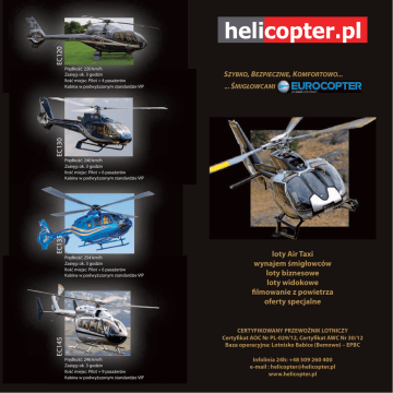 EC120 SZYBKO, BEZPIECZNIE, KOMFORTOWO... ... ŚMIGŁOWCAMI EC130 Prędkość: 220 km/h Zasięg: ok. 3 godzin Ilość miejsc: Pilot + 4 pasażerów Kabina w podwyższonym standardzie VIP EC135 Prędkość: 240 km/h Zasięg: ok. 3 godzin Ilość miejsc: Pilot + 6 pasażerów Kabina w podwyższonym standardzie VIP Prędkość: 254 km/h Zasięg: ok. 3 godzin Ilość miejsc: Pilot + 6 pasażerów Kabina w podwyższonym standardzie VIP loty Air Taxi wynajem śmigłowców loty biznesowe loty widokowe filmowanie z powietrza oferty specjalne EC145 CERTYFIKOWANY PRZEWOŹNIK LOTNICZY Certyfikat AOC Nr PL-029/12, Certyfikat AWC Nr 30/12 Baza operacyjna: Lotnisko Babice (Bemowo) – EPBC Prędkość: 246 km/h Zasięg: ok. 3 godzin Ilość miejsc: Pilot + 9 pasażerów Kabina w podwyższonym standardzie VIP Infolinia 24h: +48 509 260 400 e-mail : [email protected] www.helicopter.pl Helicopter.pl Firma Helicopter.pl powstała w odpowiedzi na zwiększające się zapotrzebowanie na wynajem śmigłowców oraz świadczenie usług indywidualnego transportu śmigłowcowego w Polsce. Helicopter.pl jest częścią grupy Heli Invest, która od ponad 10 lat świadczy kompleksowe usługi lotnicze na polskim rynku. Helicopter.pl posiada główną bazę w Warszawie oraz liczną flotę śmigłowców, dzięki czemu jesteśmy liderem usług transportu śmigłowcowego w Polsce. Współpracując z Helicopter.pl macie Państwo pewność, że loty wykonywane są przez oficjalnego operatora lotniczego, spełniającego najsurowsze wymagania stawiane przez Europejską Agencję Bezpieczeństwa Lotniczego (EASA) oraz Urząd Lotnictwa Cywilnego (ULC). Oferta Zaoszczędź czas dzięki startom z okolic Twojego biura lub domu. Skorzystaj ze śmigłowca i zrelaksuj się wiedząc, że nie będziesz miał problemów z komunikacją drogową, gdyż śmigłowiec zapewnia najszybszy i najwydajniejszy transport dla biznesu, rekreacji, prestiżu. Oparty na profesjonalnej kadrze, Helicopter.pl oferuje wydajne i przyjazne usługi sprawiając, że charter śmigłowca realizowany jest bez zakłóceń i problemów. Helicopter.pl realizuje loty śmigłowcami Eurocopter, które charakteryzują się najwyższymi standardami bezpieczeństwa, nowoczesnym designem oraz najwyższym w swojej klasie komfortem. Organizujemy: – loty Air Taxi – wynajem śmigłowców – loty biznesowe – loty widokowe – filmowanie z powietrza – oferty specjalne: loty do kurortów wypoczynkowych, zaręczyny w powietrzu, udział w eventach lub imprezach firmowych Celem Helicopter.pl jest zapewnienie szybkiego, elastycznego, a przede wszystkim bezpiecznego transportu dla naszych klientów oraz ich gości. Zadzwoń na naszą infolinię + 48 509 260 400 lub odwiedź www.helicopter.pl